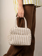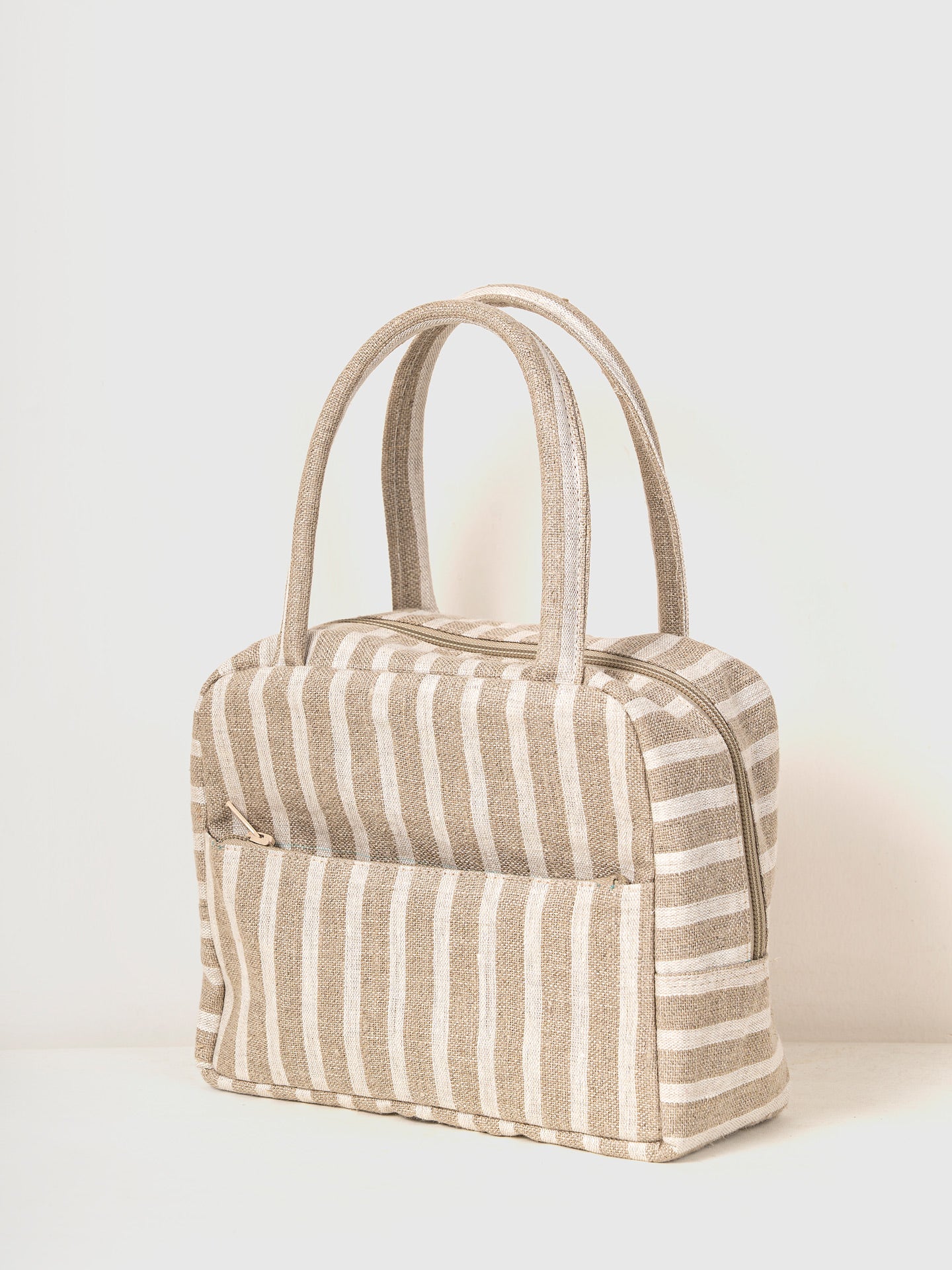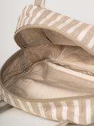 A classic striped tote in earthy beige and white tones, exuding minimal elegance. Its structured silhouette, front pocket, and zip closure make it practical for work, travel, or everyday use. A timeless piece that pairs well with any outfit.