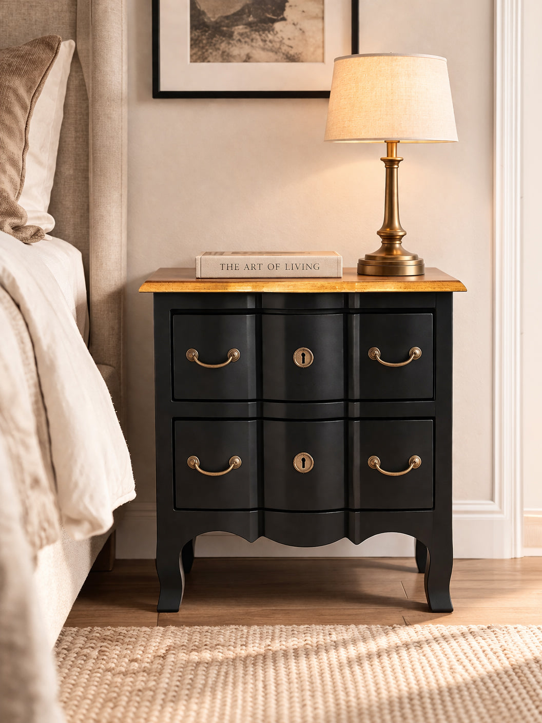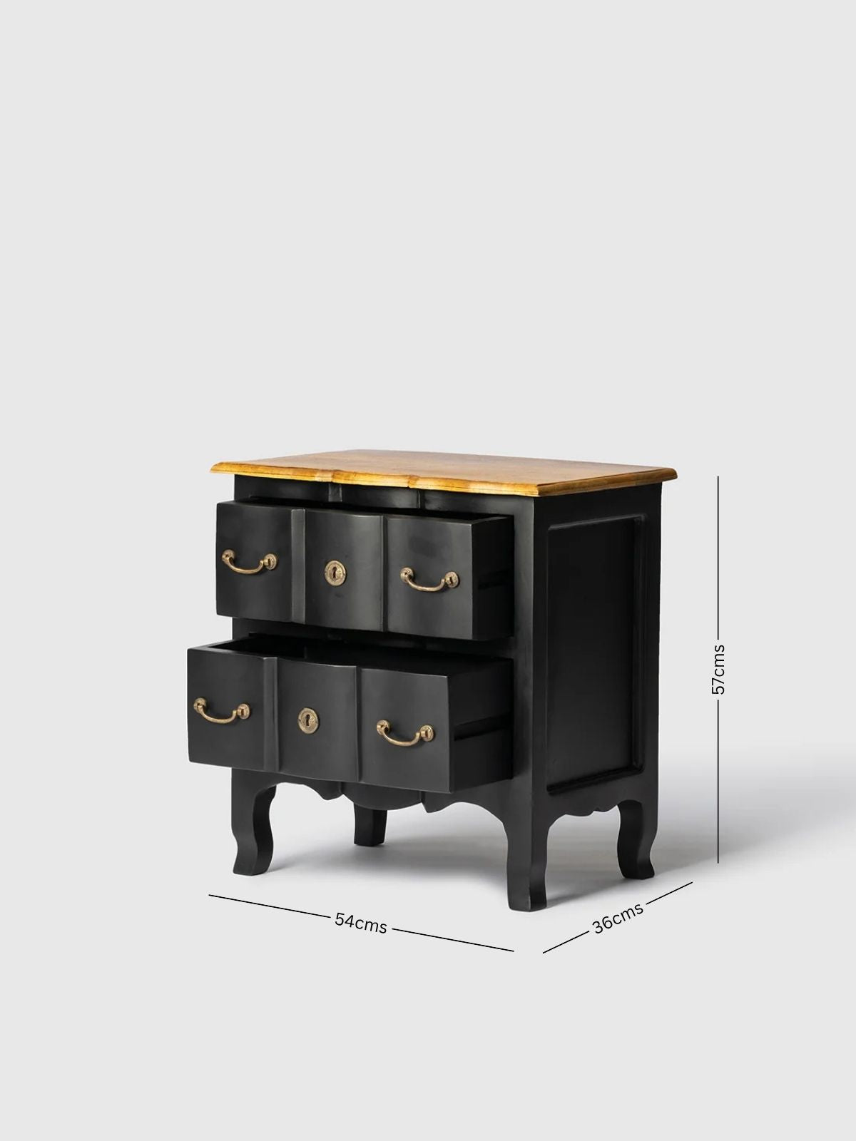 Designed with a sense of classic charm, the Chelvies Wooden Side Table features a beautifully shaped wooden structure complemented by delicate brass handles. The gently curved legs lend a graceful silhouette, while the multiple drawers offer convenient storage for essentials. Ideal as a bedside or accent table, it balances decorative elegance with everyday practicality.