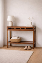 The Komorebi Wooden Side Table is a thoughtfully crafted accent piece that blends simplicity with natural charm. Made from solid wood, the table features a clean rectangular form with subtle detailing along the top rail that adds character without overwhelming the design. Its open lower shelf provides convenient space for books, décor, or everyday essentials. Compact yet functional, this wooden side table fits beautifully beside a sofa, armchair, or bed, bringing warmth, practicality, and timeless style to modern living spaces.