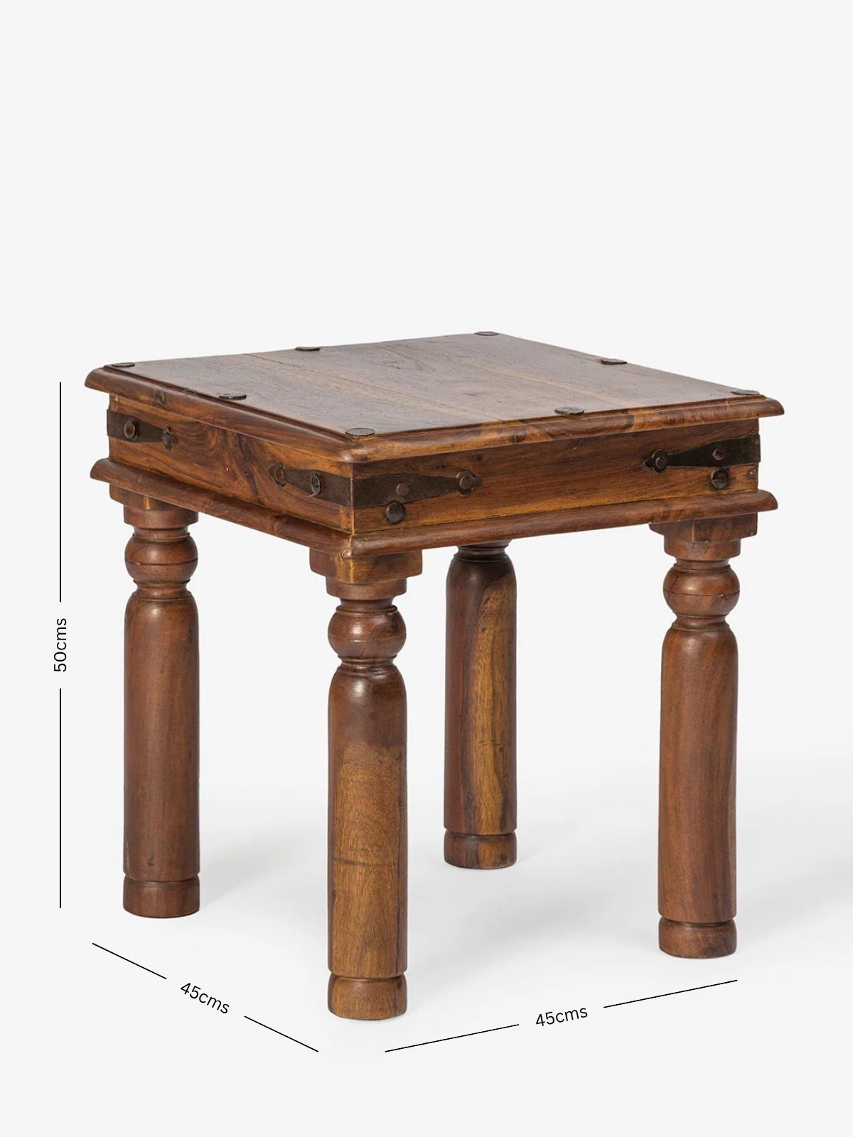 Handcrafted Wooden Side Table exudes timeless elegance with its deep, rich brown finish and intricately carved legs. The square top is complemented by metal rivet accents, adding a touch of vintage sophistication. Ideal for enhancing any room decor, it seamlessly blends style and functionality, making it a standout statement piece.