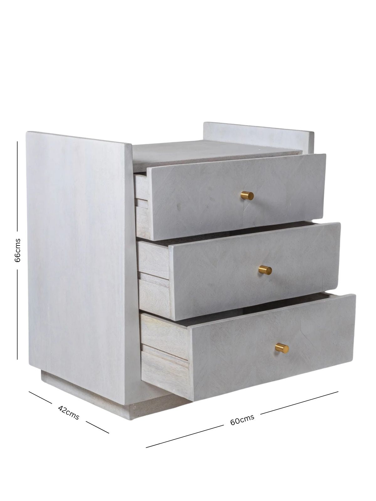 A contemporary three-drawer chest with a minimalist design, featuring a subtle chevron pattern and gold knobs. Crafted for elegance and functionality, this piece complements modern interiors while providing ample storage.