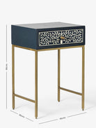 Truett Side Table, visually a very delicate and intricate piece of art is a perfect example of beauty and functionality. It features a floral bone inlay pattern on the drawer front, with gold legs for a touch of luxury.