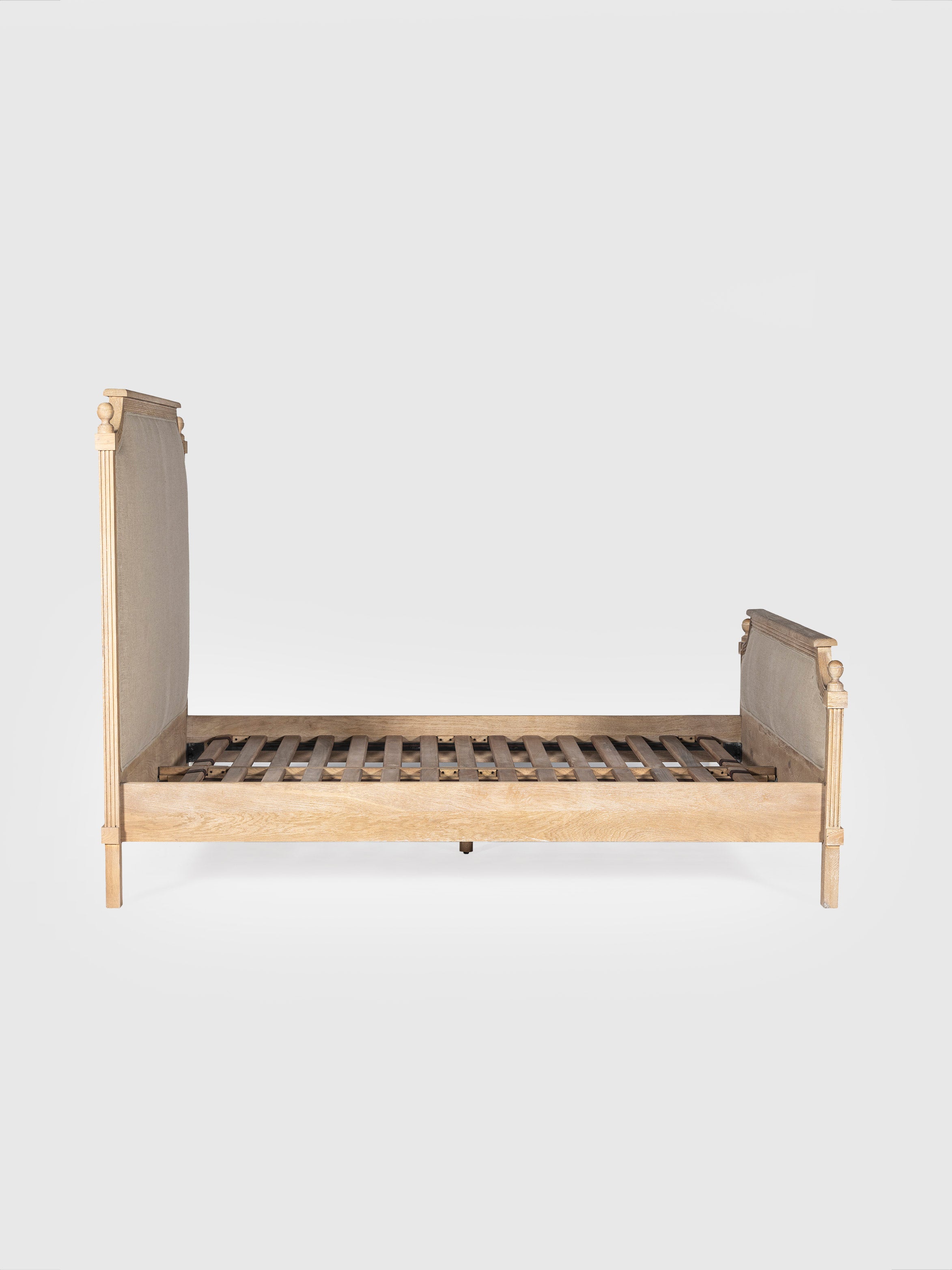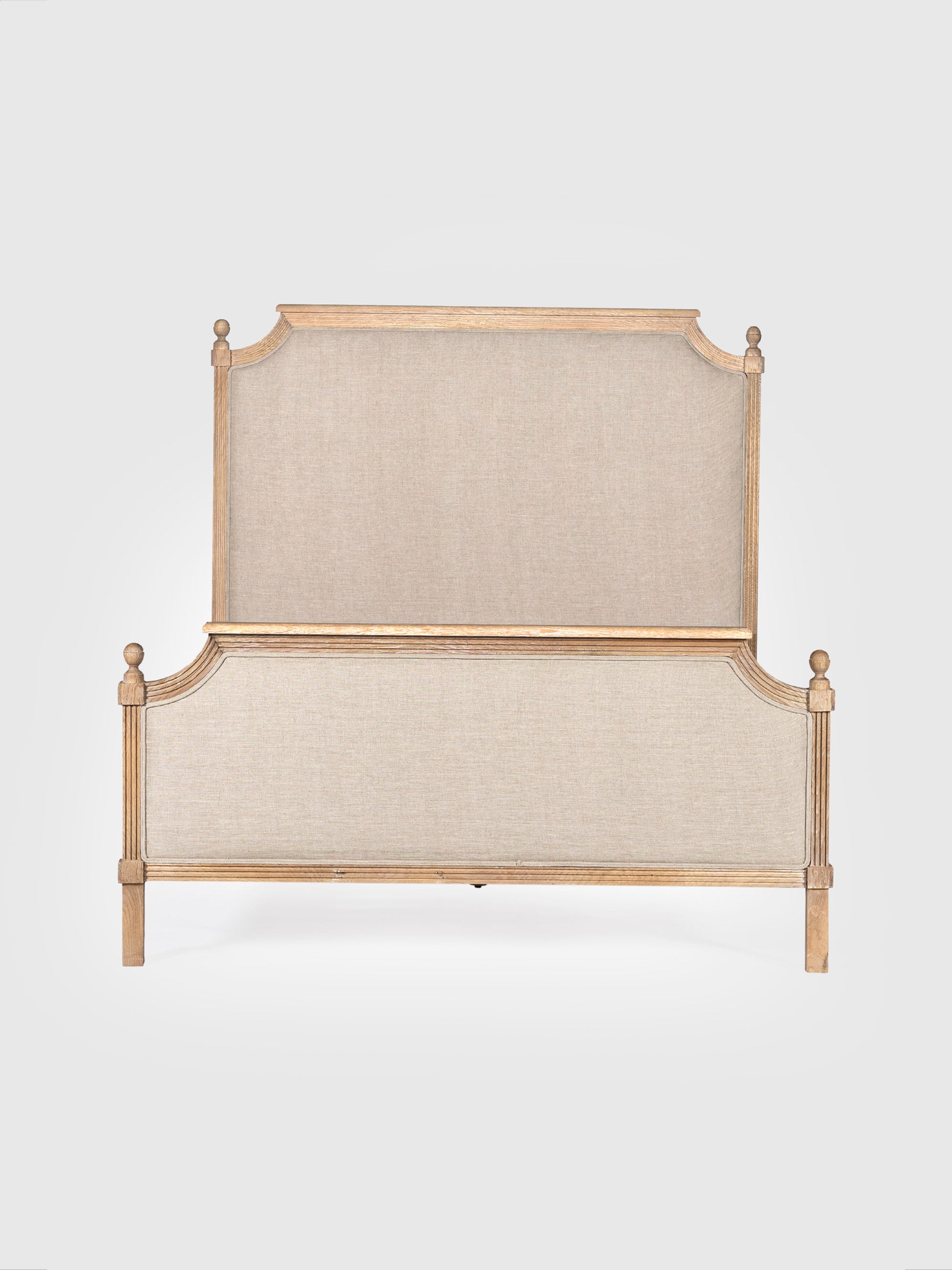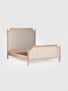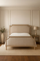This oak wood bed exudes timeless elegance with its refined craftsmanship and natural charm. Featuring a beautifully carved frame with a warm oak finish, it pairs durability with understated sophistication. The upholstered panels in a soft, neutral fabric add comfort while enhancing its classic appeal. Decorative finials and graceful detailing highlight its traditional design. Perfect for creating a cozy yet elegant bedroom, this bed blends seamlessly with both vintage and modern interiors.