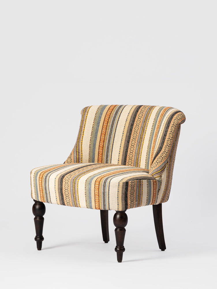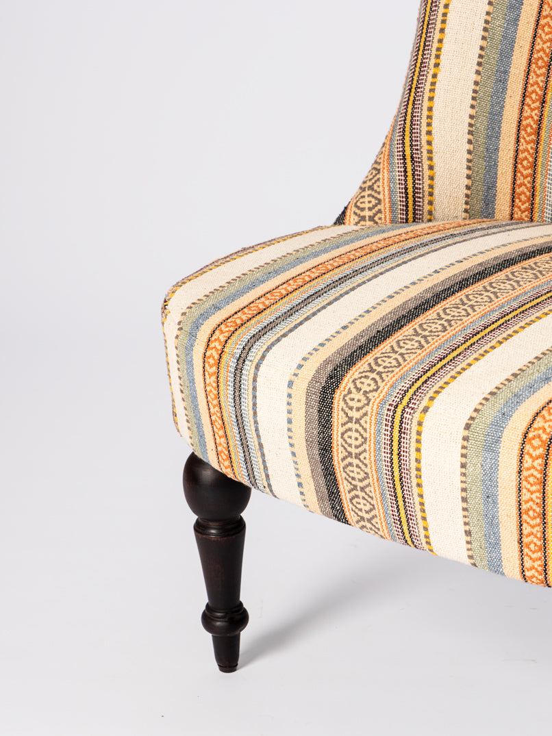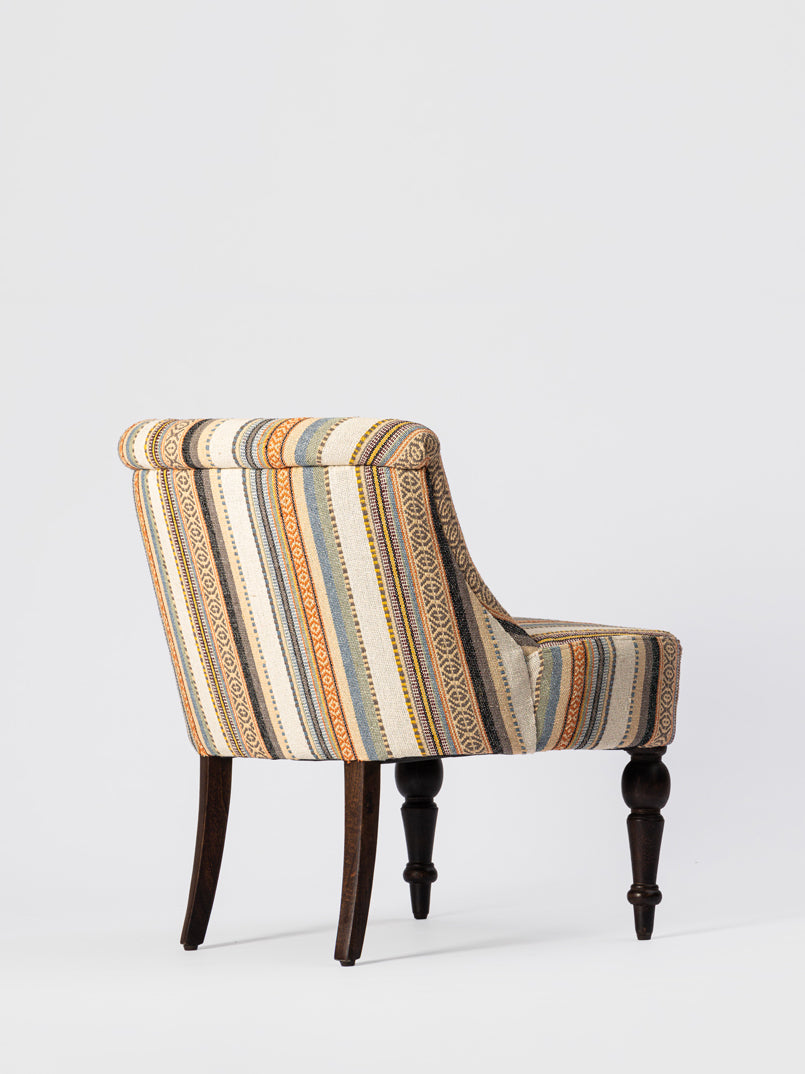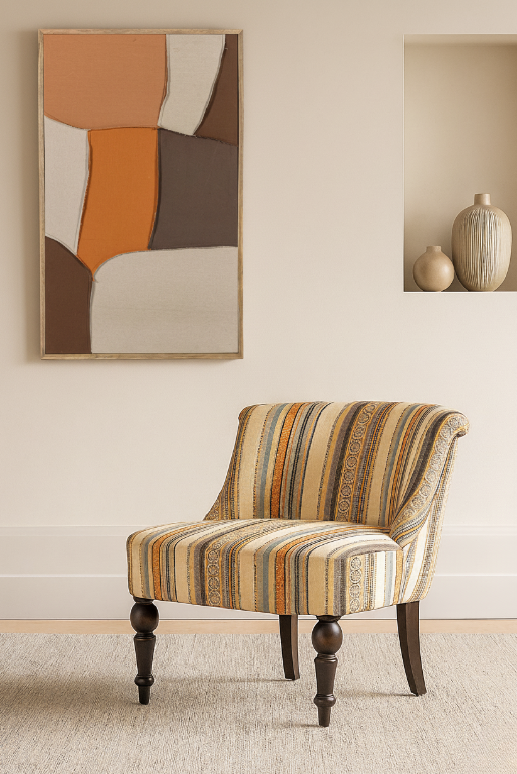 Bring rustic elegance to your space with the Granira Wooden Upholstered Chair. Featuring a solid wooden frame and carved legs, it is upholstered in striped fabric with earthy tones that reflect artisanal beauty. Its cushioned seating ensures comfort, while the compact silhouette makes it versatile for small or large spaces. Ideal for cozy lounges, stylish bedrooms, or eclectic corners, Granira offers a mix of durability and charm. A perfect addition for homes that celebrate character.