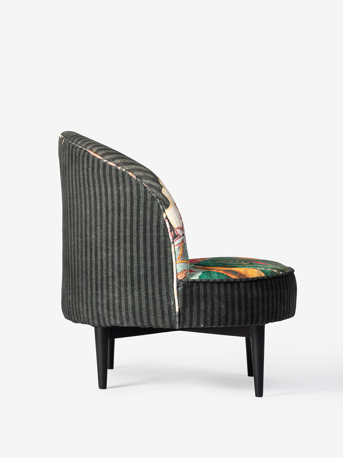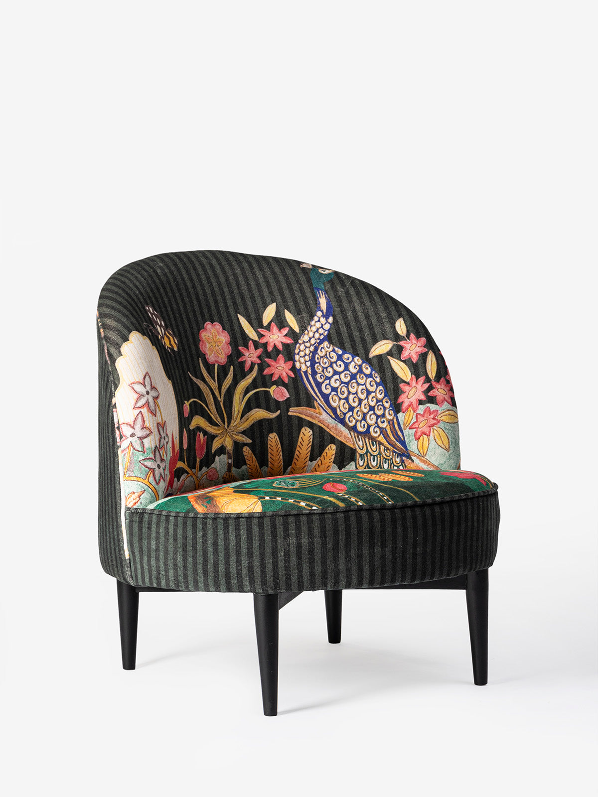 This stunning Paunj Chair showcases a luxurious printed velvet fabric adorned with vibrant peacock and floral motifs on a deep, dark backdrop. Its striking design and plush seating make it an ideal statement piece for enhancing the ambiance of any space.