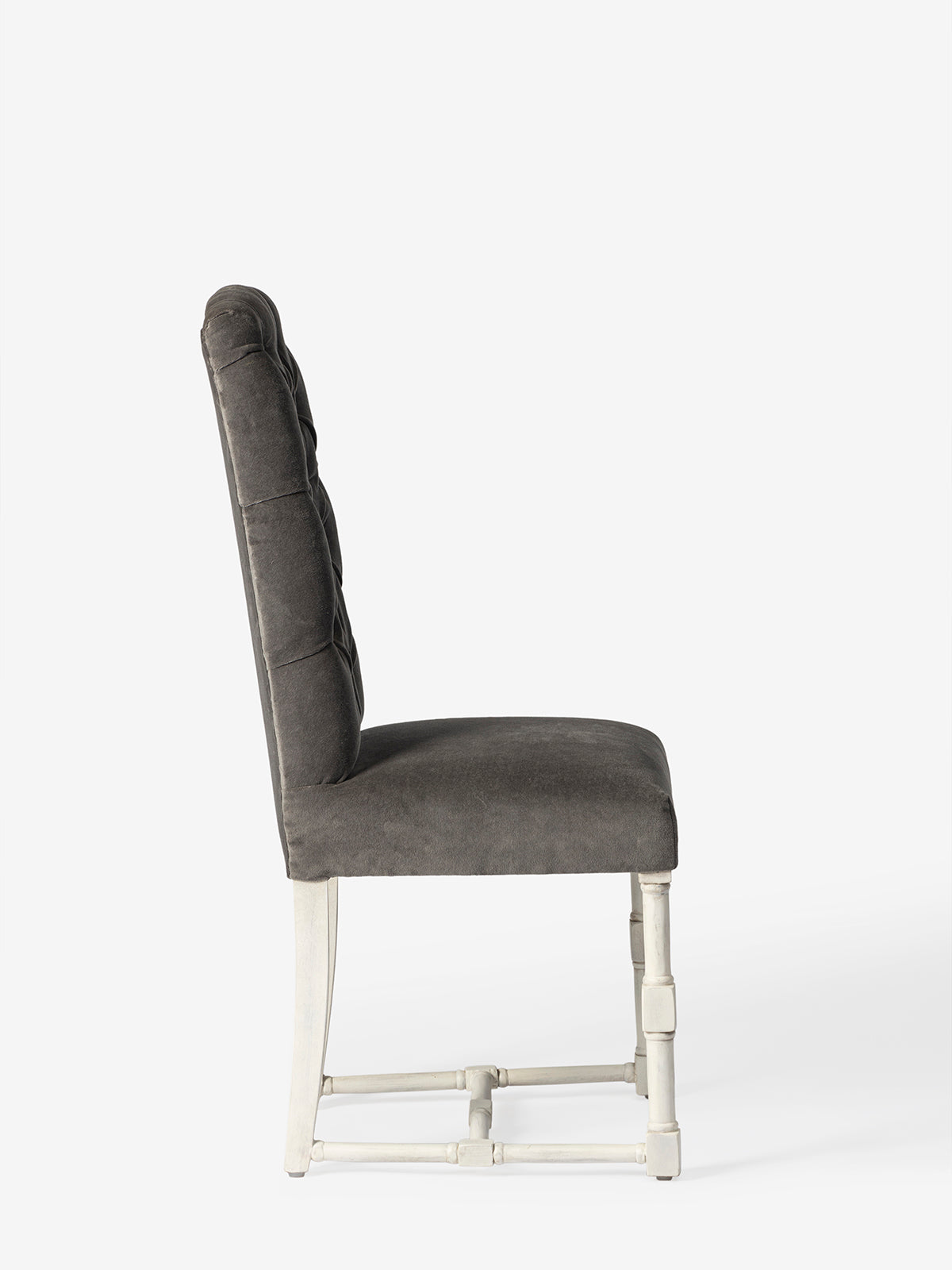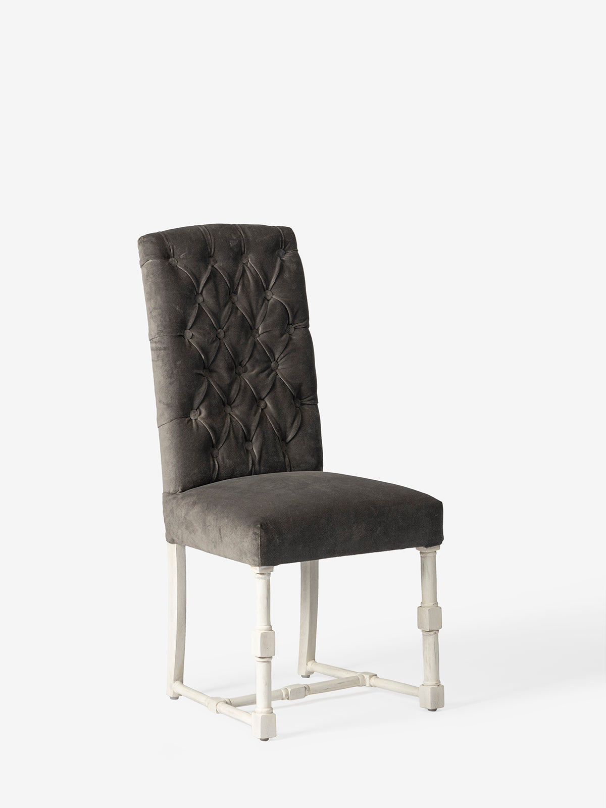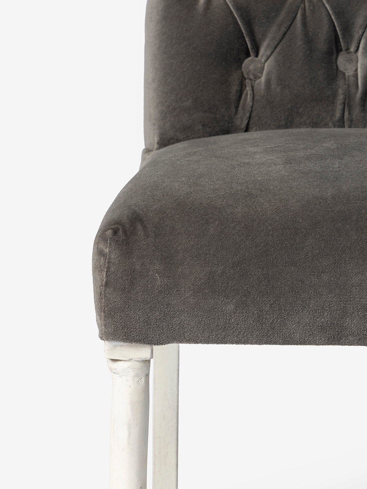 Our Zuko chair features a plush, tufted backrest upholstered in luxurious charcoal velvet, offering both comfort and sophistication. The chair's legs are crafted from mango wood, finished in a distressed white tone, providing a timeless, rustic charm. Ideal for dining rooms or living spaces, it seamlessly blends classic style with modern flair.