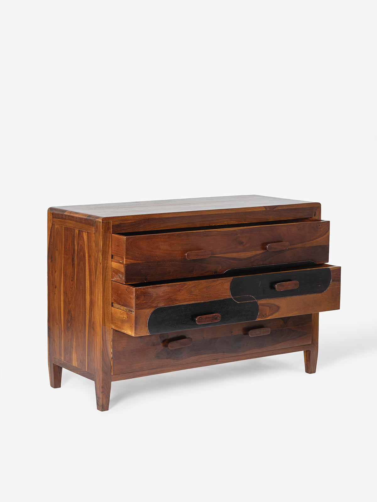 Elevate your storage with this distinctive rustic wooden chest. Featuring three spacious drawers with unique oval cutout handles and a striking two-tone design, this piece blends natural warmth with modern flair. Perfect for adding character and functionality to any room.