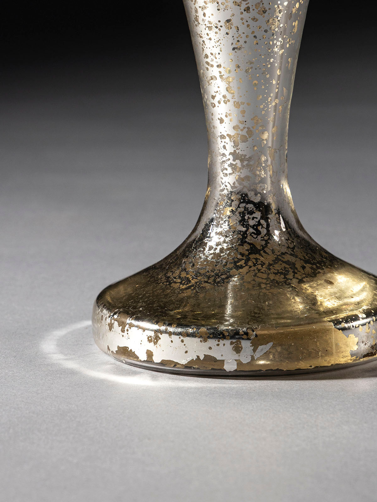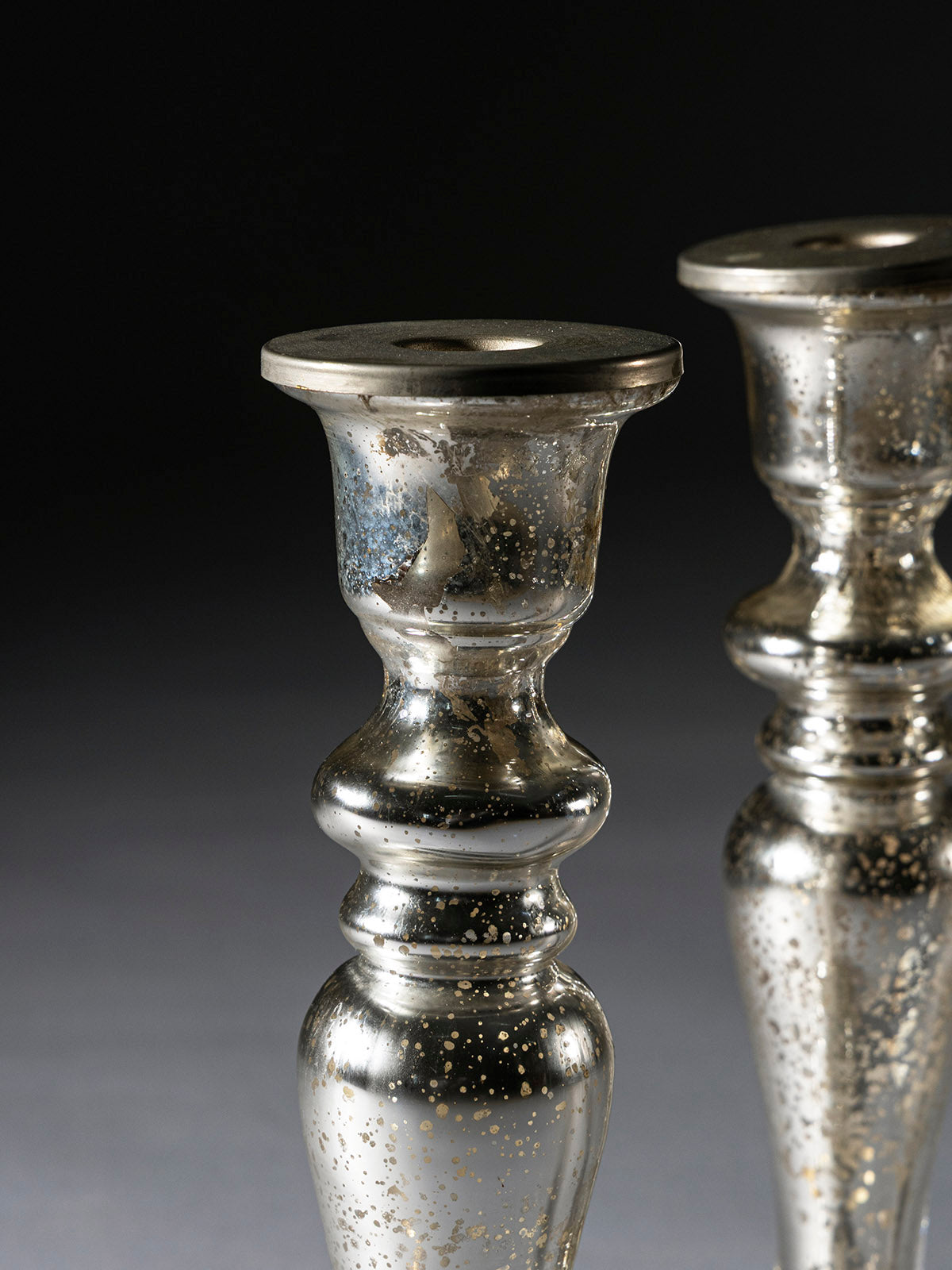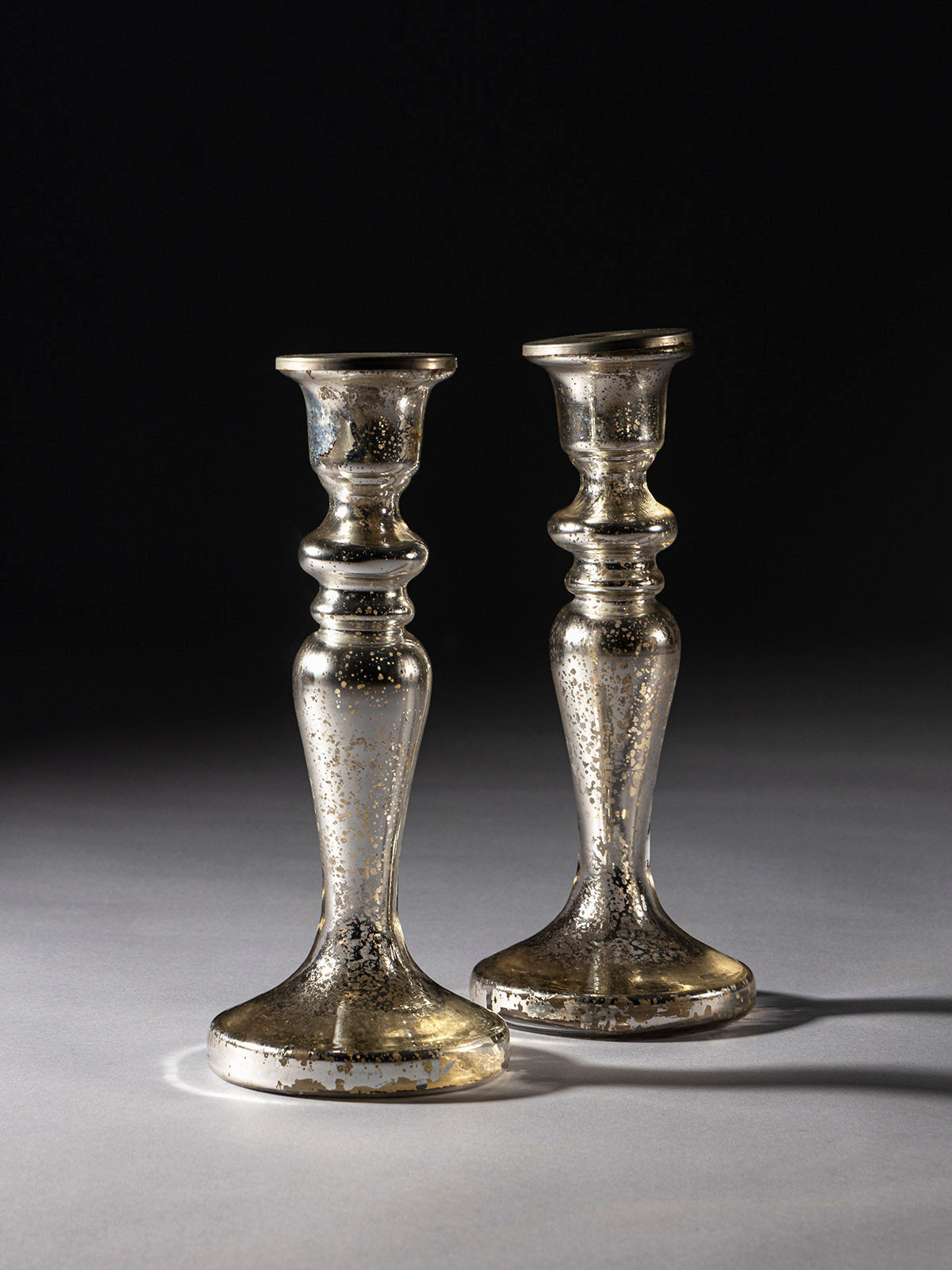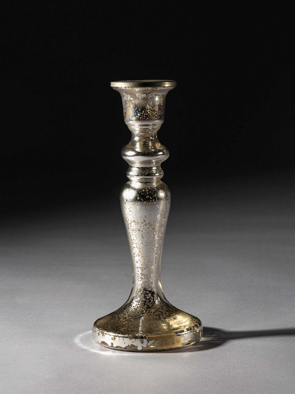 The Chantara Glass Candle Holder is a handcrafted mercury glass accent with a tall, sculpted silhouette that commands attention. Its antique finish glimmers under candlelight, creating a warm and inviting glow. Perfect for dining tables, mantels, or grand festive arrangements, it adds height and elegance to any display. A timeless piece that blends artistry with sophistication, making simple candles look extraordinary in any setting.