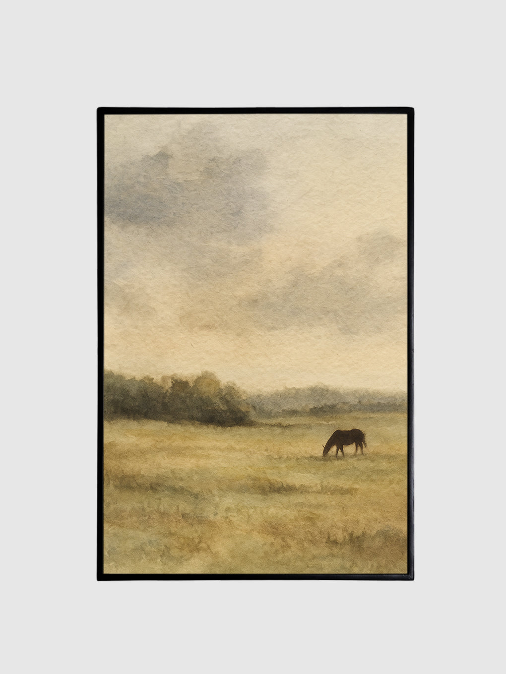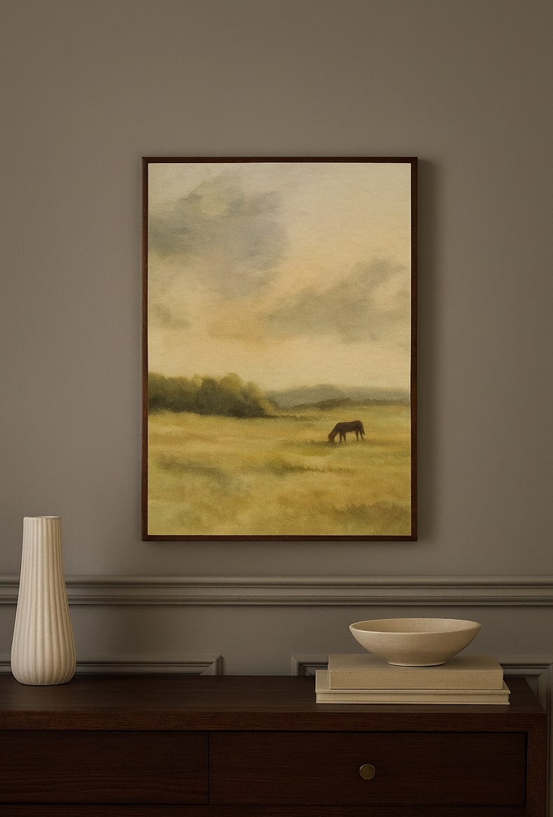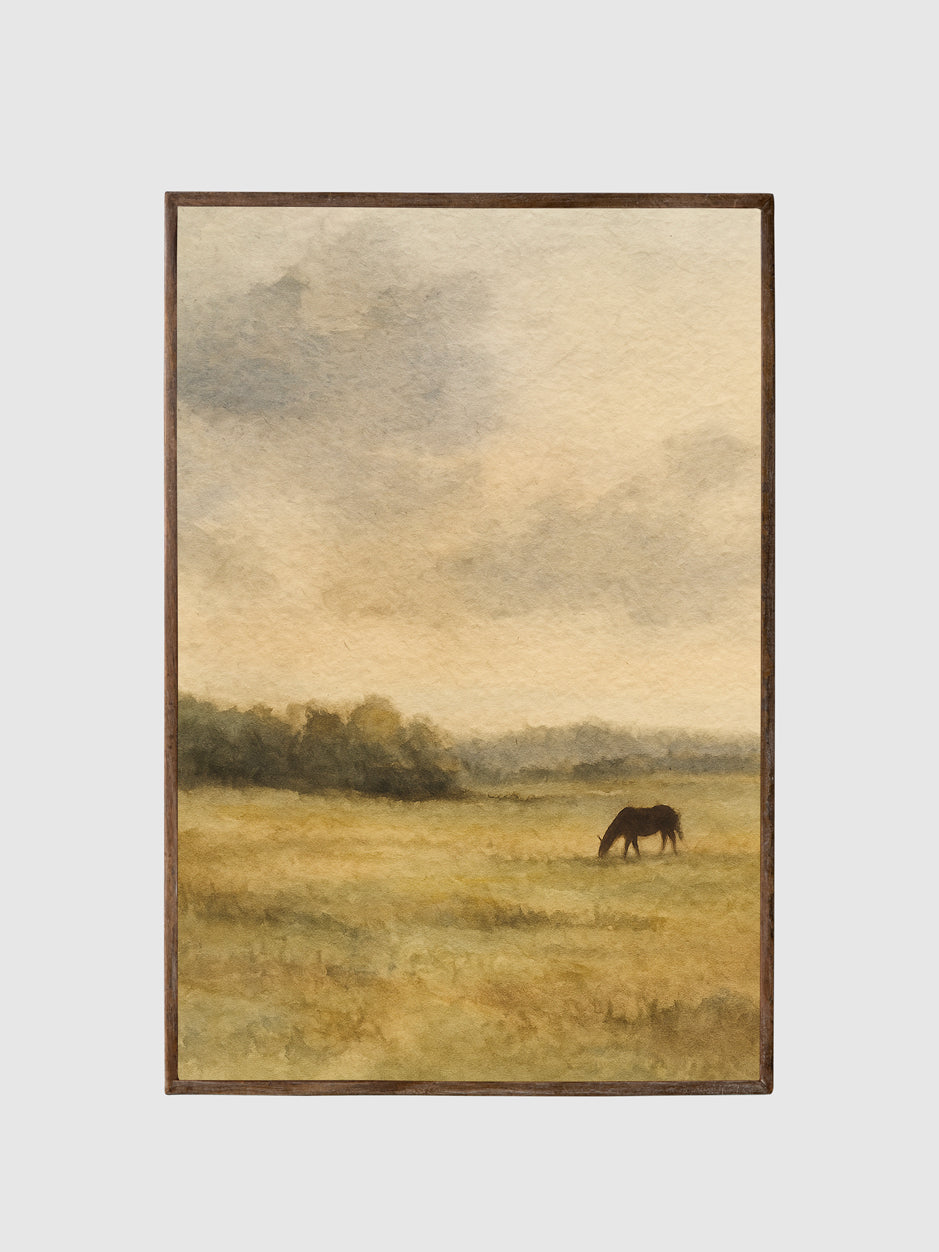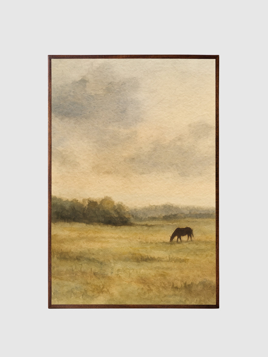Countryside Calm captures the timeless peace of pastoral life, where a lone horse grazes quietly in open meadows beneath a soft, expansive sky. This printed canvas artwork evokes the stillness and simplicity of the countryside, reminding us of the grounding beauty found in nature’s gentle rhythms.