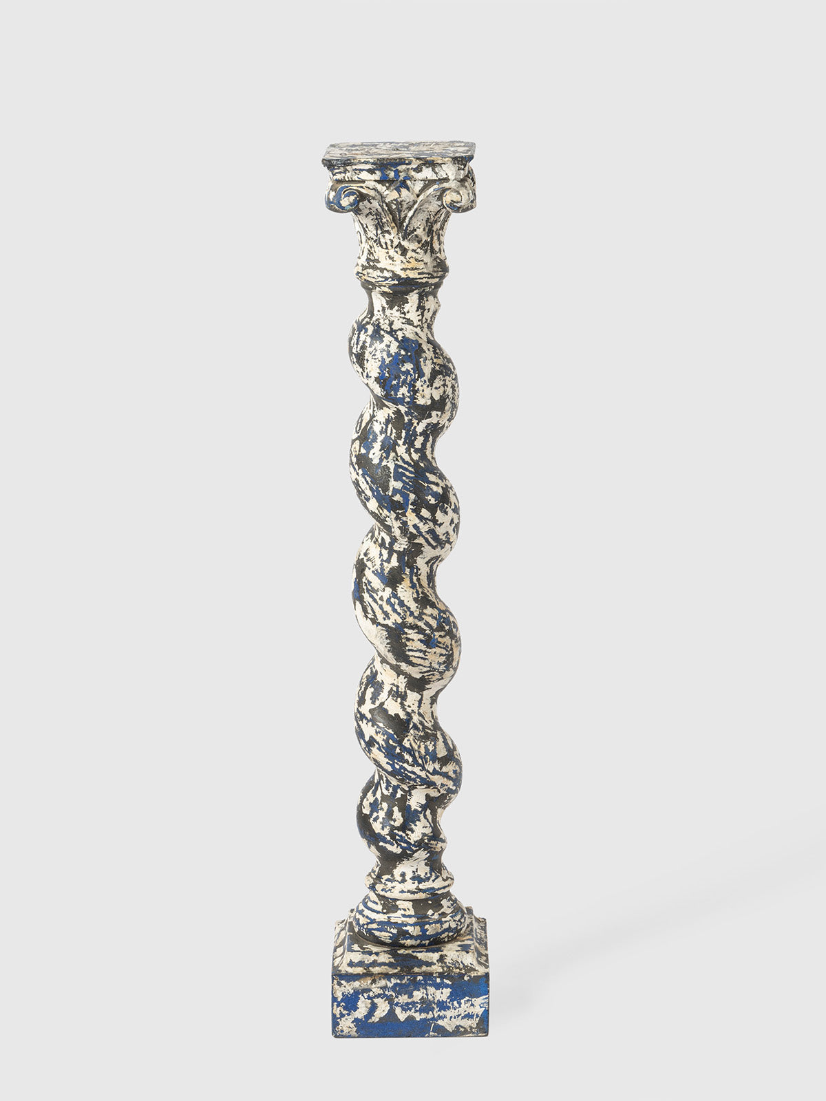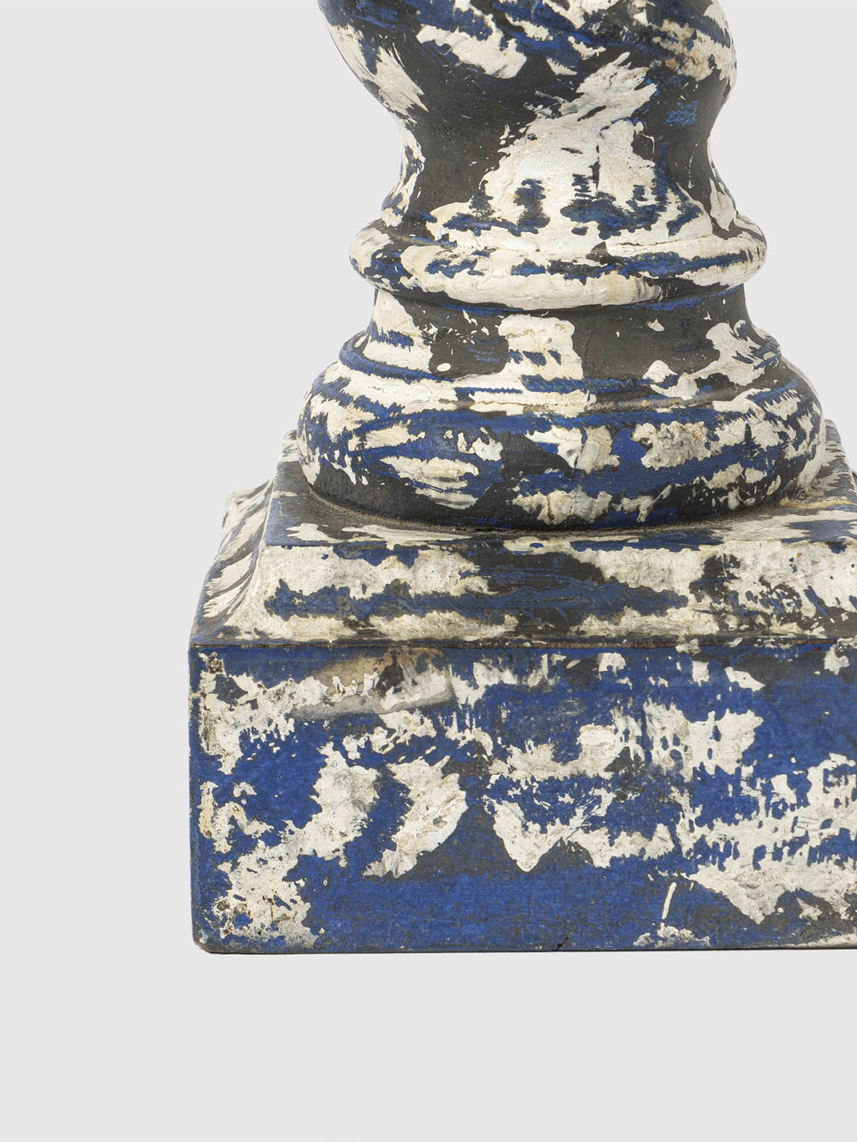 Striking Ericeira wooden candle holder features an intricately twisted design with a distressed blue and white finish. The ornate top and sturdy square base exude vintage charm. Ideal for adding character and elegance to any setting, it’s a beautiful blend of rustic and classical aesthetics for timeless appeal.