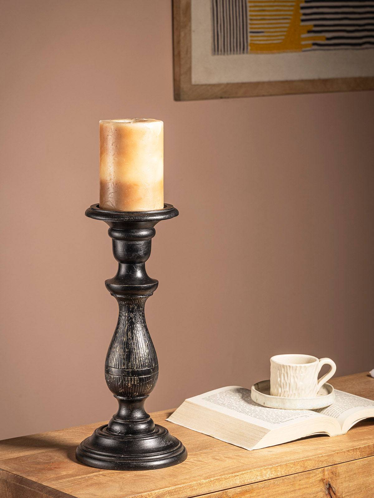 Enhance your decor with this handcrafted wooden candle holder, showcasing a dark finish and timeless design. Its sturdy build and classic silhouette make it a versatile accessory for any setting. Perfect for adding warmth and charm to your living spaces, whether used as a centerpiece or accent piece.
