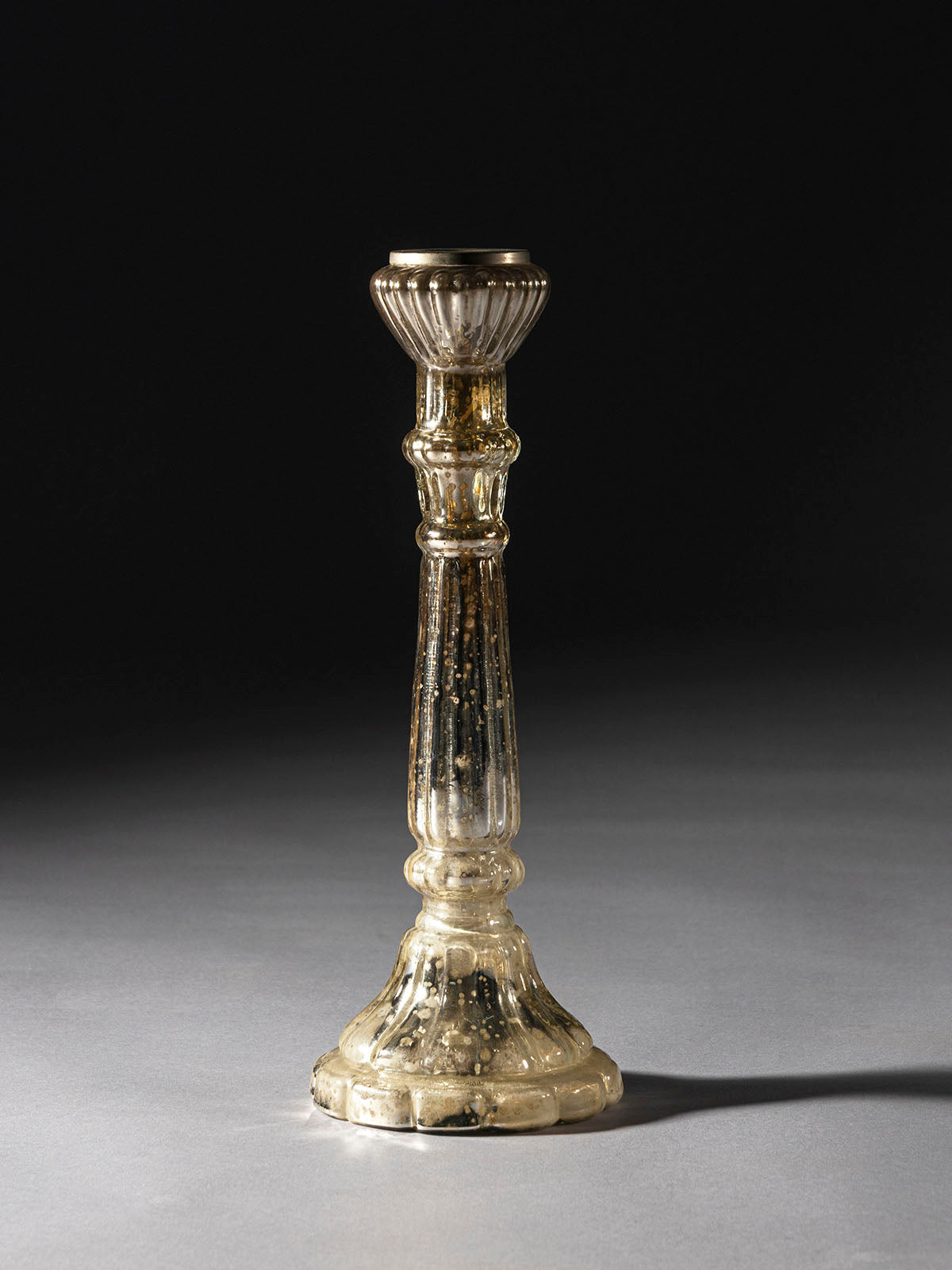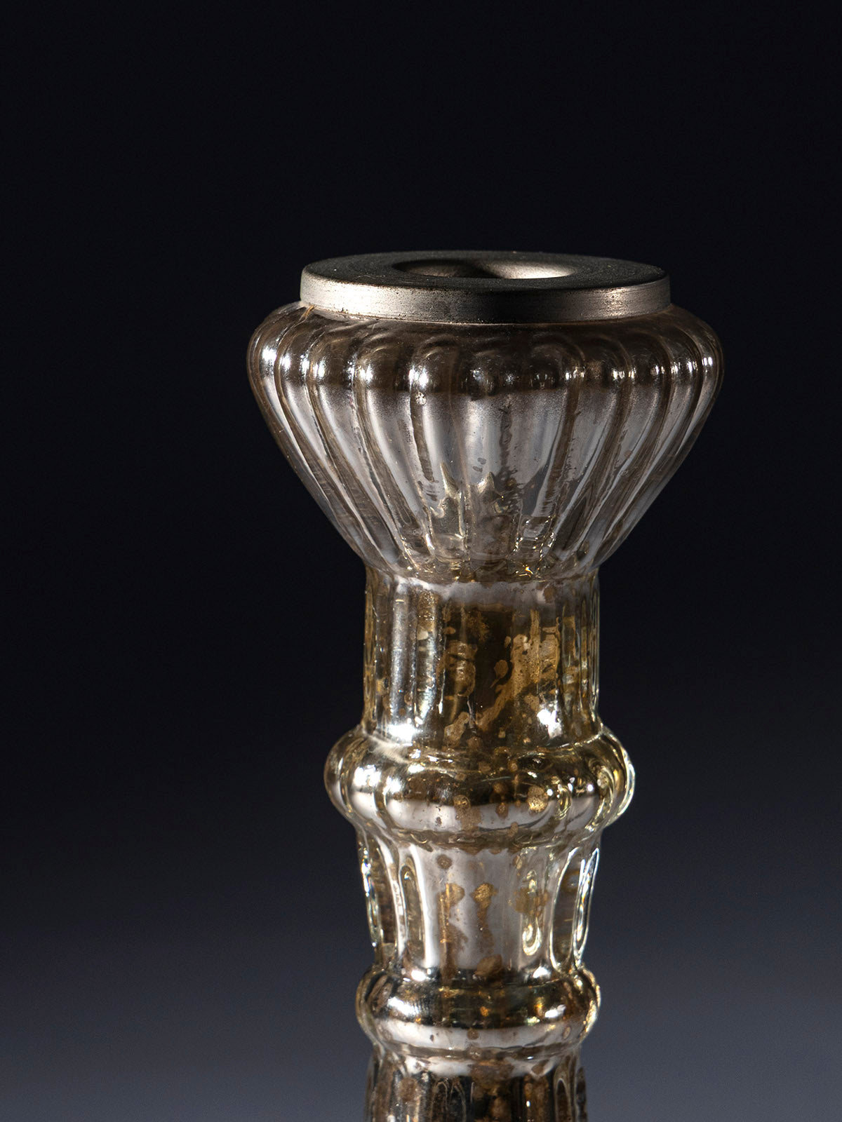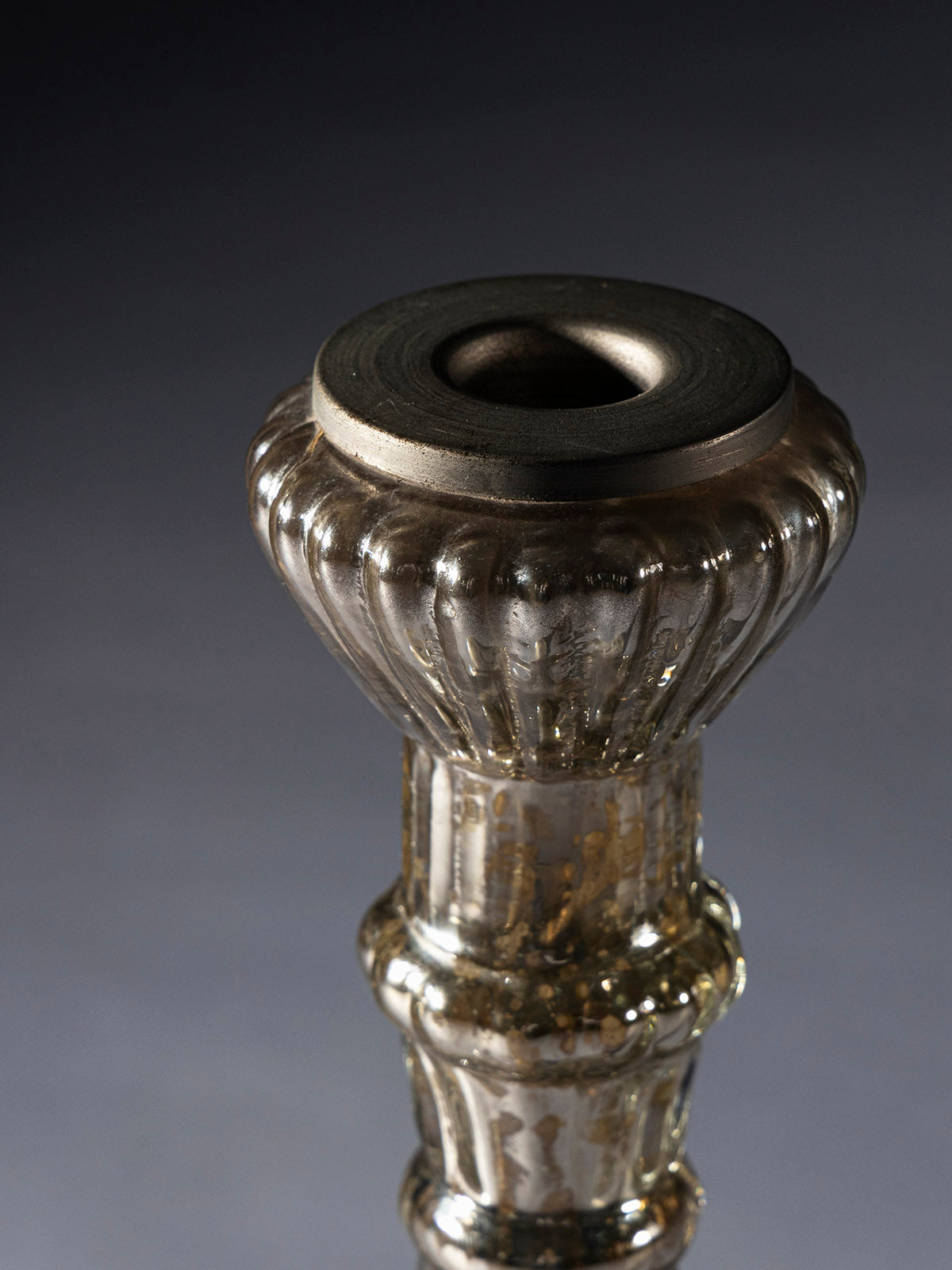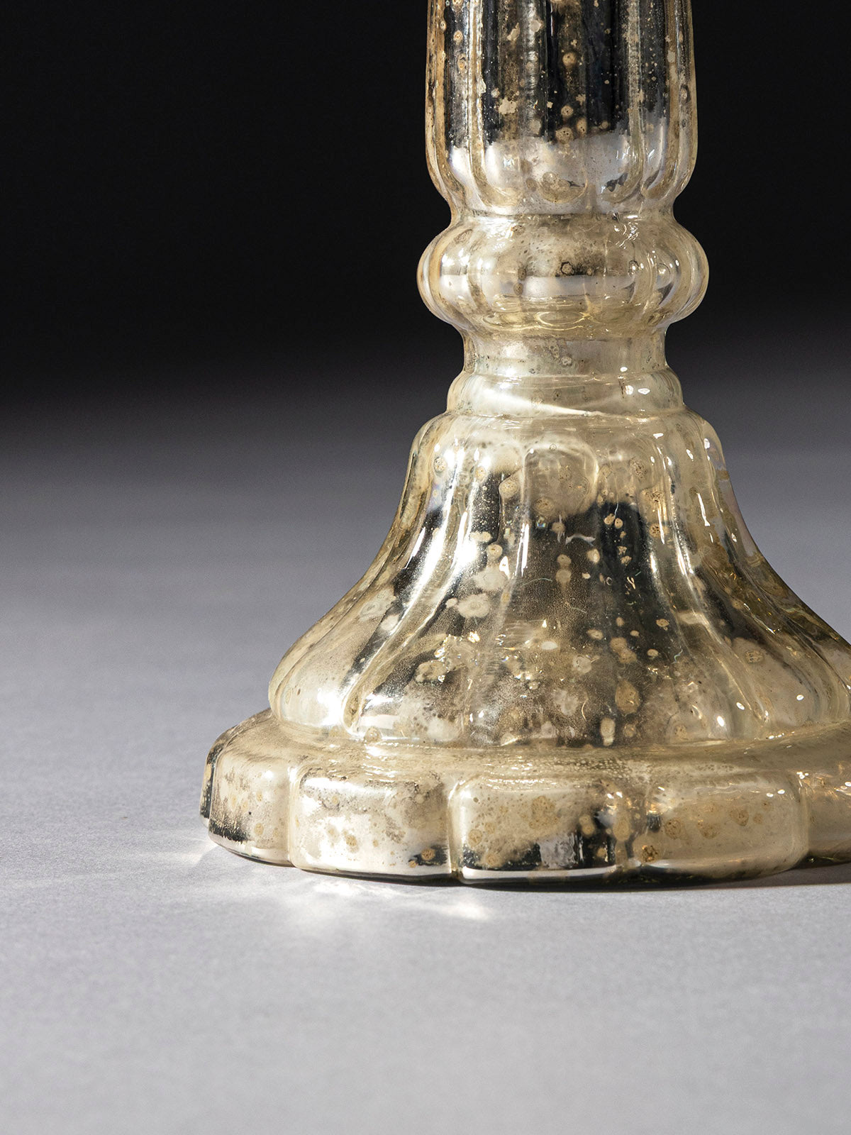 The Prunara Glass Candle Holder is a timeless piece crafted in antique mercury glass with a graceful pedestal silhouette. Its reflective surface captures candlelight beautifully, creating a warm, inviting glow. Perfect for dining tables, mantels, or festive displays, this pair adds sophistication and depth to your décor. A versatile accent that blends vintage charm with modern elegance, making it ideal for both everyday styling and special occasions.