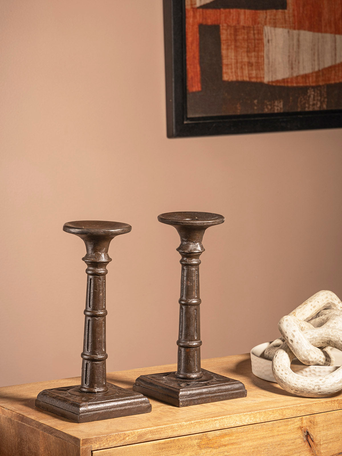 These elegant black cast iron candlestick holders feature a vintage-inspired design with a sturdy square base and a sleek column structure. Perfect for adding a touch of rustic charm to any space, they blend seamlessly with traditional or modern décor. Ideal for dining tables, mantels, or event settings.