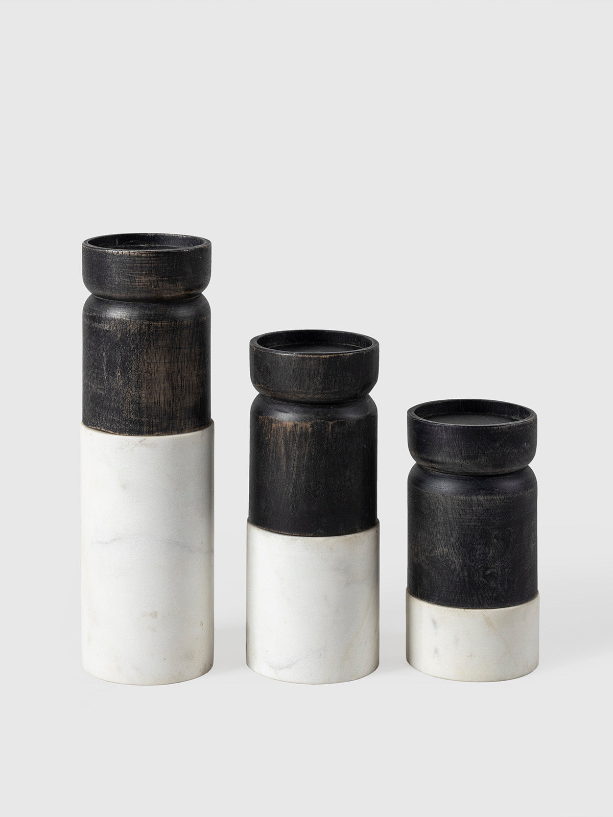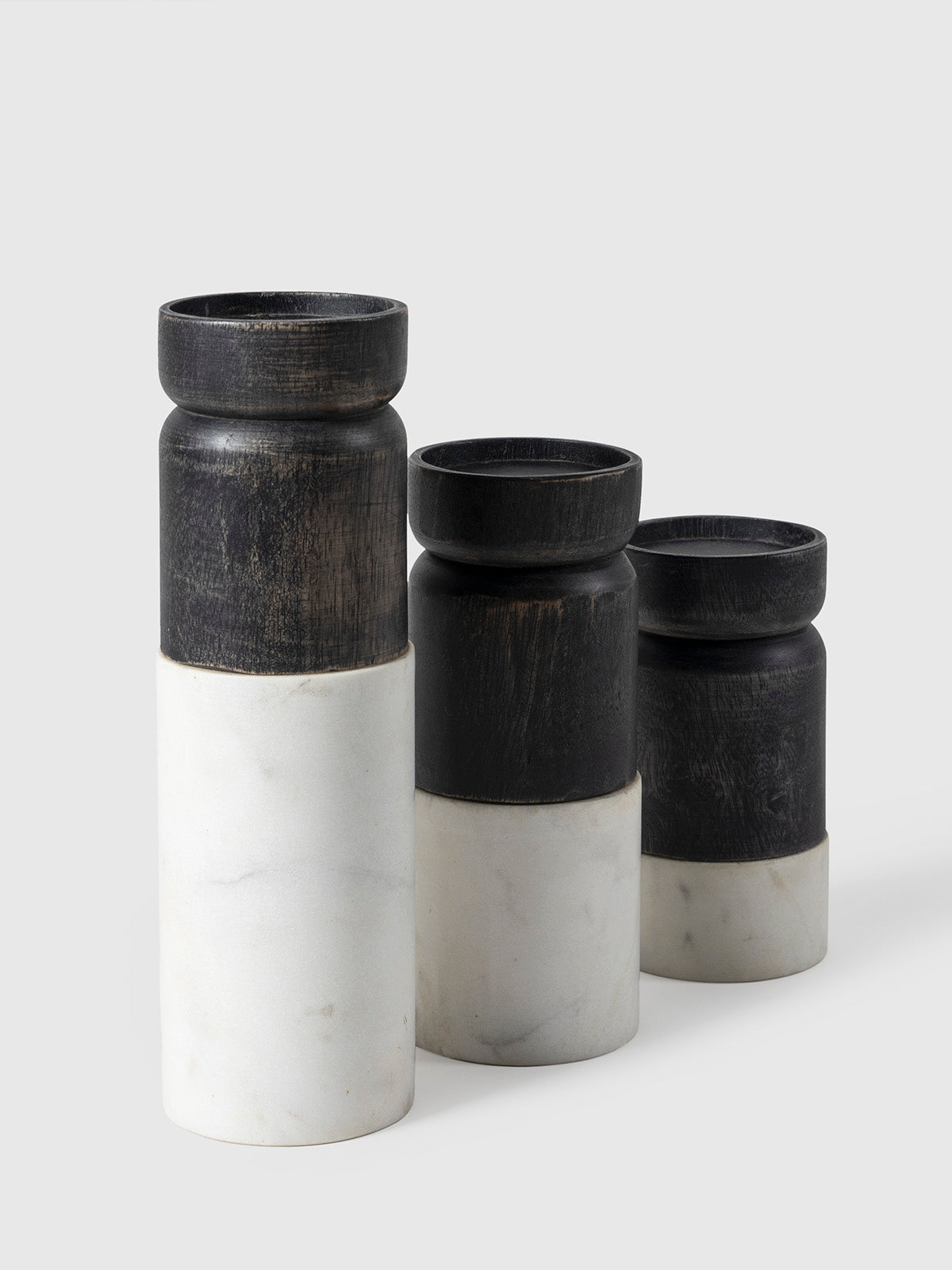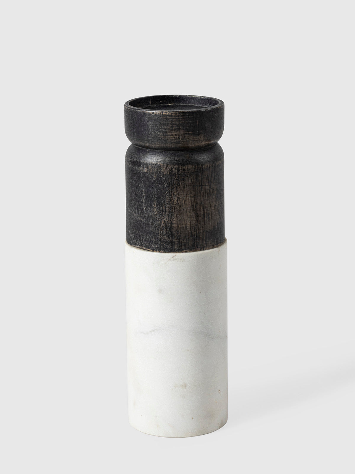 This sophisticated candle holder features a sleek marble base paired with a textured wooden top, blending natural elements for a modern aesthetic. The contrasting materials create a striking visual appeal, making it a perfect addition to contemporary or minimalist home decor. Ideal for accentuating dining tables, shelves, or living spaces.