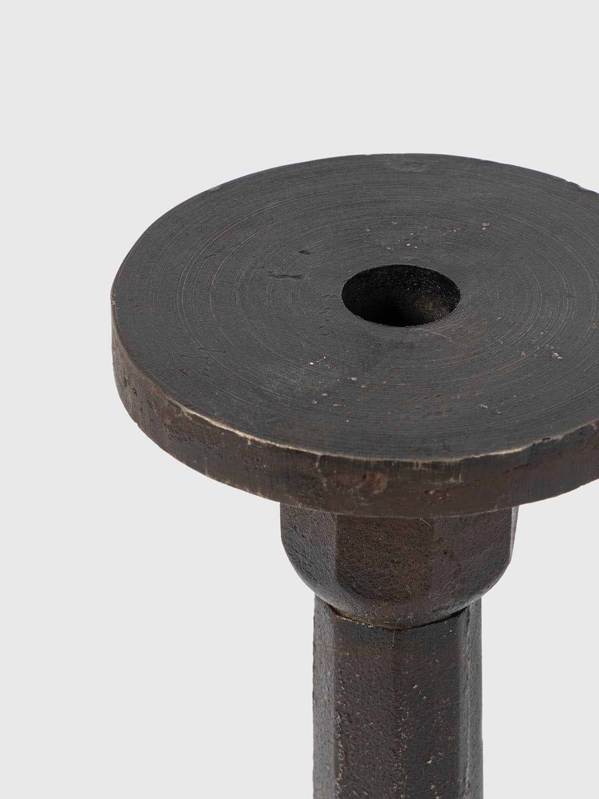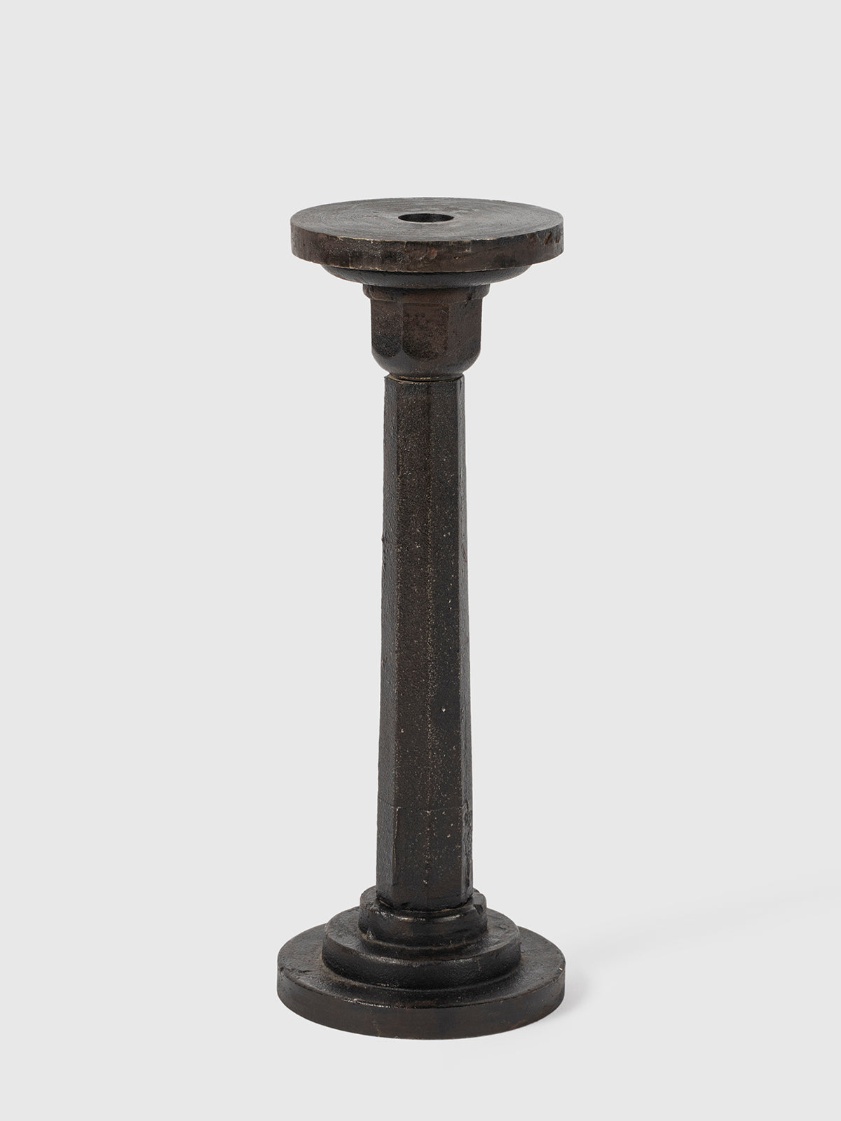 Handcrafted from iron with a striking antique finish, this candle holder blends rustic charm with refined design. Its textured surface and timeless aesthetic make it a perfect addition to dining tables, mantels, or outdoor settings. Elevate your space with this unique decor piece.