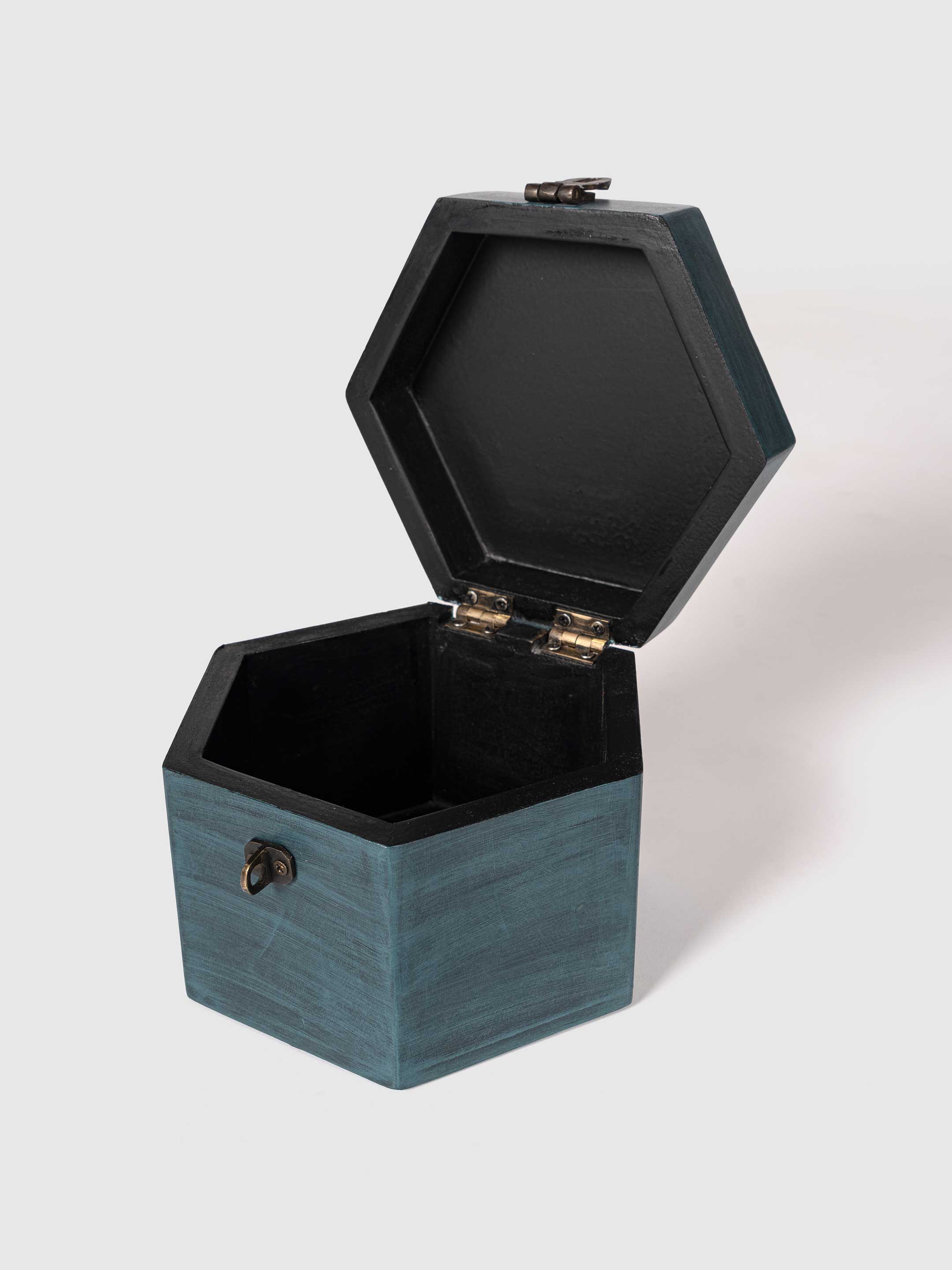 A handcrafted, hexagonal Wooden Box in teal blue with a rustic metal latch. The top features a beige fabric inlay, adding a touch of elegance. Ideal for storing keepsakes, jewelry, or small items, this unique box blends vintage charm with modern design, perfect for enhancing home decor.