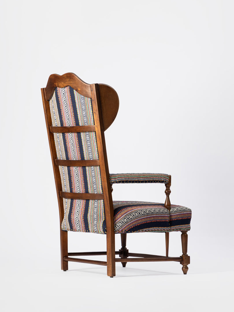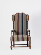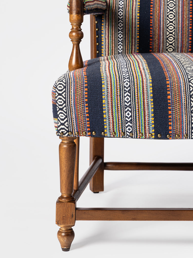 The Ametrine Wooden Upholstered Armchair is a regal statement piece for refined interiors. Its tall backrest, winged sides, and intricate wooden frame evoke classic charm, while the vibrant patterned fabric adds a modern edge. Designed with cushioned seating and supportive armrests, it offers both comfort and grandeur. Perfect for formal living rooms, libraries, reading nooks, traditional lounges, vintage-inspired bedrooms, or eclectic interiors, Ametrine blends heritage design with practical elegance. A striking armchair that enhances interiors with sophistication, tradition, and bold personality.