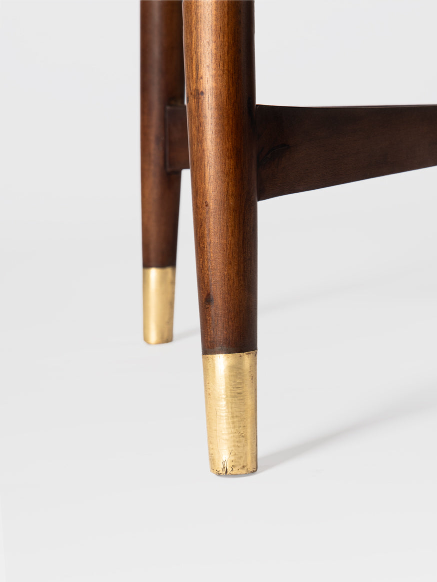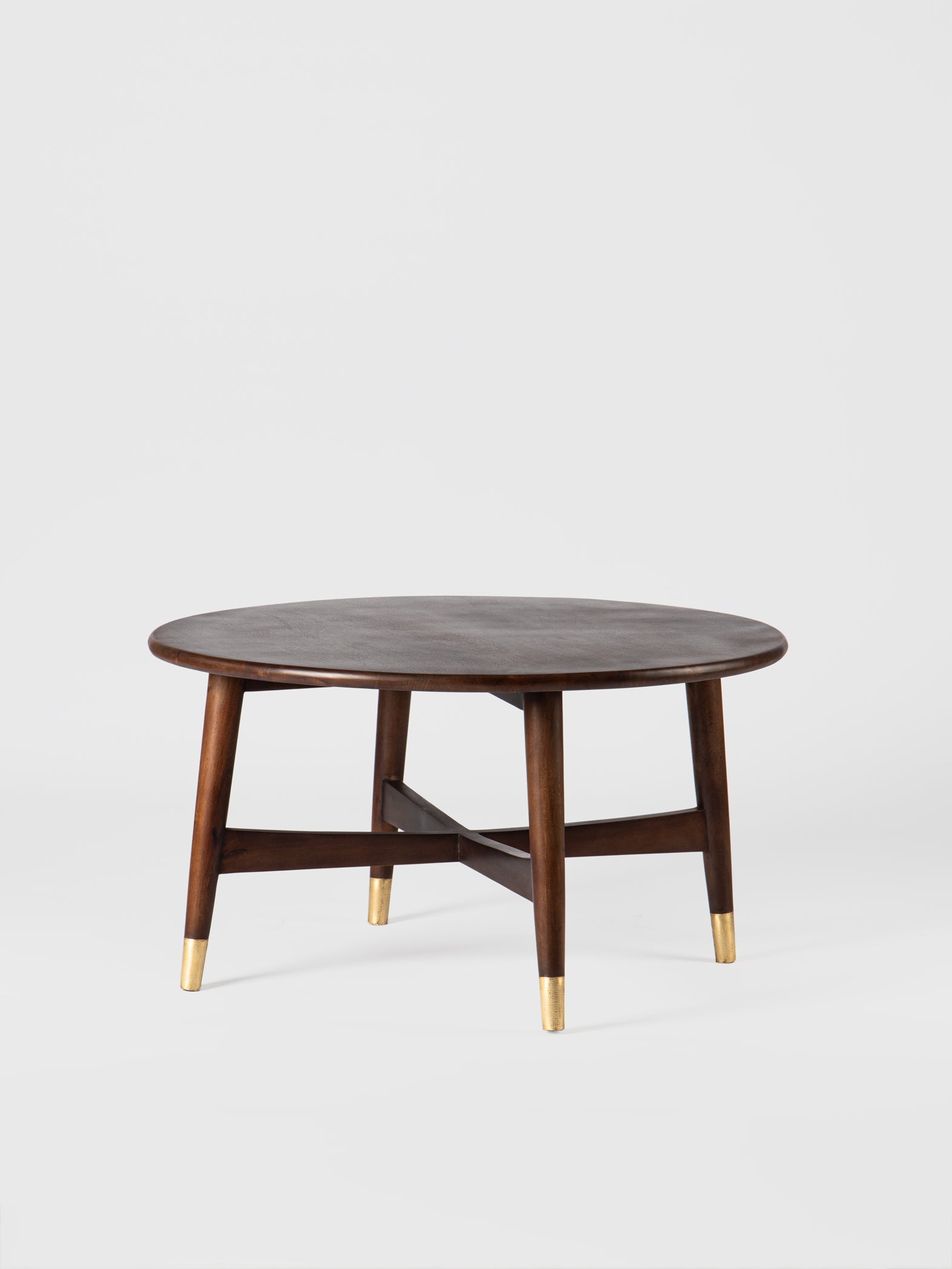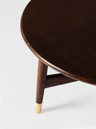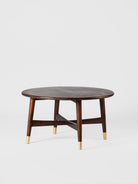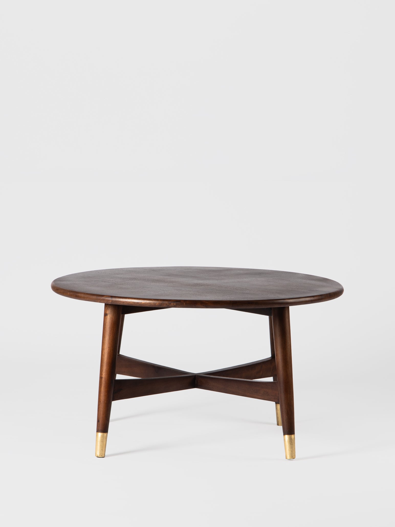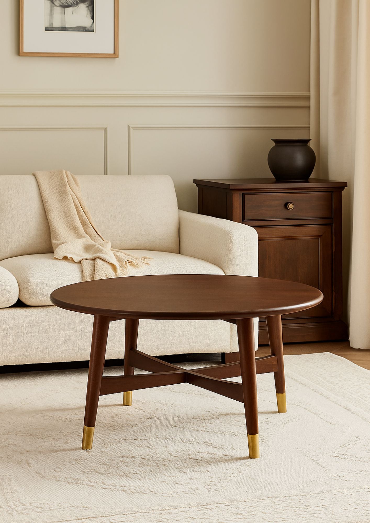 This mid-century inspired coffee table brings quiet elegance to any living room. The smooth, rounded wooden top rests on tapered legs, each accented with subtle brass caps that add a refined touch. Its warm finish and clean silhouette make it easy to pair with both modern and classic décor. Perfect for serving, styling, or everyday living, it adds timeless charm to your home—an effortless upgrade worth welcoming in.