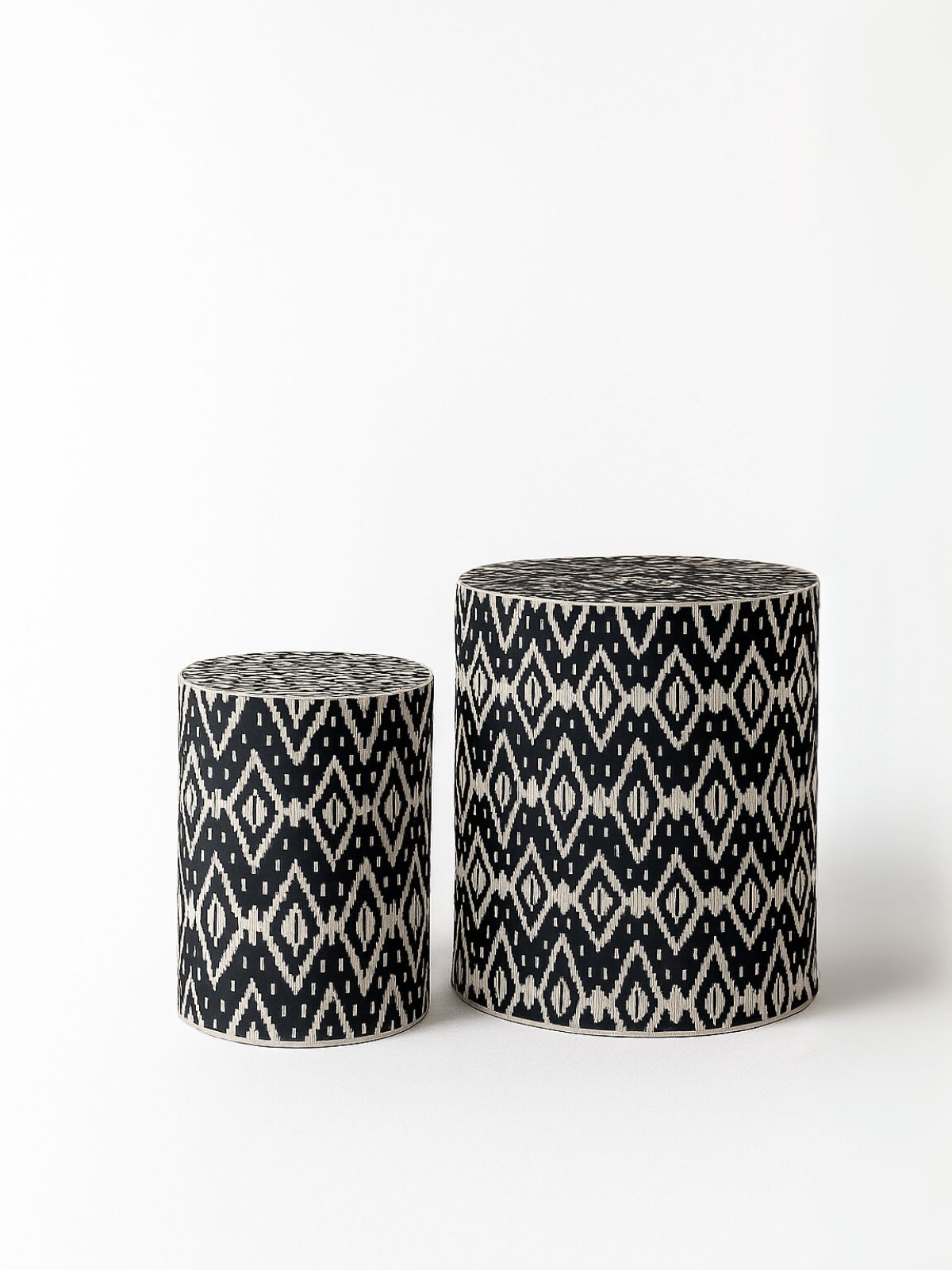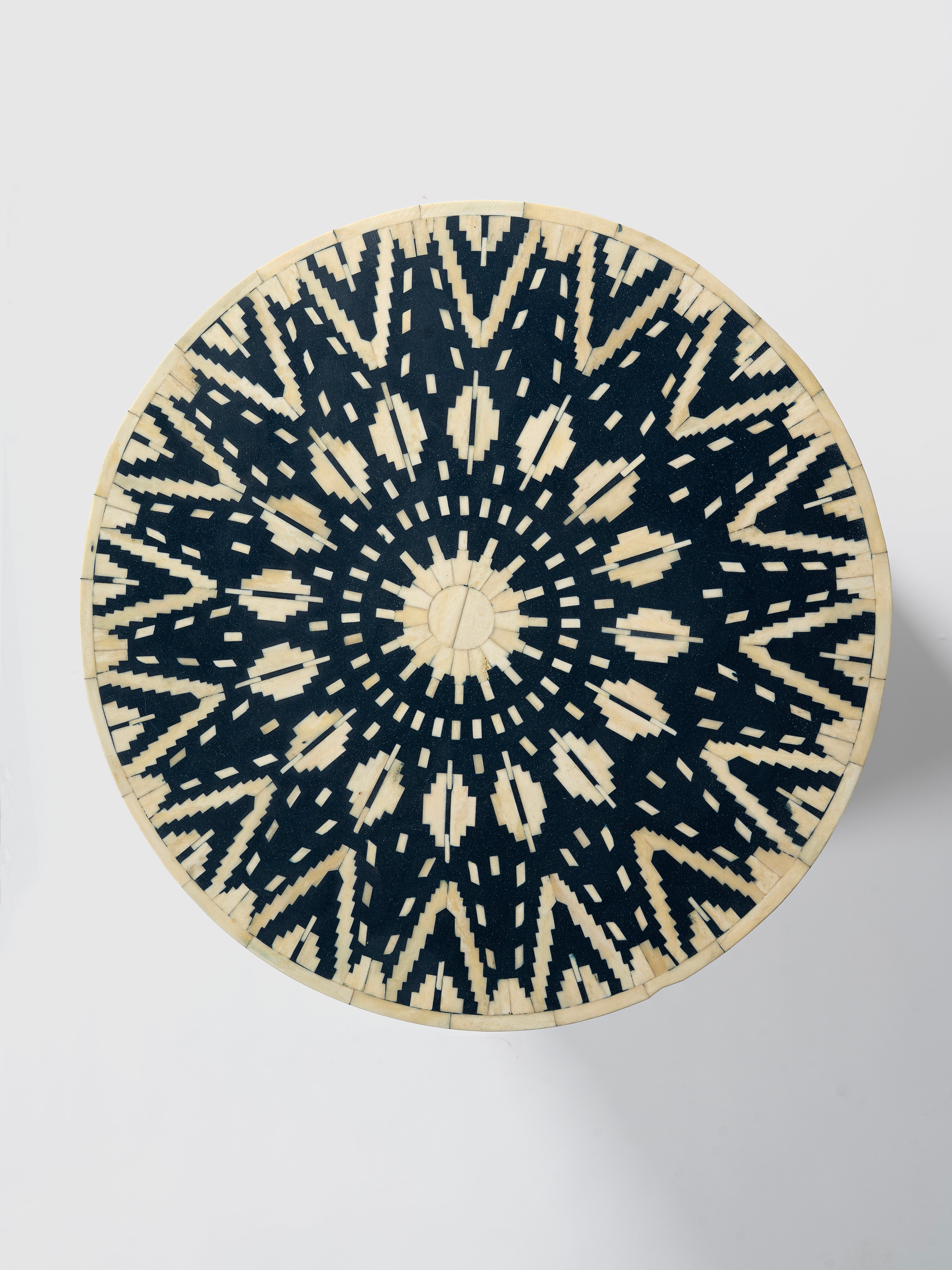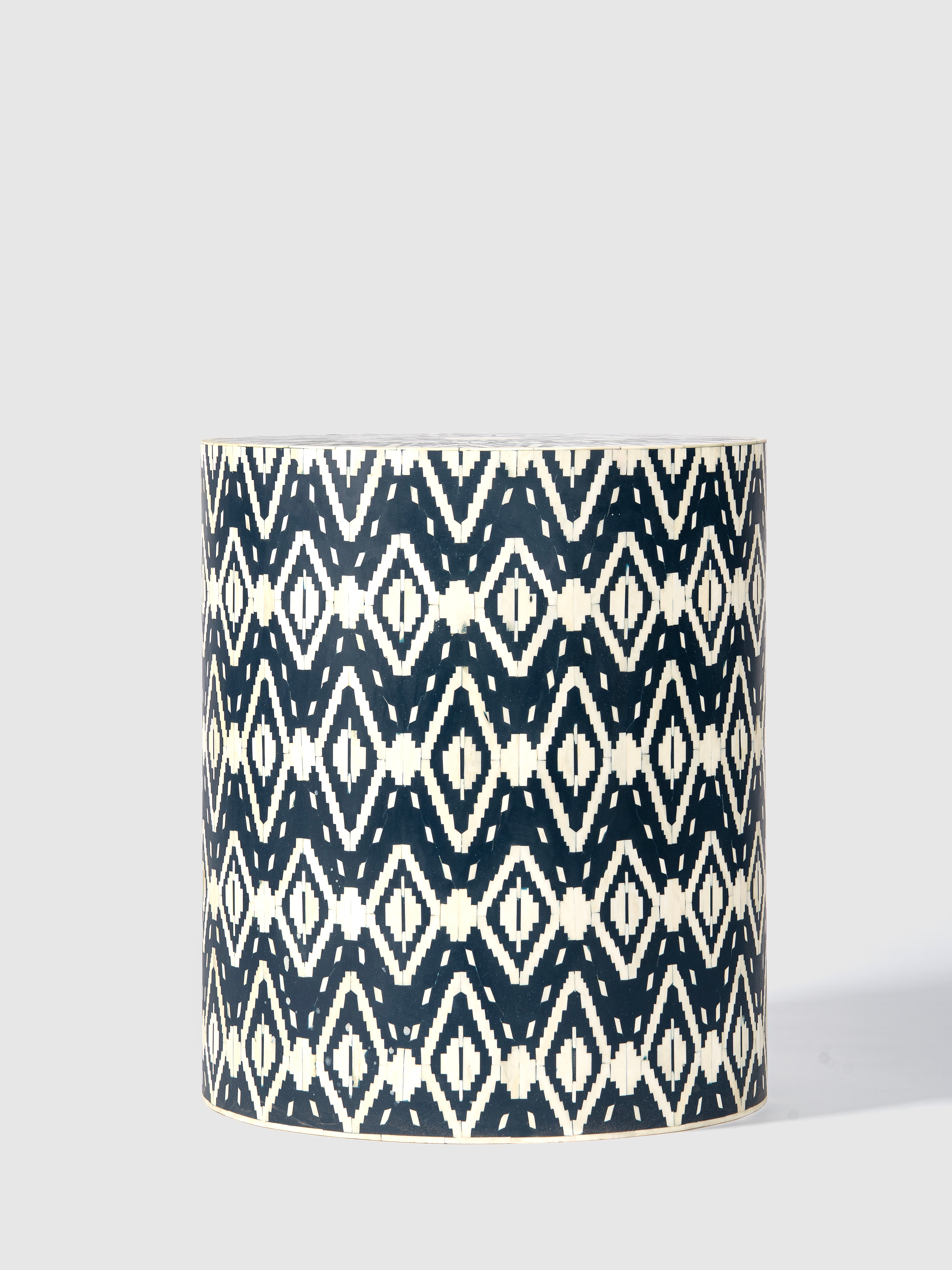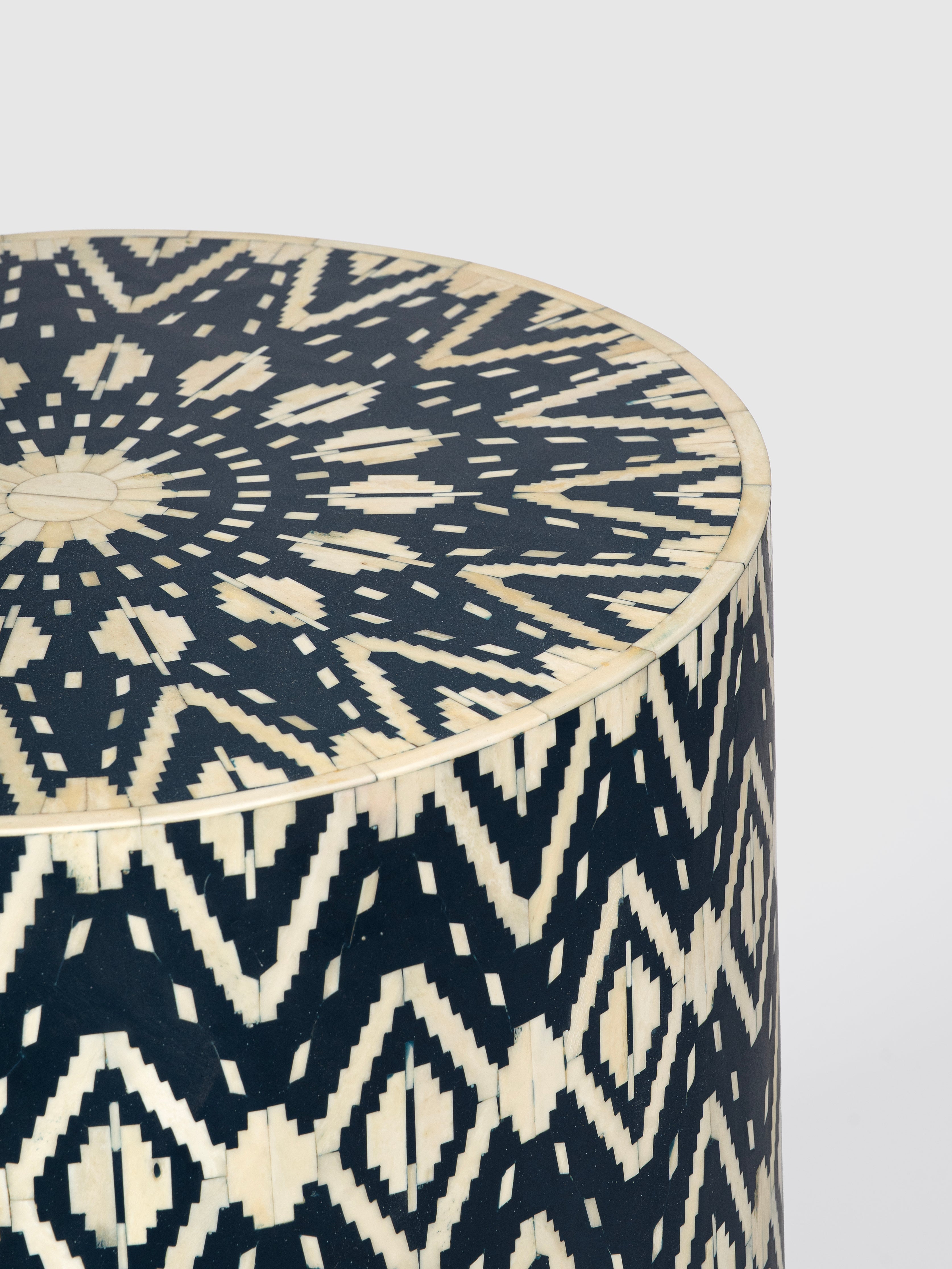 Elevate your space with the Opole Bone Inlay Table — a masterpiece of craftsmanship and quiet luxury. Handcrafted by skilled artisans, each table is a labor of love, created using centuries-old bone inlay techniques native to Rajasthan. Slivers of ethically sourced camel bone are delicately carved and set into resin by hand, forming the striking ikat-inspired pattern in rich indigo and ivory tones.