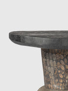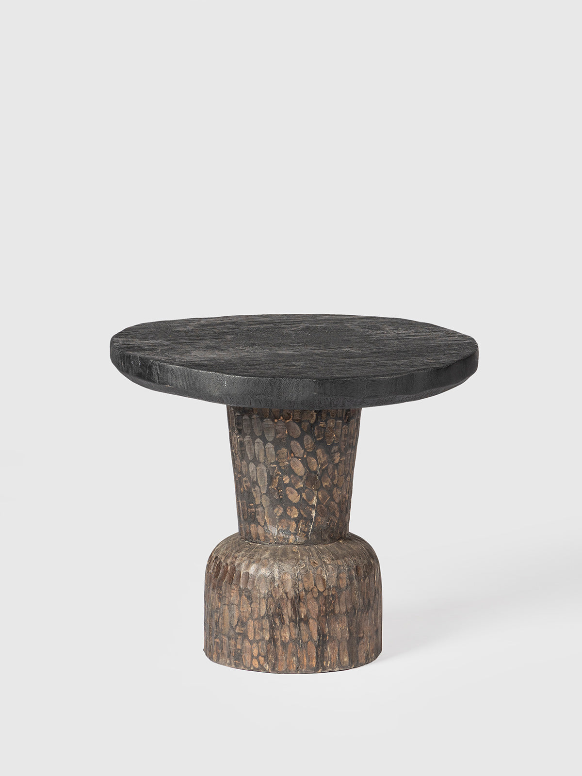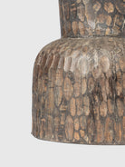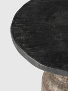 This handcrafted round coffee table features a textured, sculptural wooden base and a solid, dark-stained top with natural wood grain. Perfect for modern rustic interiors, this artisan accent piece adds organic charm and durability to any living space. Ideal for those seeking unique, sustainable wood furniture with timeless appeal.