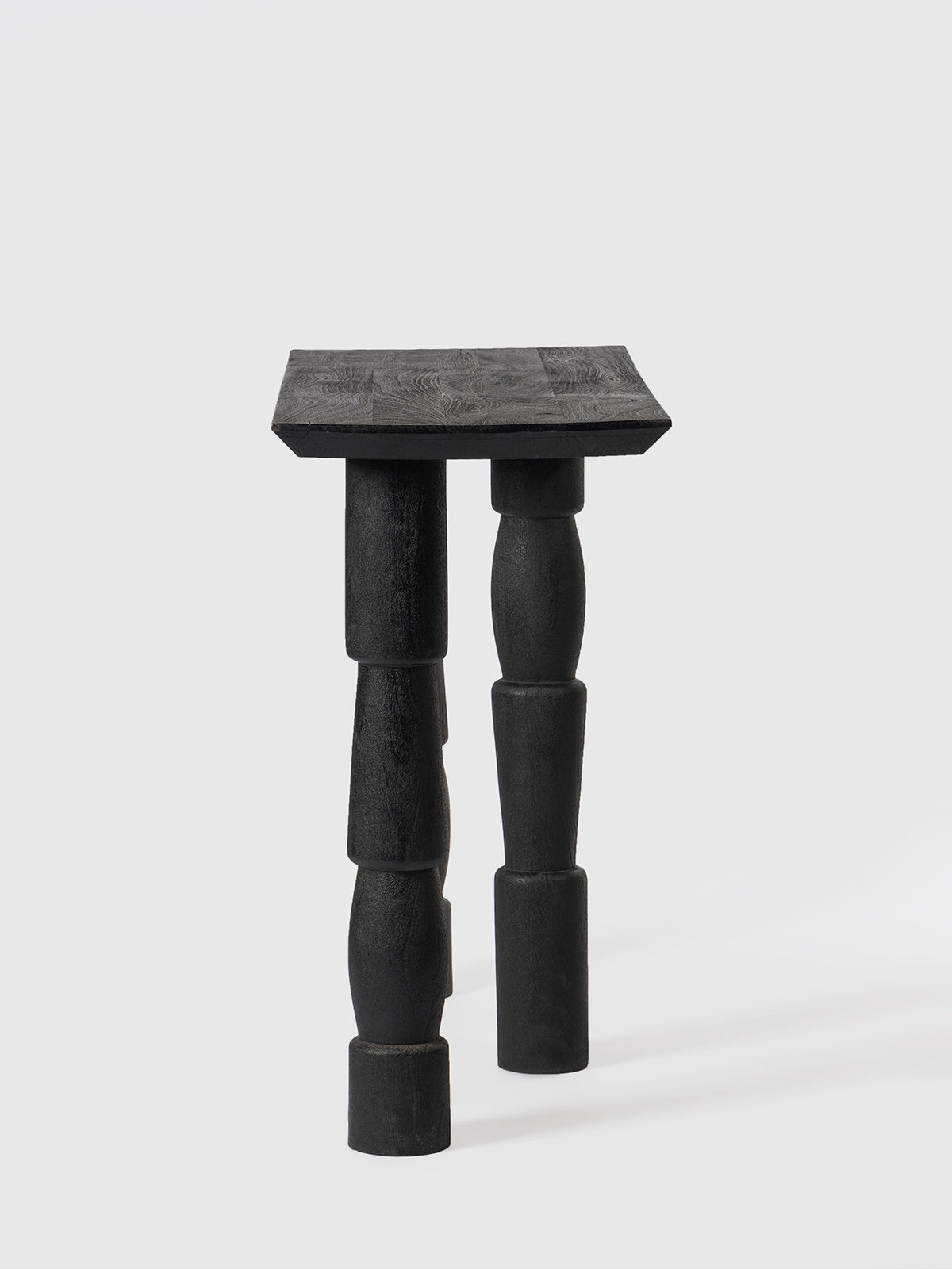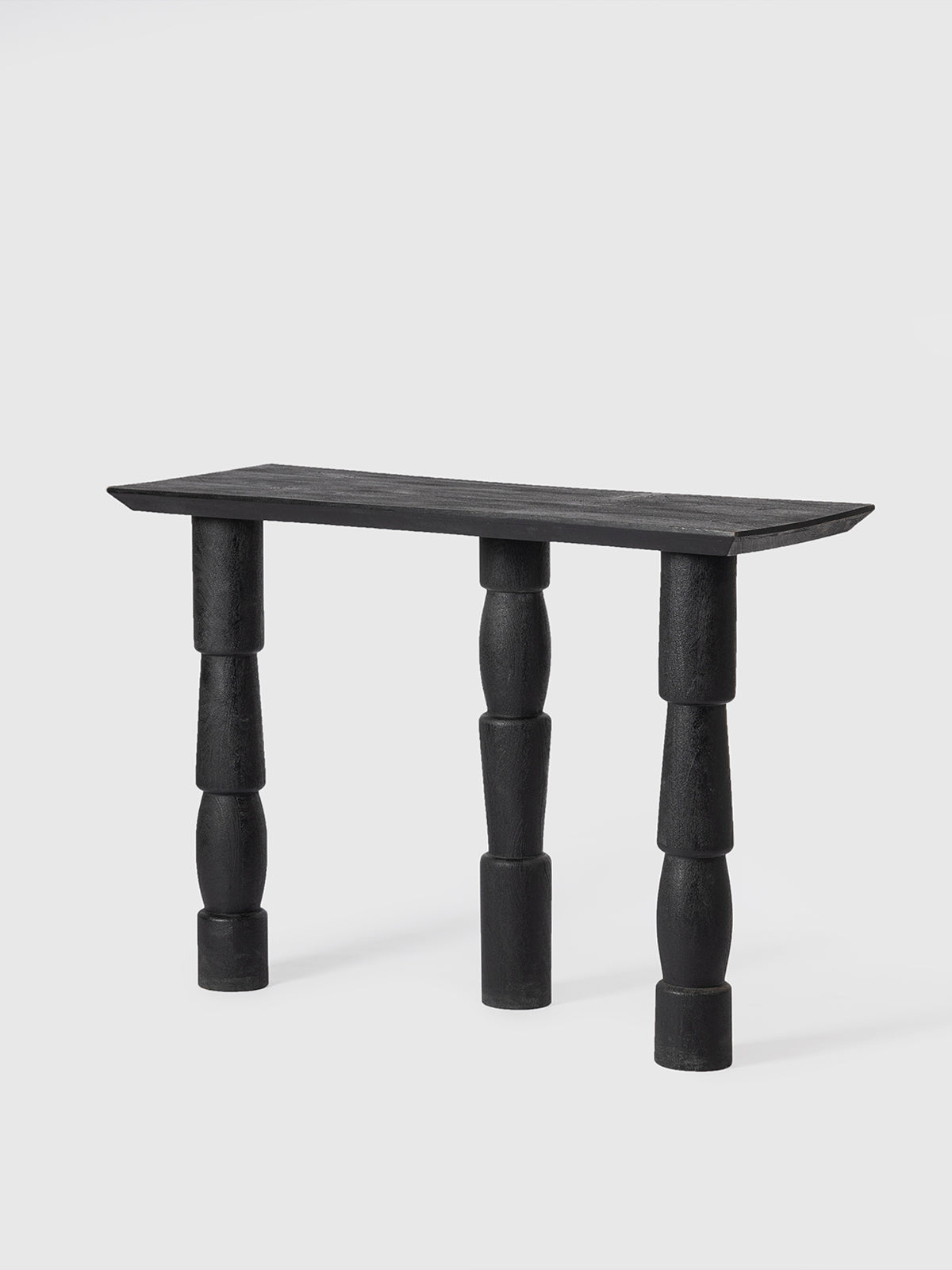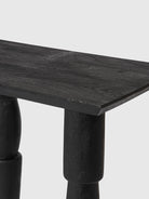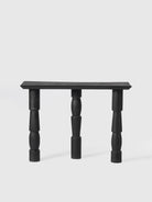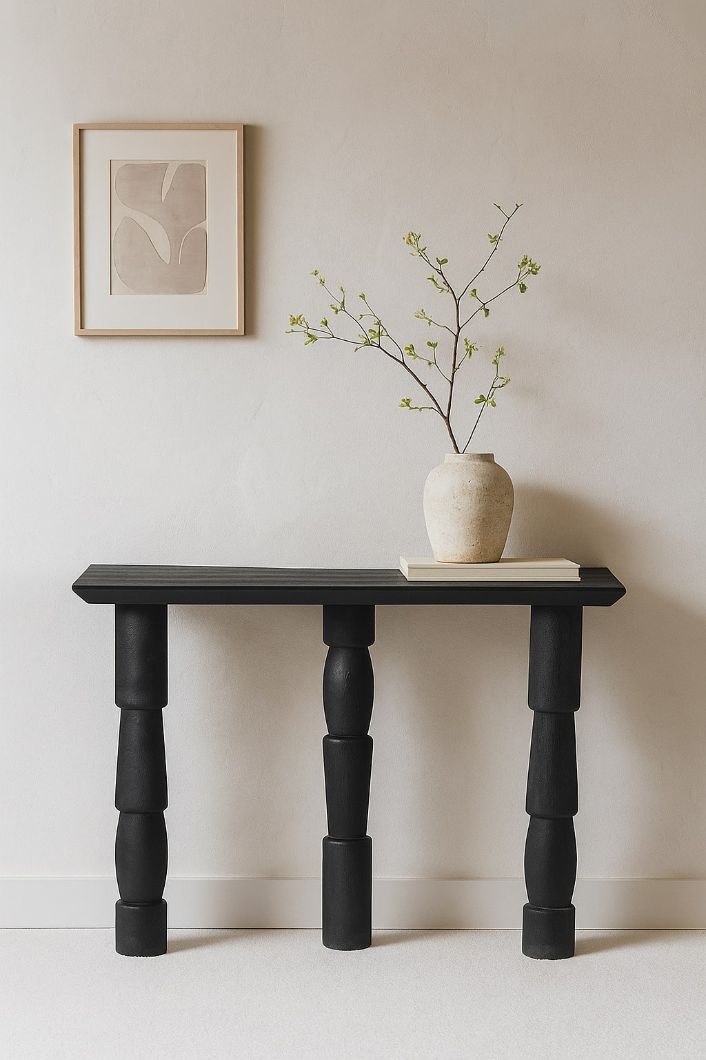 Bold and sculptural, this handcrafted black console table features exaggerated turned legs and a sleek, minimal profile. The striking silhouette is complemented by a deep, matte black finish that highlights the natural grain of the wood, adding rich texture and depth. A dramatic statement for modern spaces, it effortlessly balances contemporary design with artisanal character.