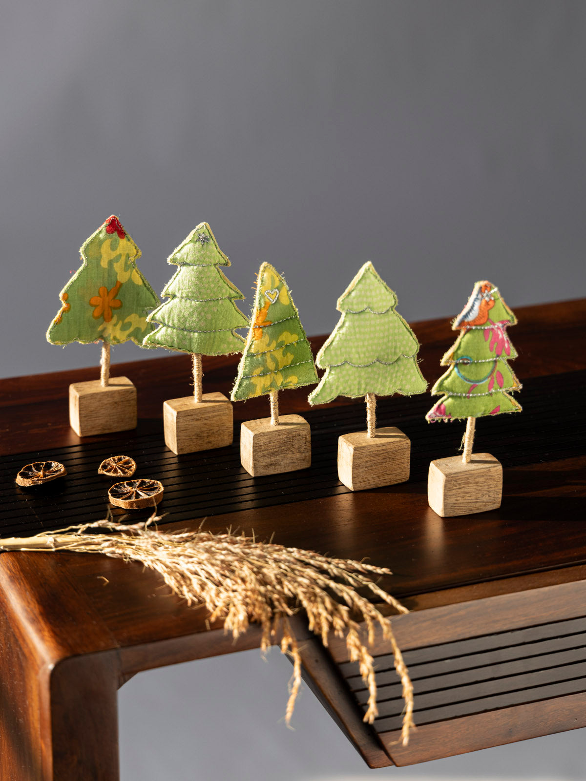 Bring the outdoors in with these charming handcrafted tree ornaments! Featuring cute fabric trees perched on wooden bases, they add a cozy and rustic vibe to your holiday decor. Perfect for tabletops or your Christmas tree, these little trees are brimming with festive cheer!