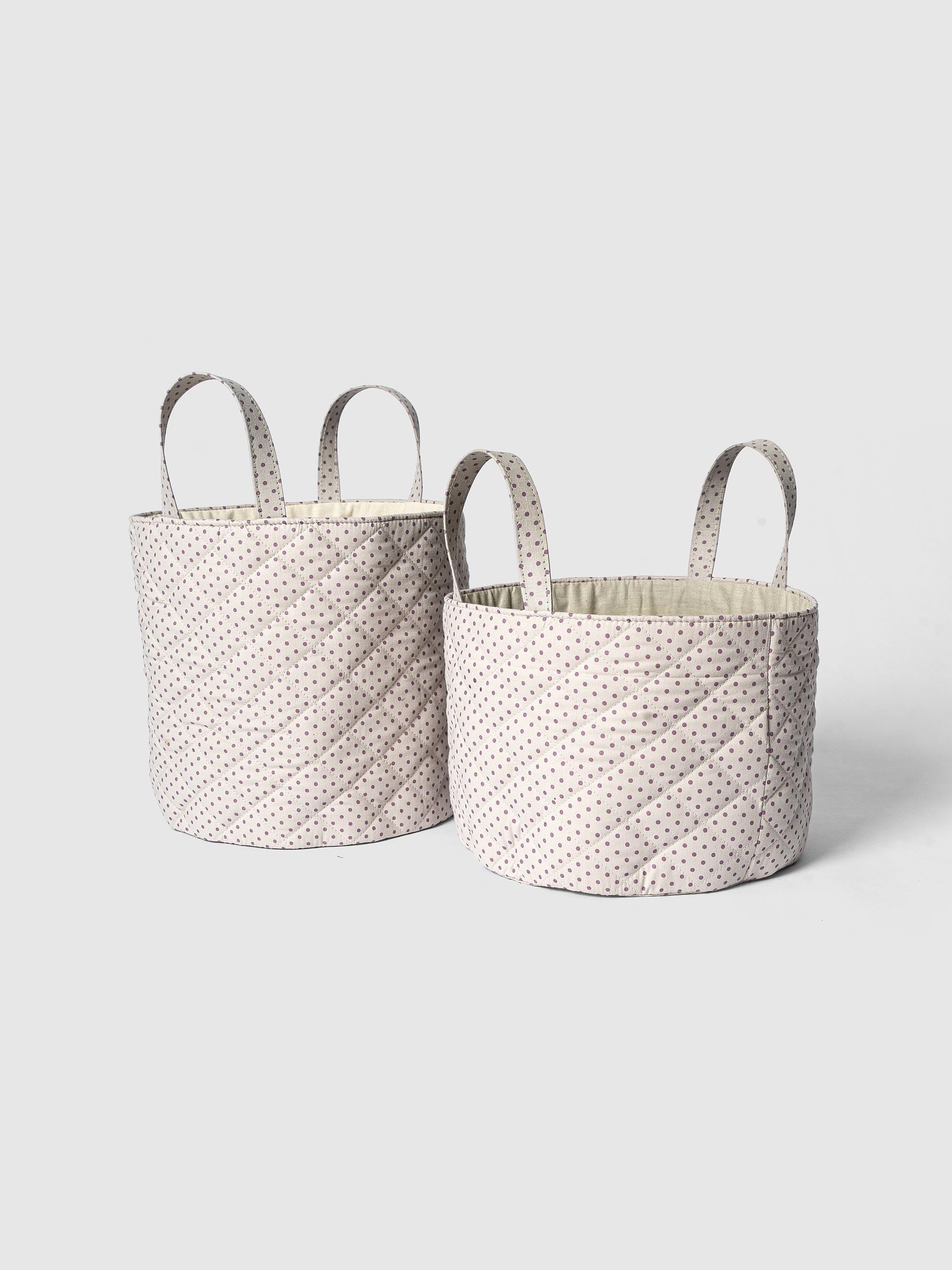 Organize your space beautifully with our handcrafted quilted fabric baskets. Designed in India, these soft yet sturdy storage solutions are perfect for decluttering any room while adding a touch of elegance. Featuring charming polka dot patterns and durable quilted cotton, these baskets are ideal for storing laundry, toys, accessories, or household essentials. Their lightweight design and convenient handles make them easy to carry, while the neutral and vibrant colors blend seamlessly with any décor. Whether used in the bedroom, living room, or nursery, these fabric baskets offer a functional and stylish way to keep your home tidy.