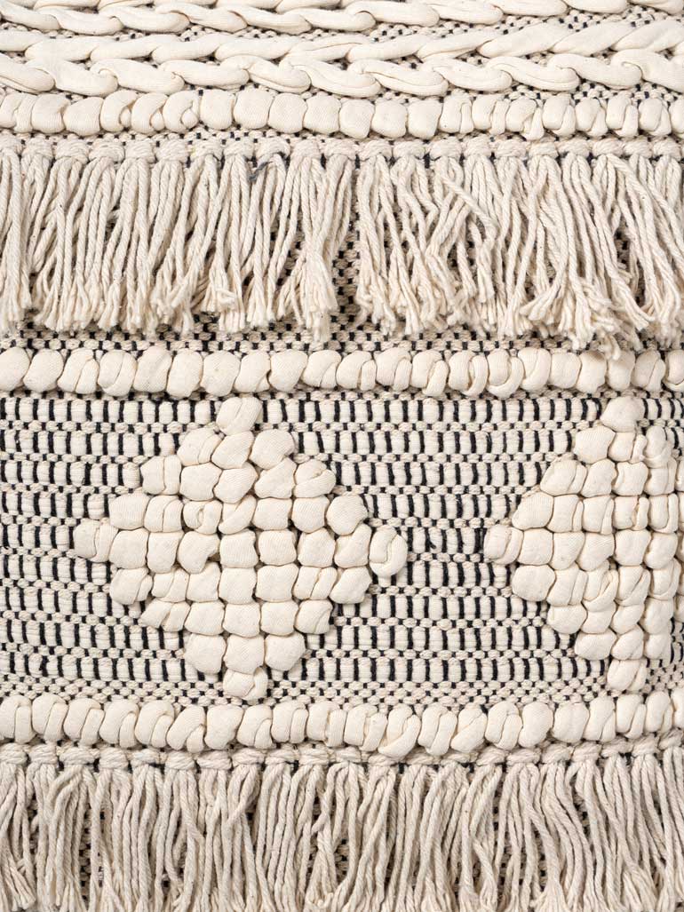 Our stylish cushion cover features a handcrafted, bohemian-inspired design with intricate woven textures and long fringes. Neutral cream and beige tones, paired with diamond-shaped accents, add artisanal charm. Perfect for rustic or eclectic interiors, it brings warmth and character to any sofa, chair, or bed, enhancing your space effortlessly.