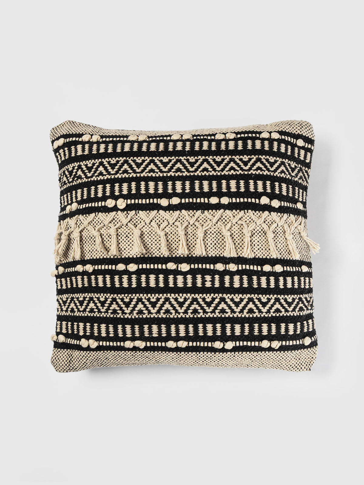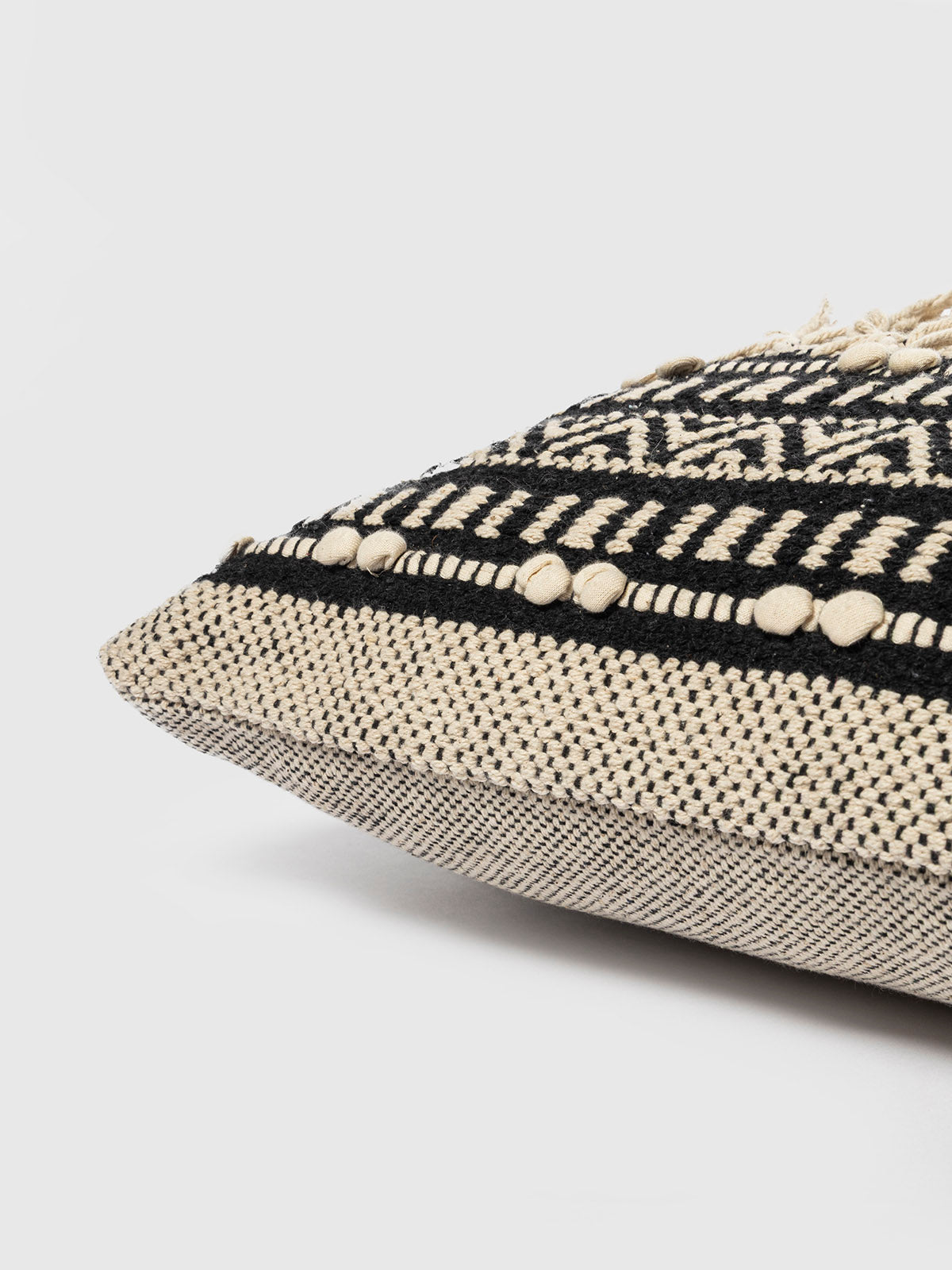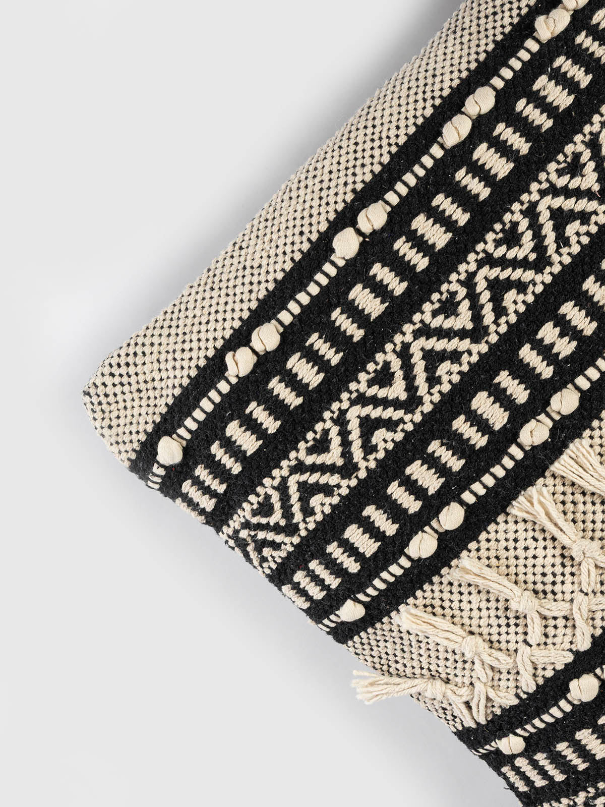 Elevate your home décor with this bold monochrome rug cushion. Intricately handwoven with tribal-inspired patterns, textured knots, and playful tassels, it adds character and contrast to any space. A perfect blend of tradition and trend, this cushion brings tactile charm and modern boho vibes to your sofa or reading nook.