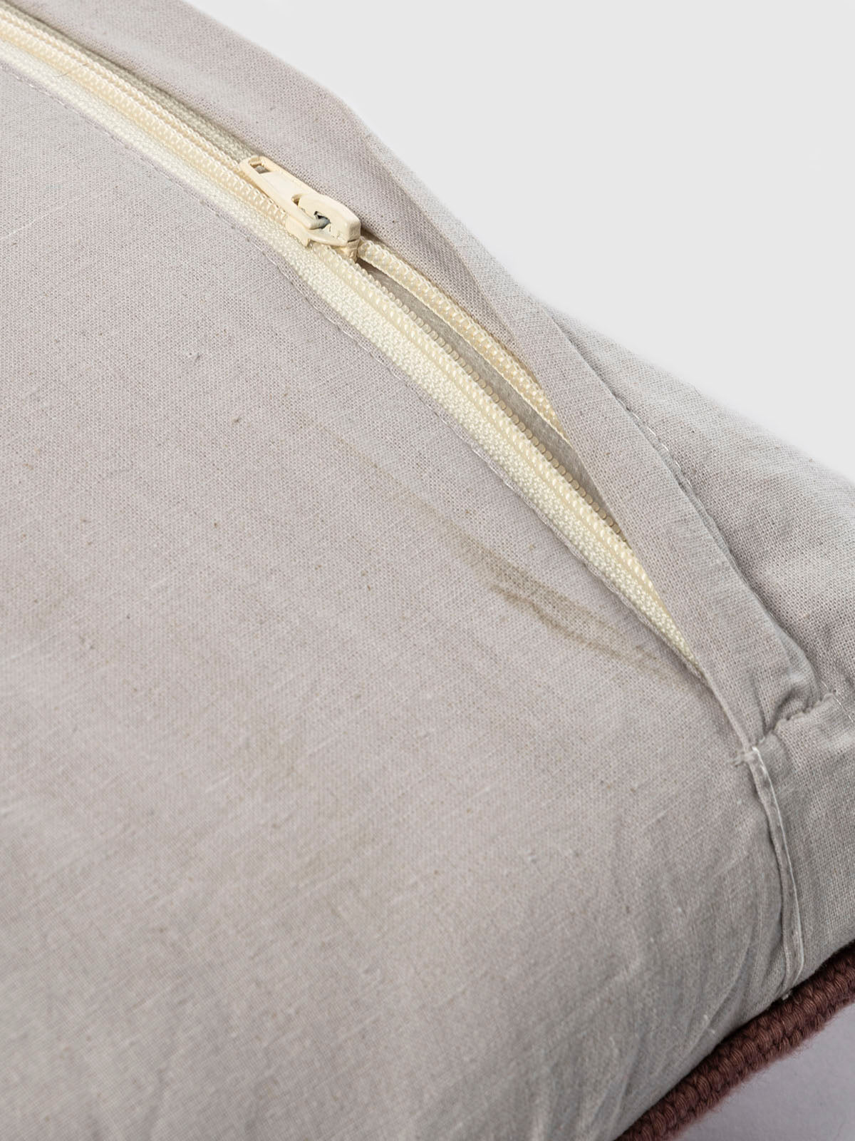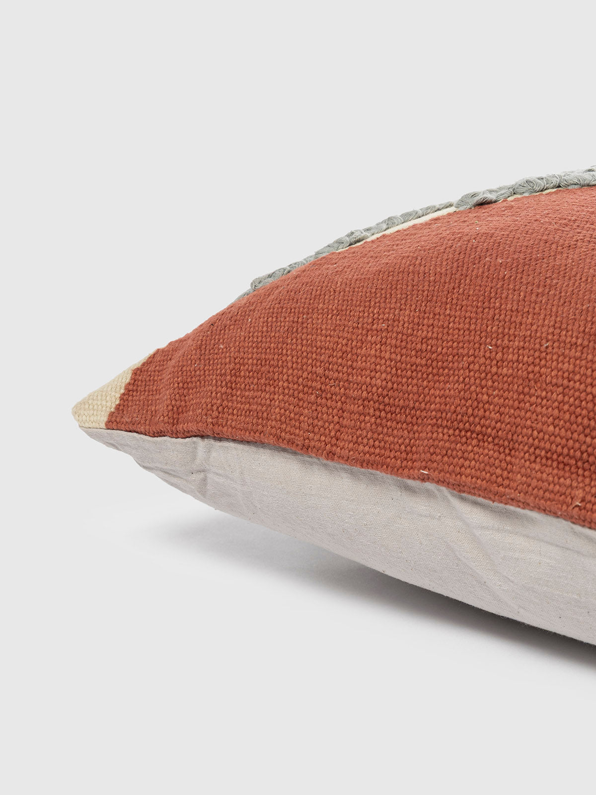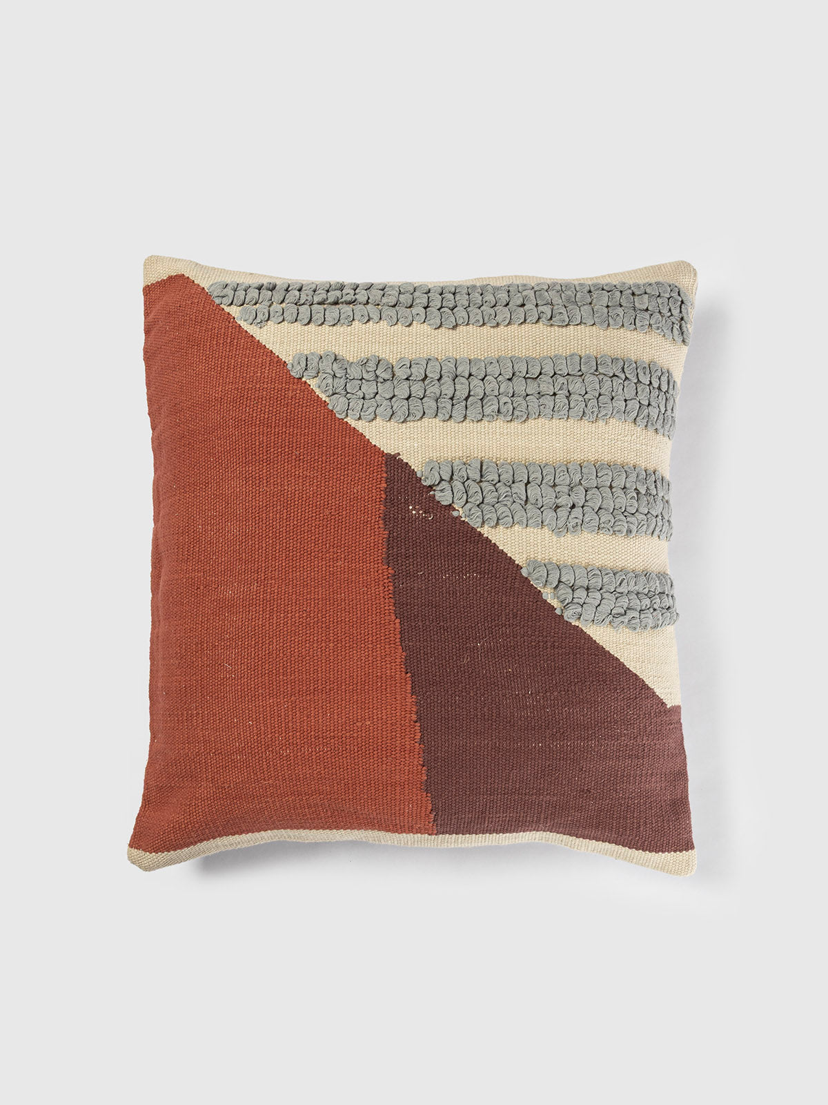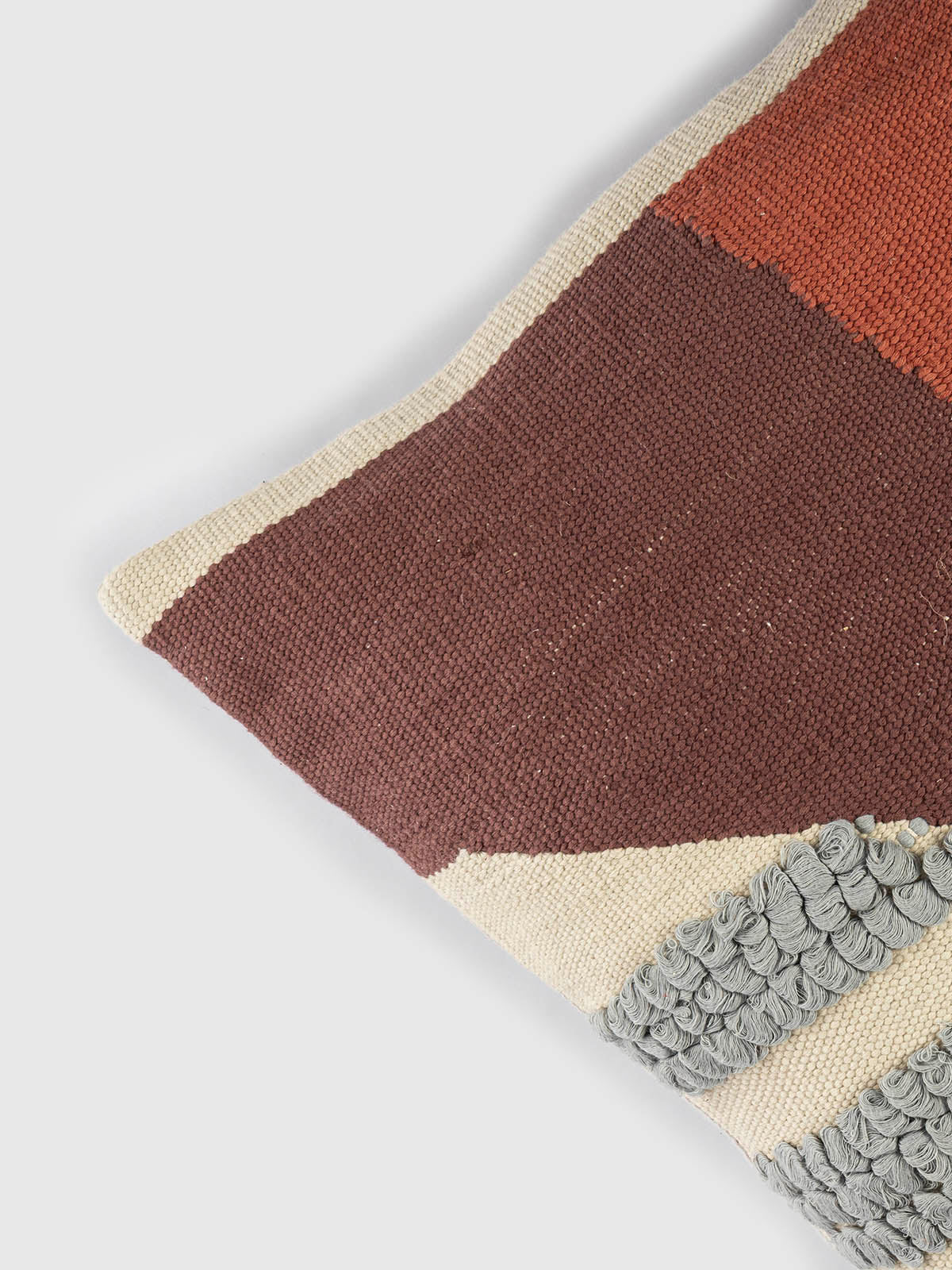 Add a bold statement to your sofa or bed with this striking rug cushion. Featuring rich terracotta, deep burgundy, and soft grey looped textures in a modern geometric design, it effortlessly fuses tribal artistry with contemporary flair. Perfect to elevate any space with warmth, depth, and standout style.