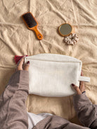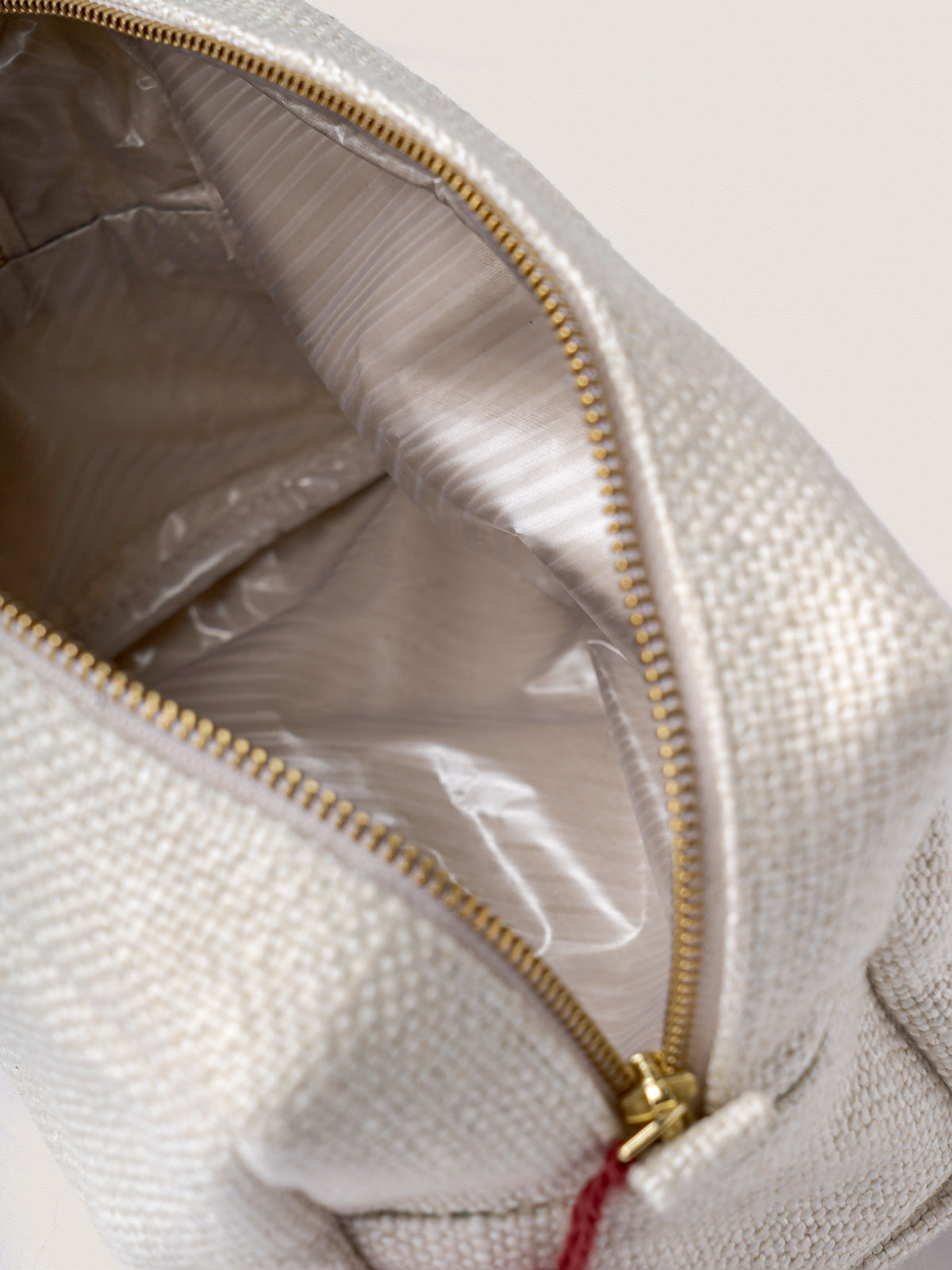 Designed for everyday beauty essentials, this cosmetic pouch is crafted in textured Lennox fabric with a structured, minimal silhouette. The interior features a wipe-clean plastic lining, making it practical for storing makeup, skincare, and travel essentials without worry.