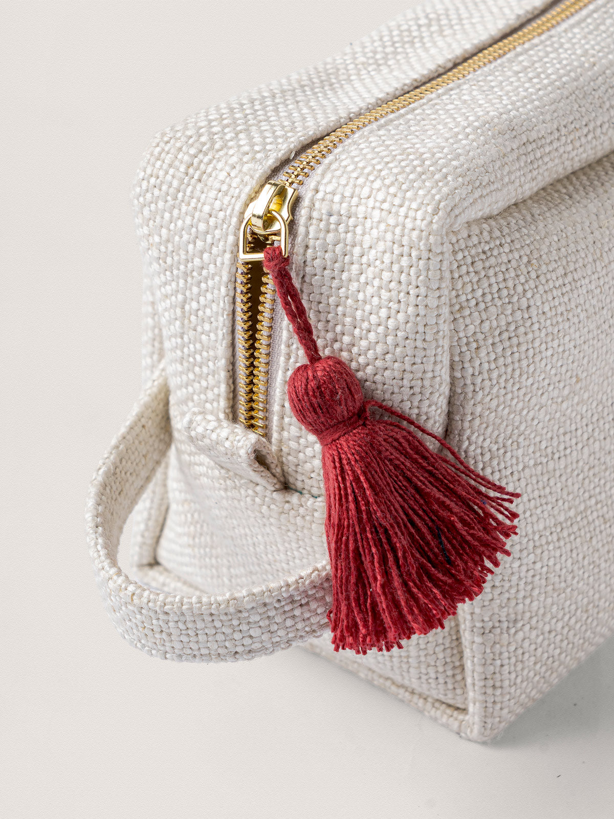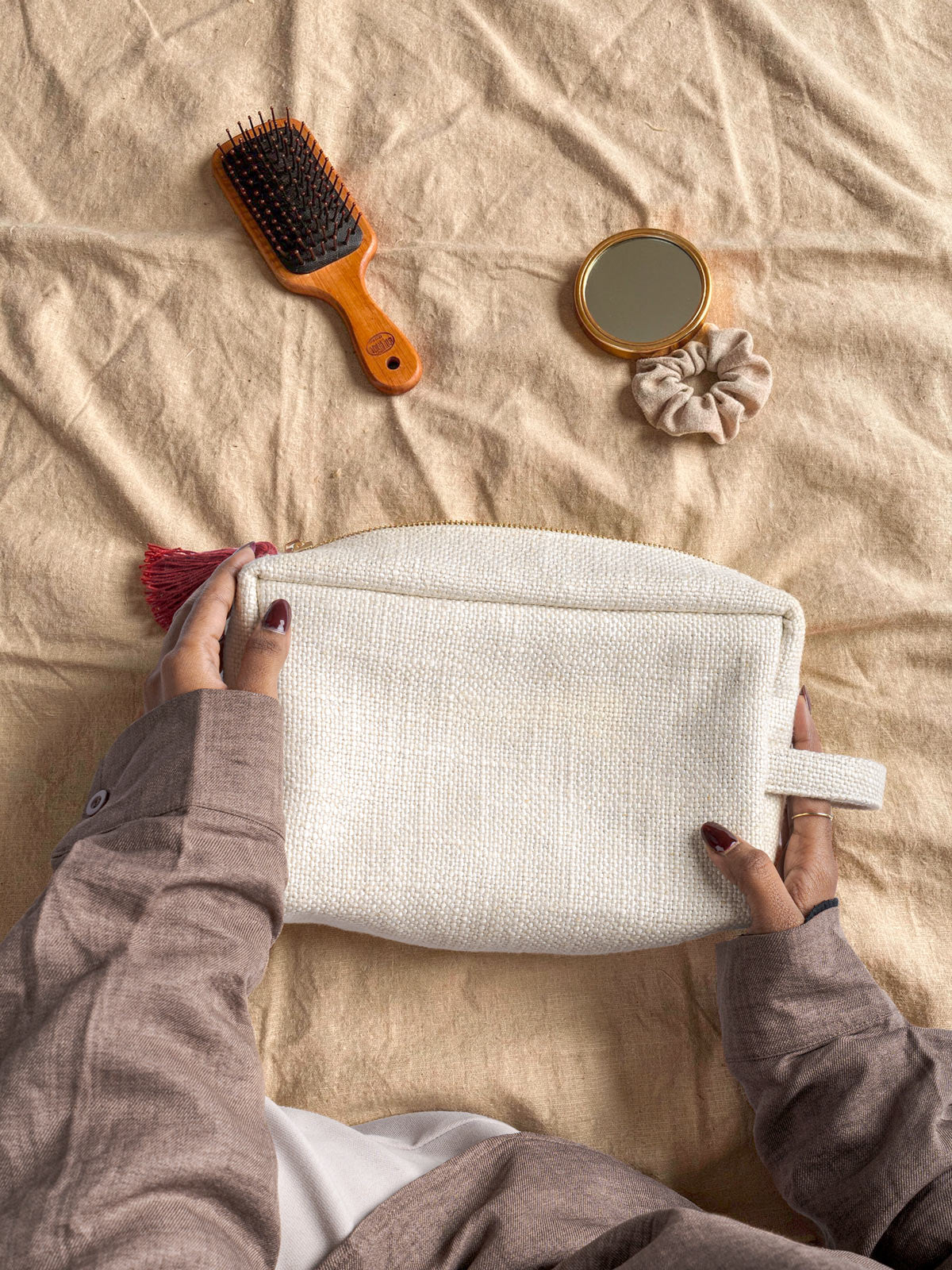 Finished with a smooth zip closure and a subtle tassel detail, it balances function with understated style. Compact yet spacious, it slips easily into a tote or suitcase—made to move with you, day to night.