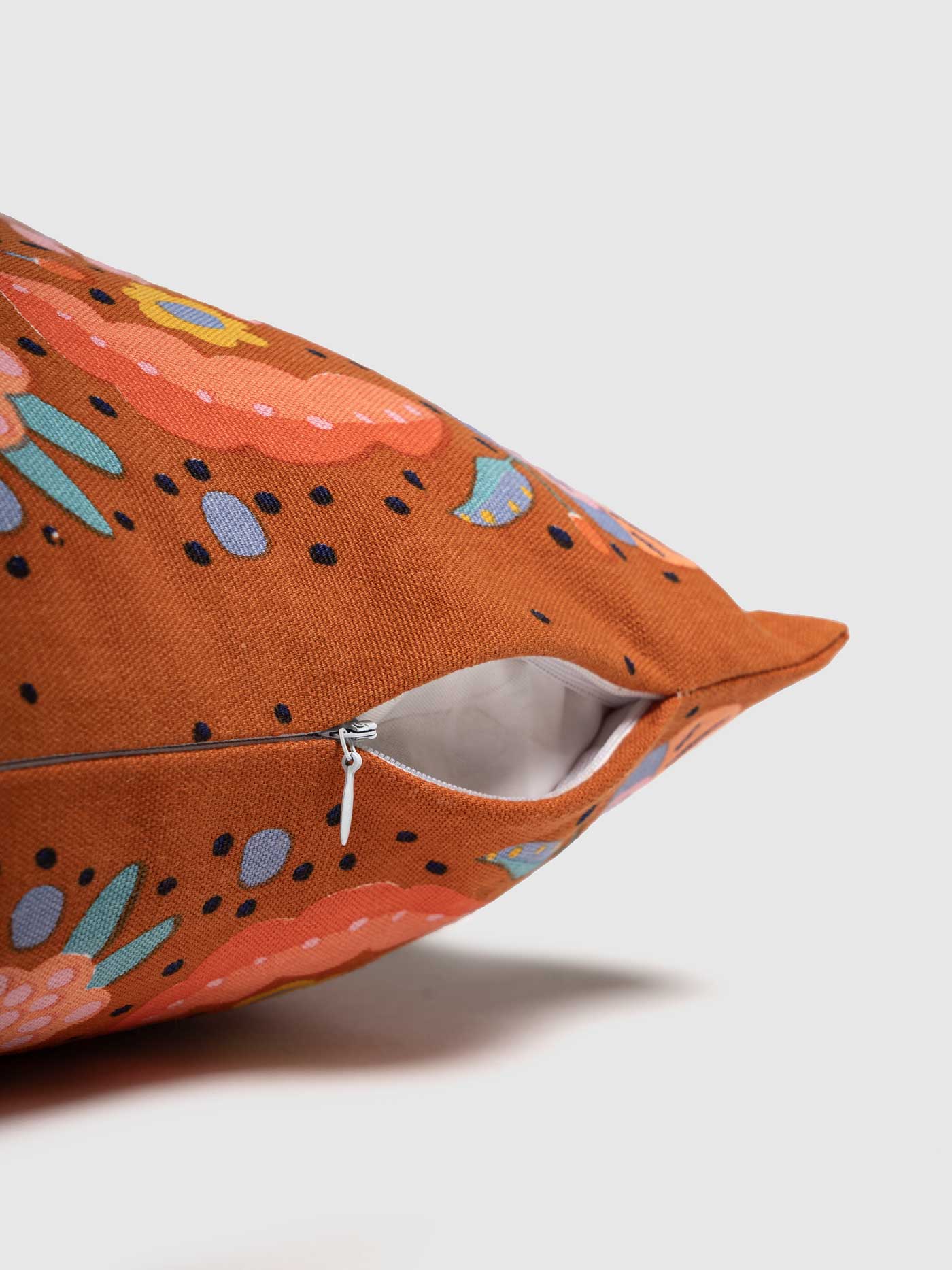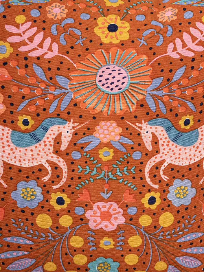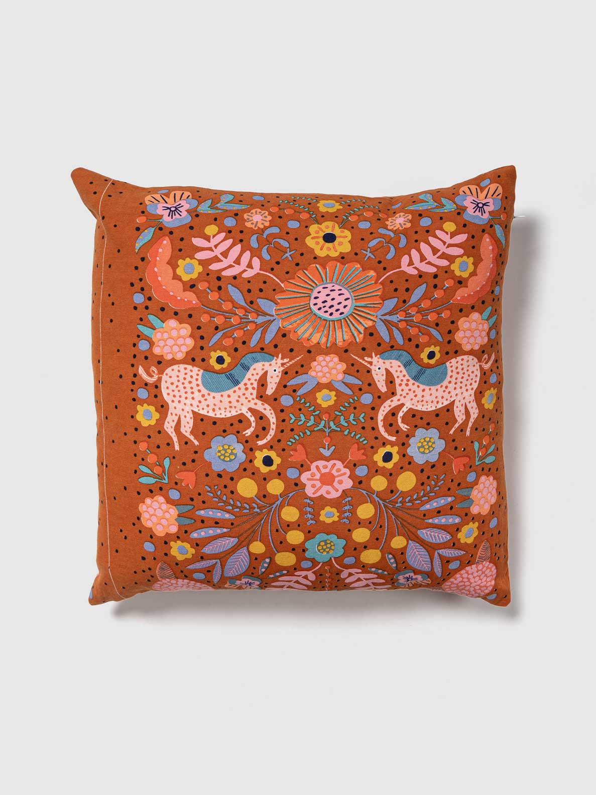 This Cushion Cover boasts a lively, whimsical design adorned with colorful mythical creatures and vibrant floral patterns set against a warm, rich orange background. The intricate artwork, featuring a playful blend of pink, blue, yellow, and green hues, infuses any space with a touch of fantasy and charm, making it an ideal choice for eclectic and bohemian home decor.