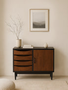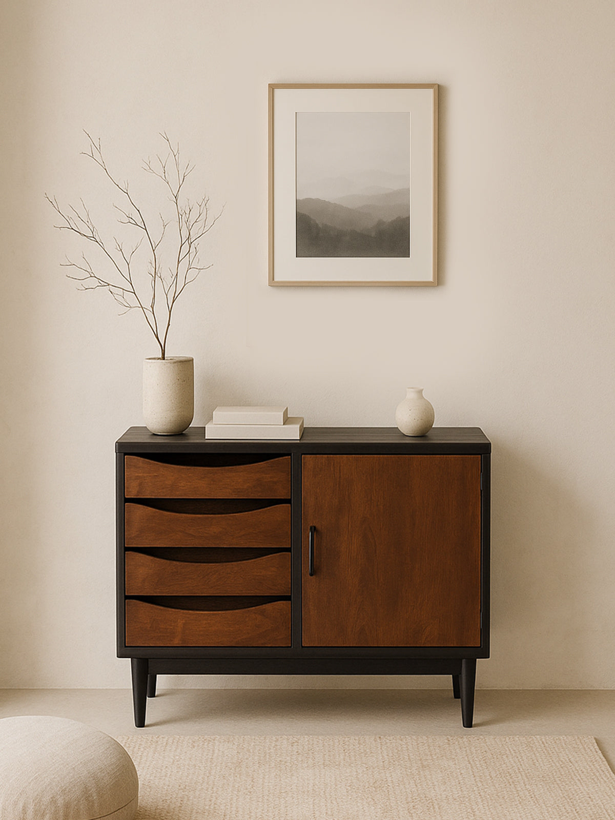 A mid-century modern design, characterized by its clean lines, minimalistic form, and functional elegance. The chest features a rich wood grain finish with darker edges, adding a touch of sophistication. The drawers have unique curved handles, blending seamlessly into the design while providing easy access.