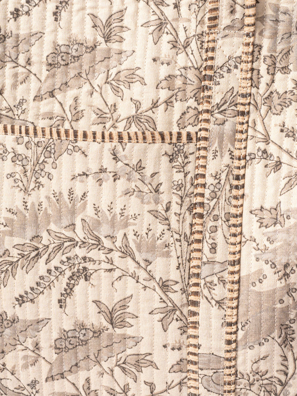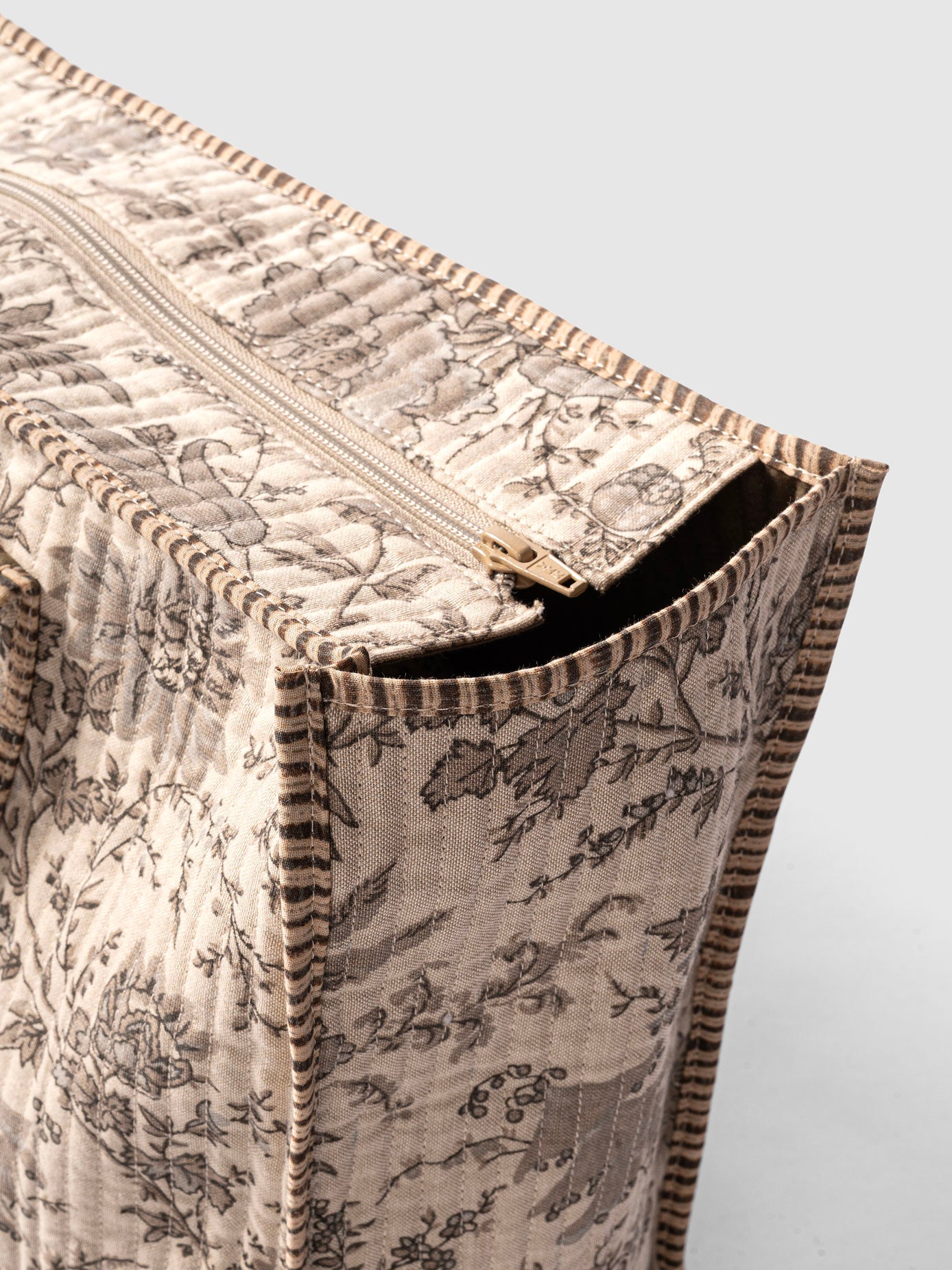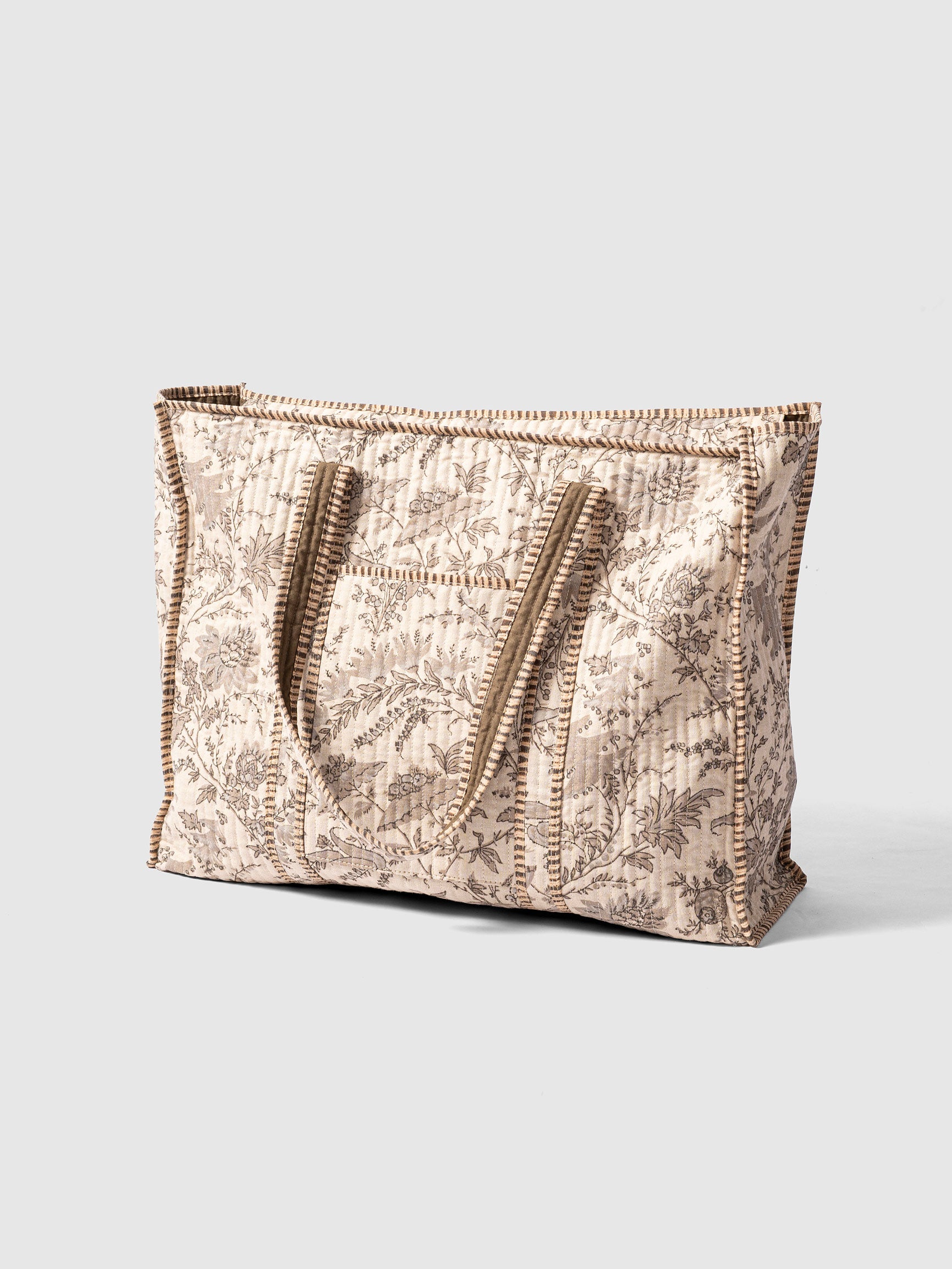 Gracefully detailed with French botanical prints, The Paris Edit Tote brings vintage charm into a contemporary silhouette. Crafted with precision quilting, it features contrast piping and thoughtfully stitched handles for an elevated finish. A discreet side pocket adds function to its elegant form, making it perfect for travel or daily use. Lightweight yet structured, this tote blends timeless European aesthetics with artisan softness — a sophisticated companion for days when style and utility go hand in hand.