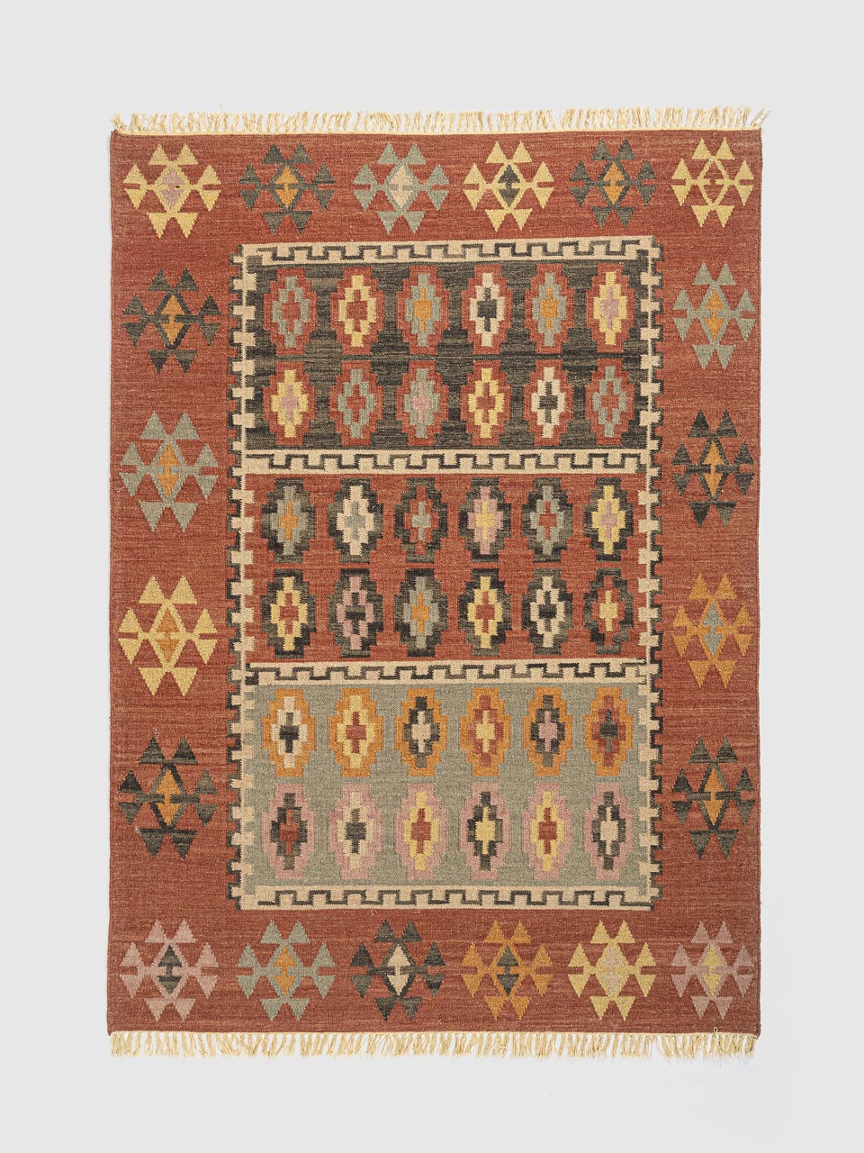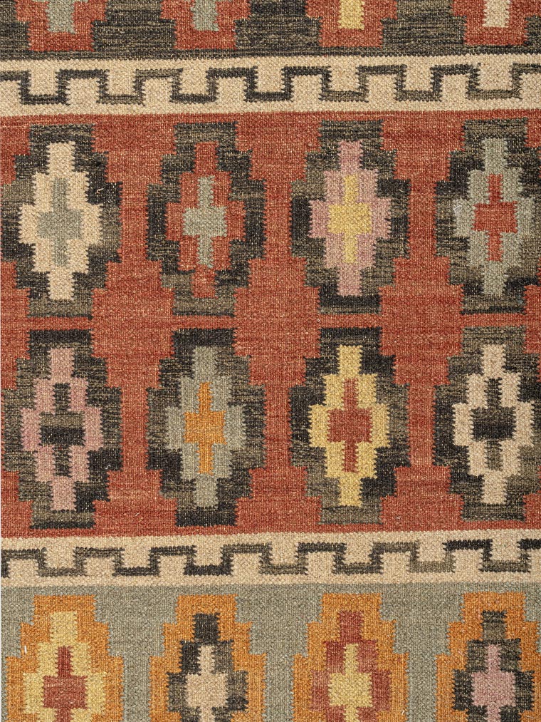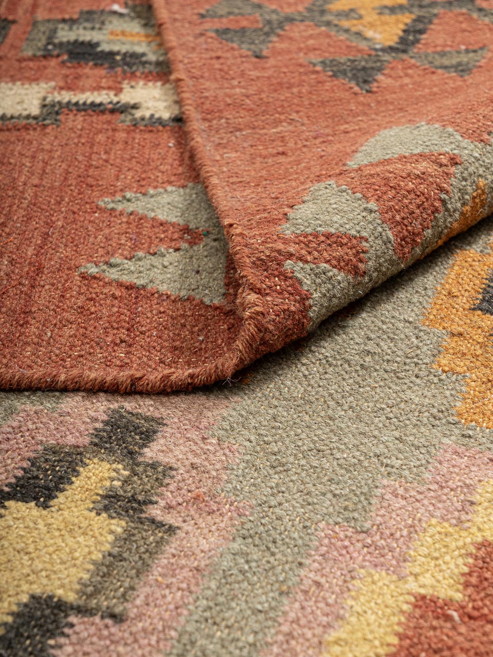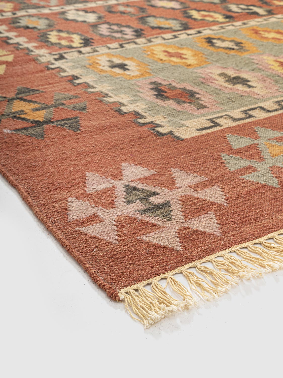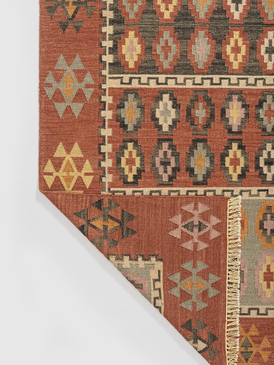 This vibrant jute kilim rug features traditional diamond motifs in earthy tones of terracotta, mustard, and sage. Handwoven with natural jute fibers, it adds rustic charm and texture to any space. Ideal for bohemian, eclectic, or tribal-inspired interiors.