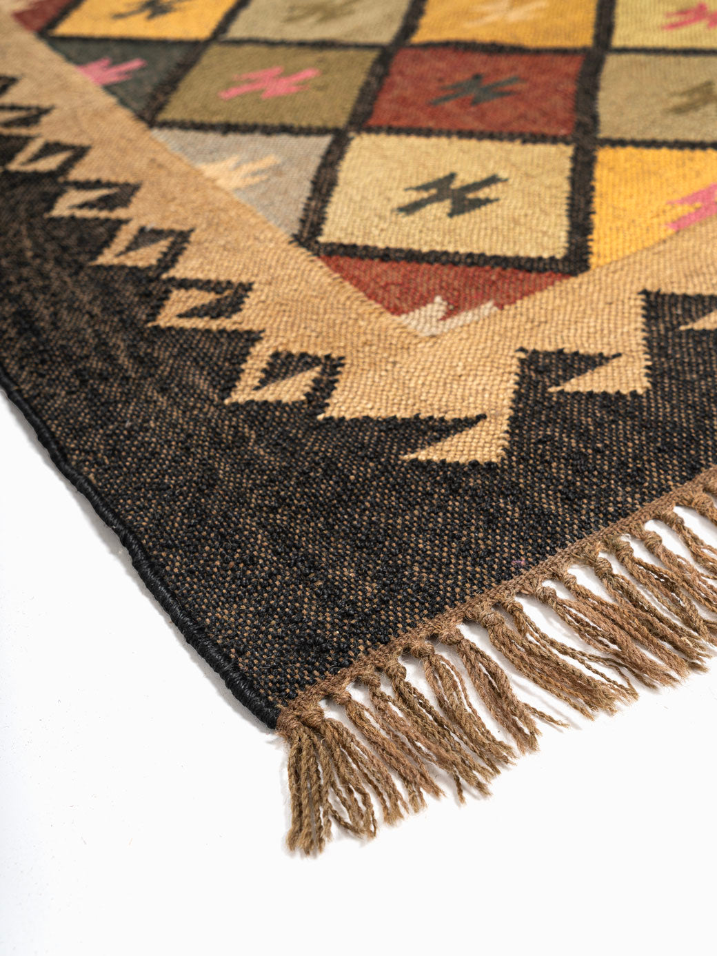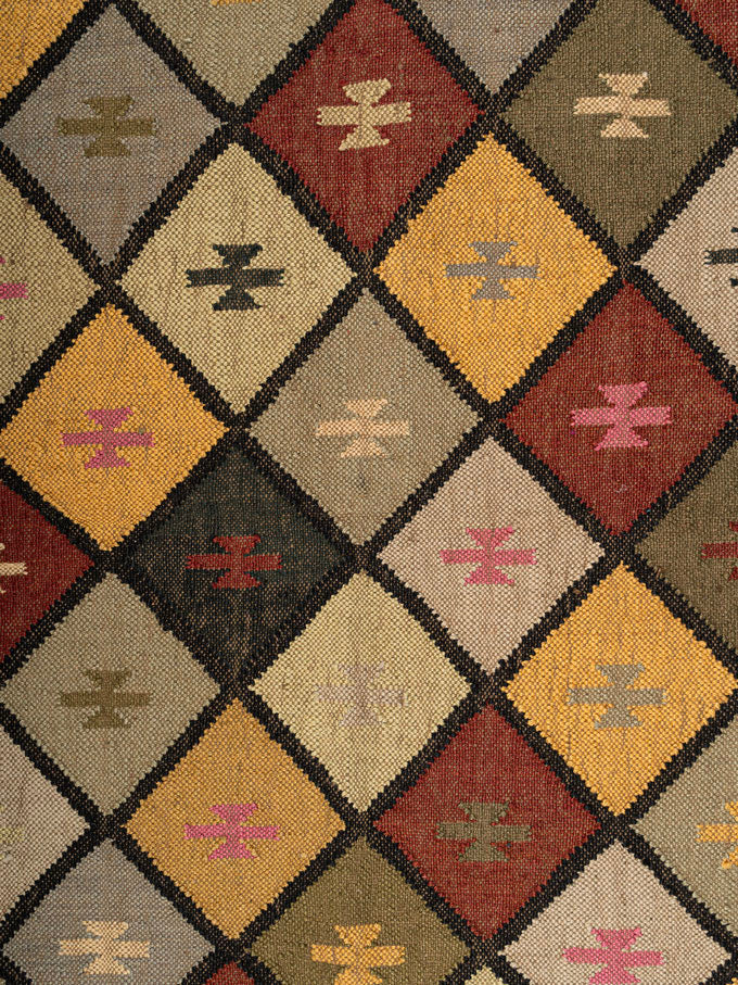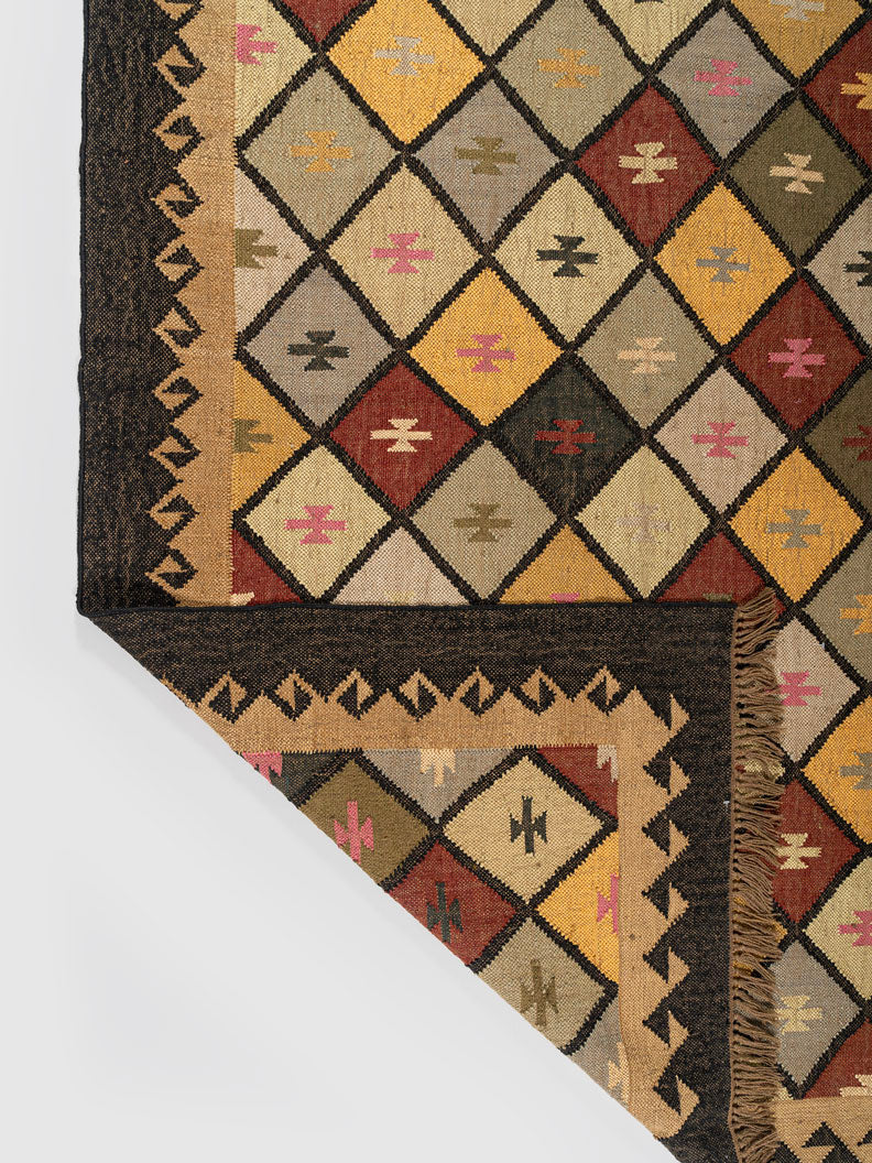 Pinsk Wool Rug showcases a vibrant diamond pattern in earthy reds, yellows, greens, and beiges, each diamond containing intricate geometric motifs. Bordered by a dark zigzag frame and finished with fringes on the shorter sides, it adds a traditional, cozy touch to any room.