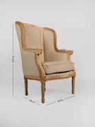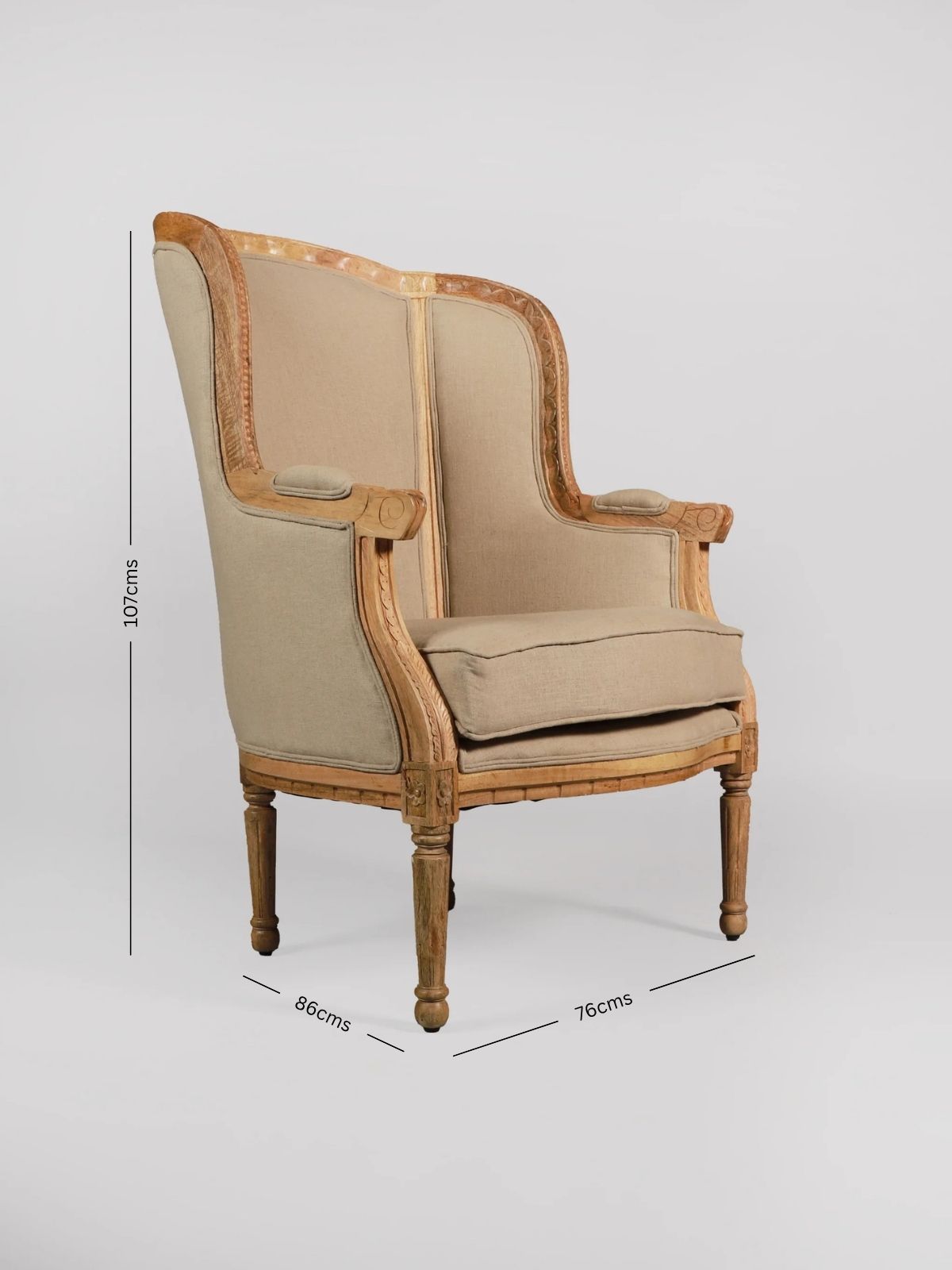 This elegant armchair combines timeless French-inspired design with modern comfort. Crafted with a beautifully carved wooden frame, it features a neutral beige upholstered seat and backrest that exude sophistication. The high back and cushioned seat provide exceptional support, making it perfect for both lounging and formal seating. A versatile piece that elevates living rooms, bedrooms, or reading corners with its refined charm and understated luxury.
