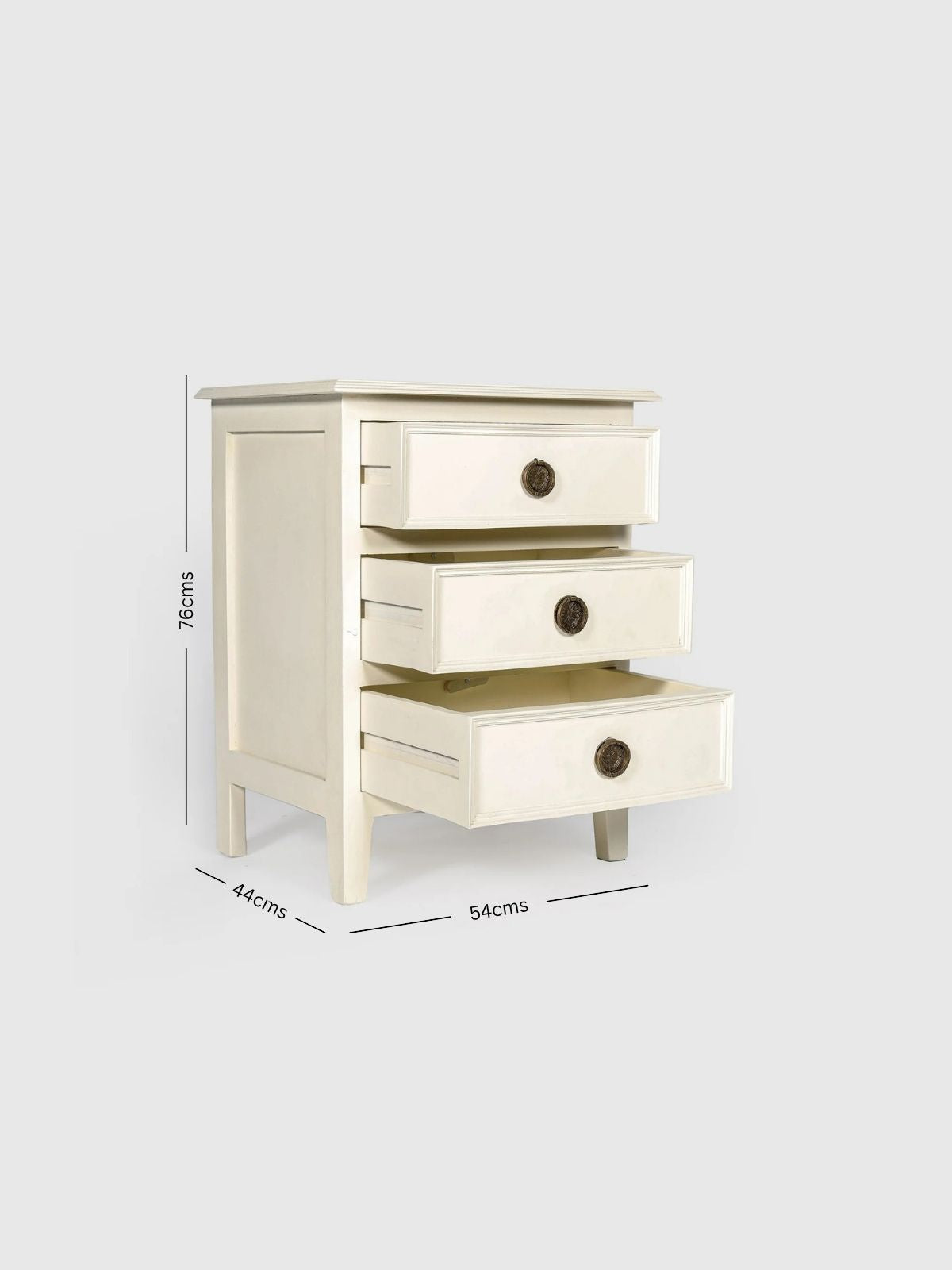 This elegant bedside table combines timeless design with practical functionality. Crafted in a refined ivory finish, it features three spacious drawers adorned with antique-style round brass handles for a touch of vintage charm. The clean lines and classic silhouette make it versatile for both modern and traditional interiors. Perfect for keeping essentials close at hand, this bedside adds sophistication, warmth, and lasting style to your bedroom décor.