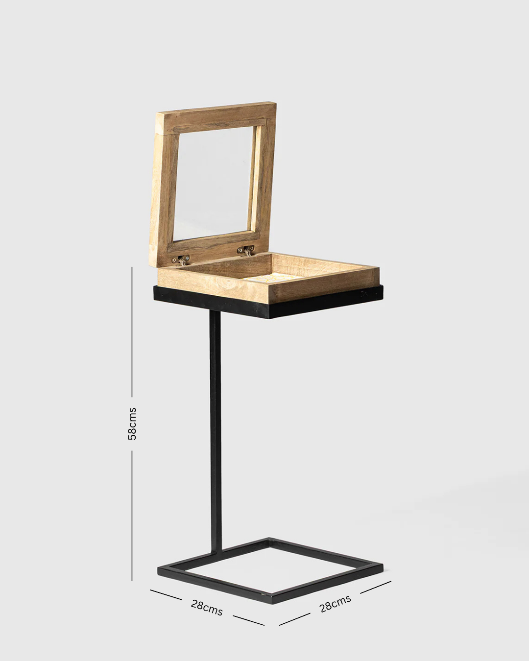 This minimalist wooden and metal vanity table features a lift-up lid with a glass and hidden storage compartment. Its sleek black iron frame adds an industrial touch, perfect for modern interiors. Ideal as a compact makeup table or bedside organizer, it's a stylish piece of contemporary wooden and metal furniture.