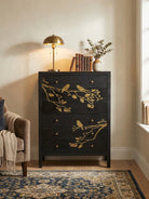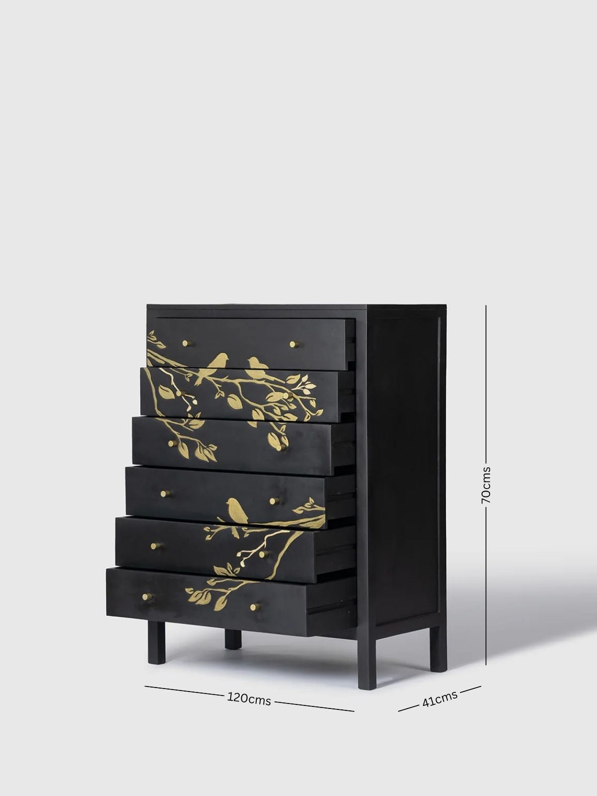 The Calido Wood Carved Chest of Drawers is a striking storage piece that blends artistic craftsmanship with functional design. Crafted from solid wood, the chest features beautifully carved panels with delicate botanical motifs that create a rich visual texture. The deep drawers provide generous storage for clothing, linens, and everyday essentials while maintaining an elegant appearance. With its bold finish and intricate detailing, the Calido chest of drawers makes a statement in bedrooms, living rooms, or entryways, adding character, warmth, and timeless sophistication to modern interiors.