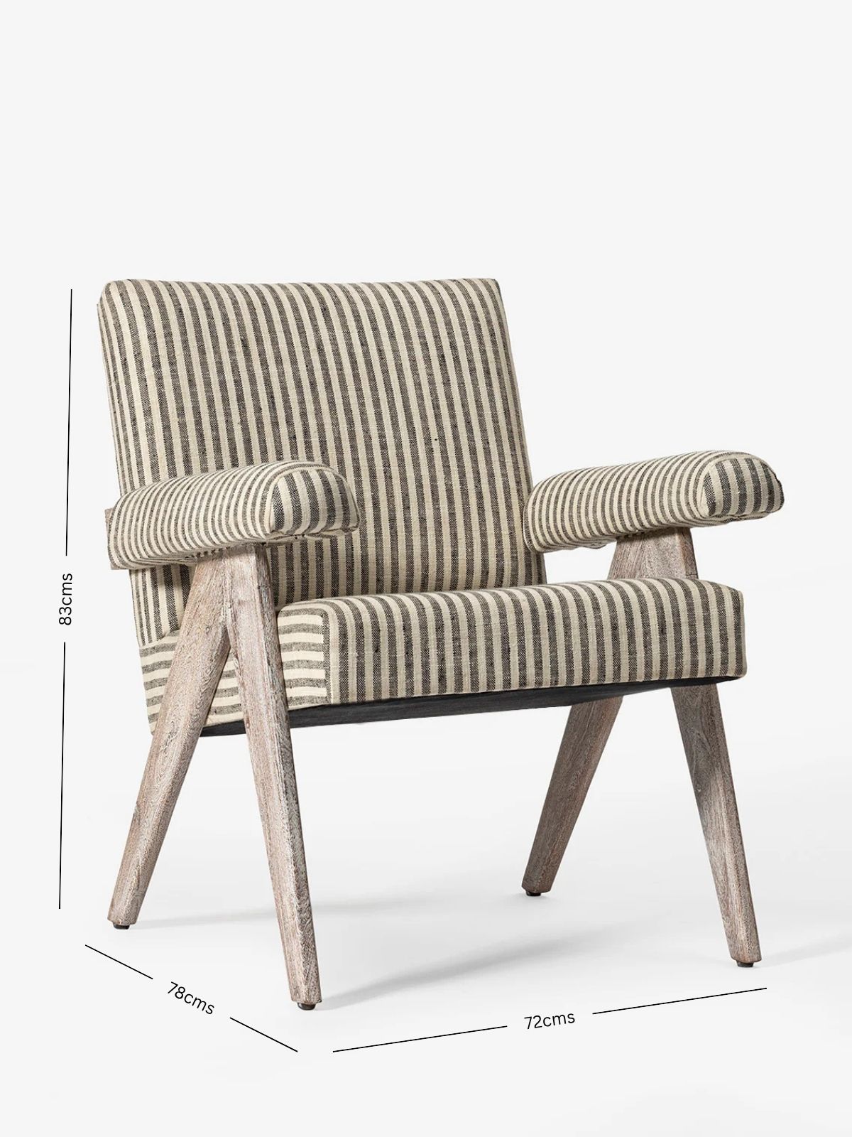Sink into comfort and style with our Loria Armchair. Minimal striped fabric envelops the chair, offering a rich look and luxurious feel. The unique beauty lies in the sandblasted wooden legs, where the natural wood grain takes center stage.