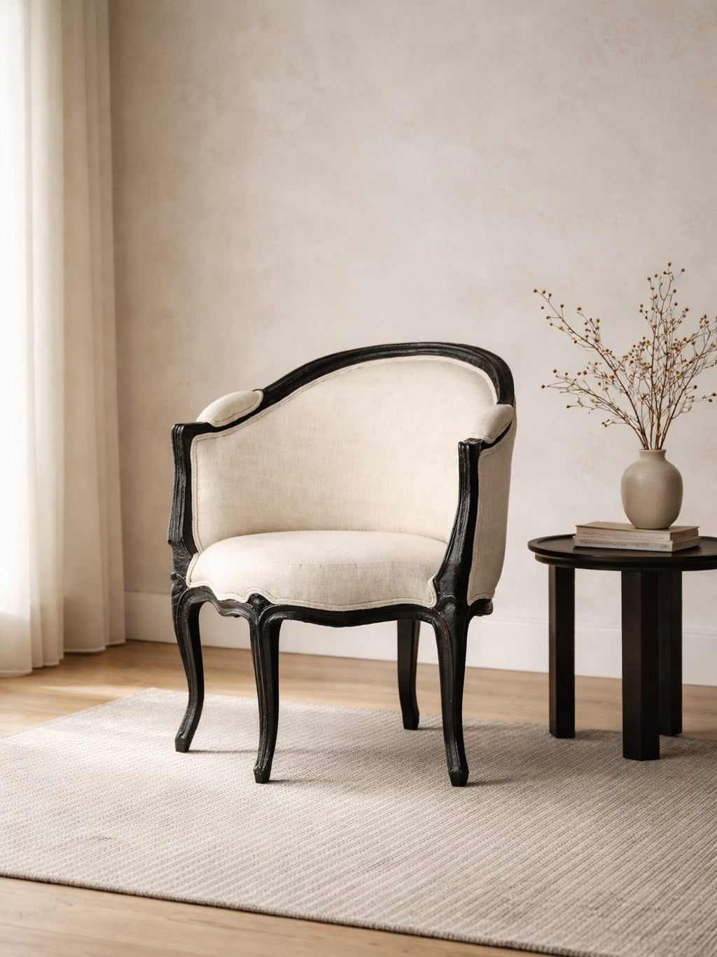 With its flowing wooden contours and refined upholstery, the Meraak Wooden Upholstered Armchair exudes timeless charm. The sculpted frame reflects careful craftsmanship, while the upholstered seat and back provide a sense of comfort and ease. Elegant yet understated, the chair integrates effortlessly into refined interiors, offering a seating experience that feels both luxurious and welcoming.