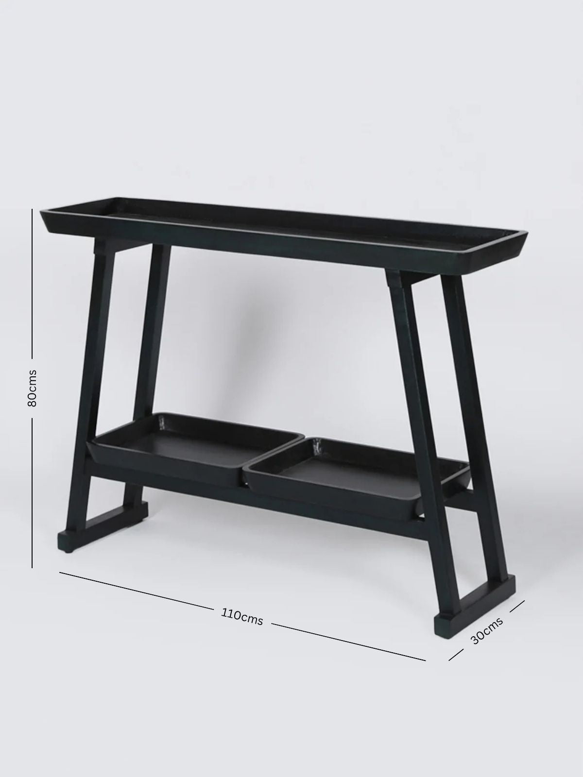 A sleek and functional addition to any space, this black wooden console table blends minimalist aesthetics with practical design. The elevated tray-style top offers a stylish surface for displaying décor, while the lower tier features two inset trays for additional storage. Its sturdy, angled legs provide stability and a modern edge, making it a perfect fit for entryways, living rooms, or dining areas.