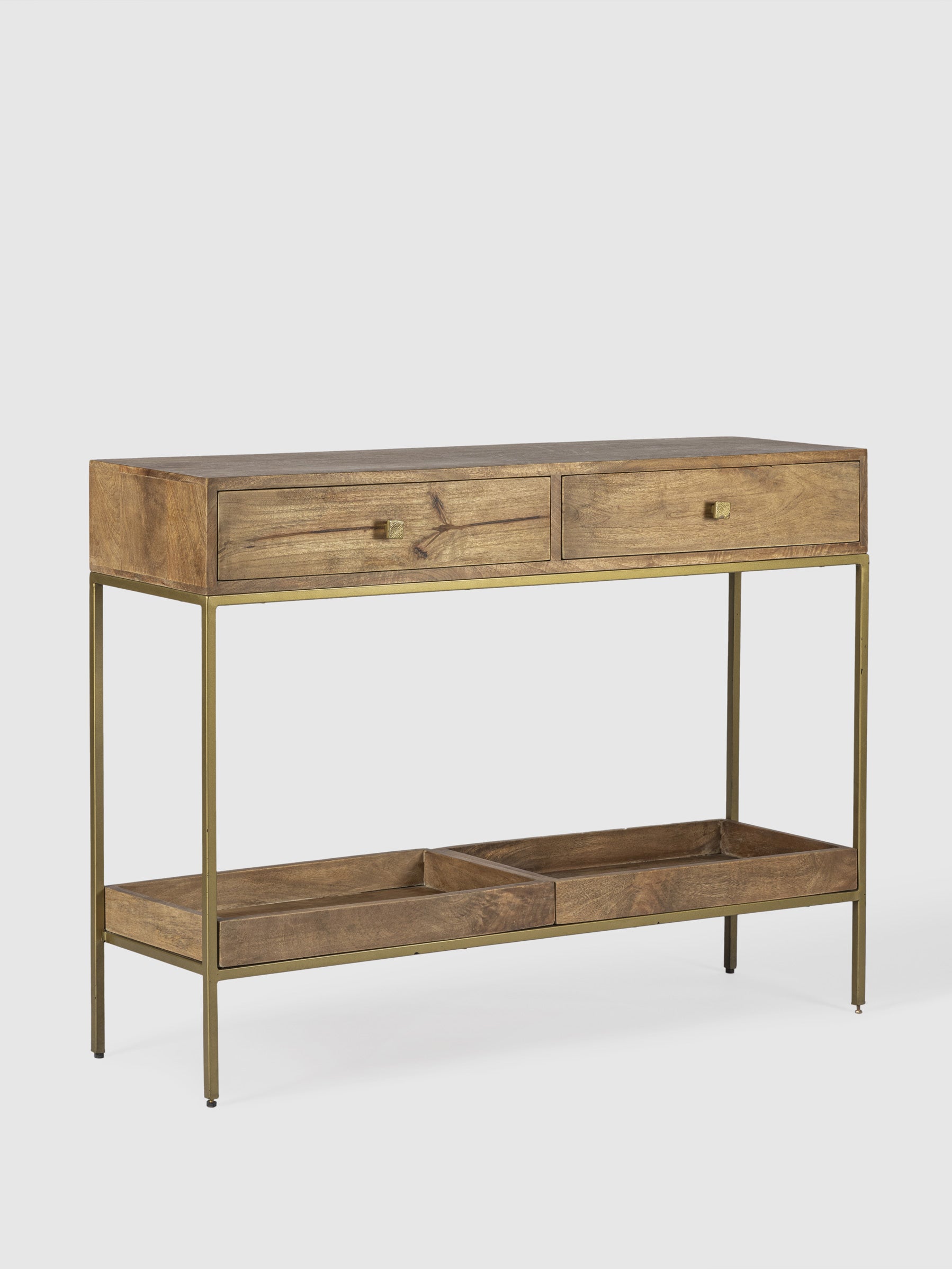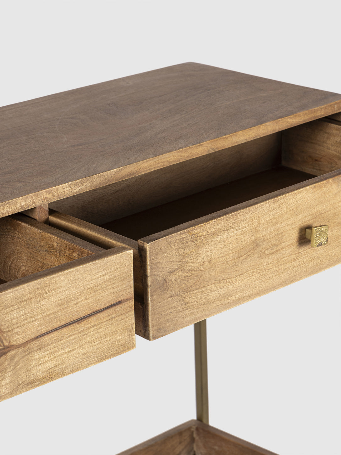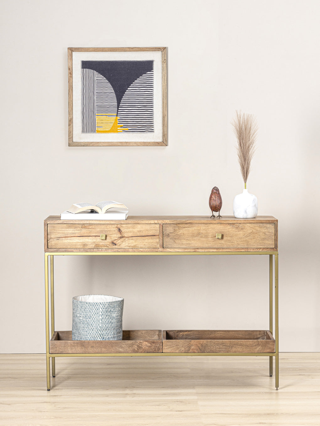 A fusion of modern minimalism and rustic charm, this handcrafted console table is designed to complement contemporary and industrial interiors. Made from solid wood with a natural finish, the table showcases clean lines and a sleek metal frame in an antique brass tone. Featuring two spacious drawers for concealed storage and a lower shelf with removable trays, this versatile piece is perfect for entryways, living rooms, or dining spaces. The subtle brass hardware adds a refined touch, making it a stylish yet functional addition to your home.