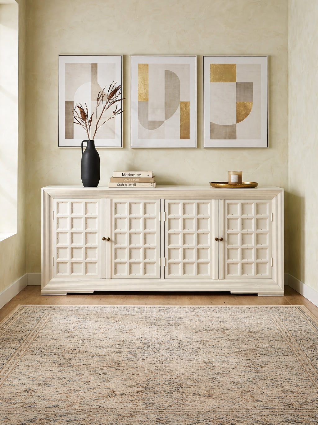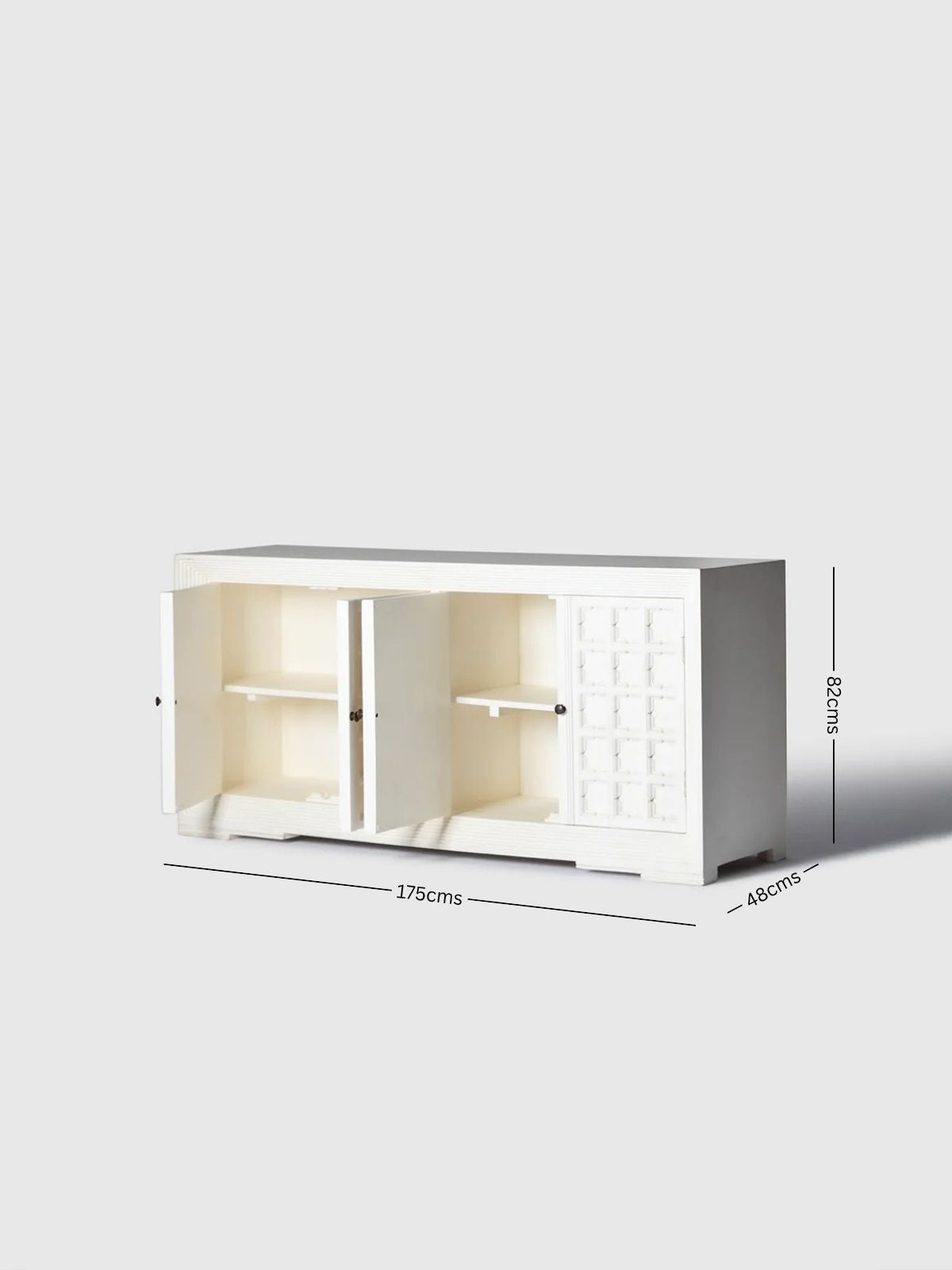 The Benki Wooden Carved Sideboard is a beautifully detailed storage piece that combines classic craftsmanship with modern elegance. Crafted from solid wood, the sideboard features intricately carved panel doors that add depth and texture to its clean, structured form. Behind the spacious cabinets lies ample storage for dinnerware, linens, and everyday essentials. The smooth tabletop offers additional space for décor or serving. Perfect for dining rooms, living areas, or entryways, the Benki sideboard brings refined artistry, functionality, and timeless charm to contemporary interiors.