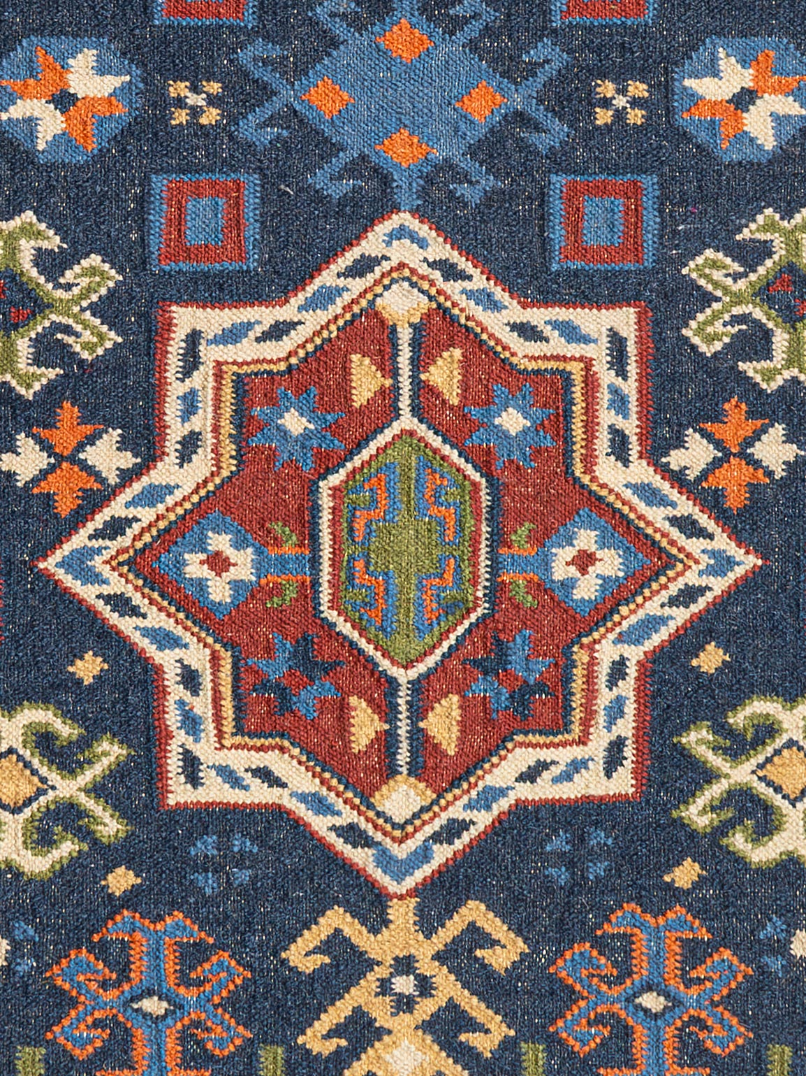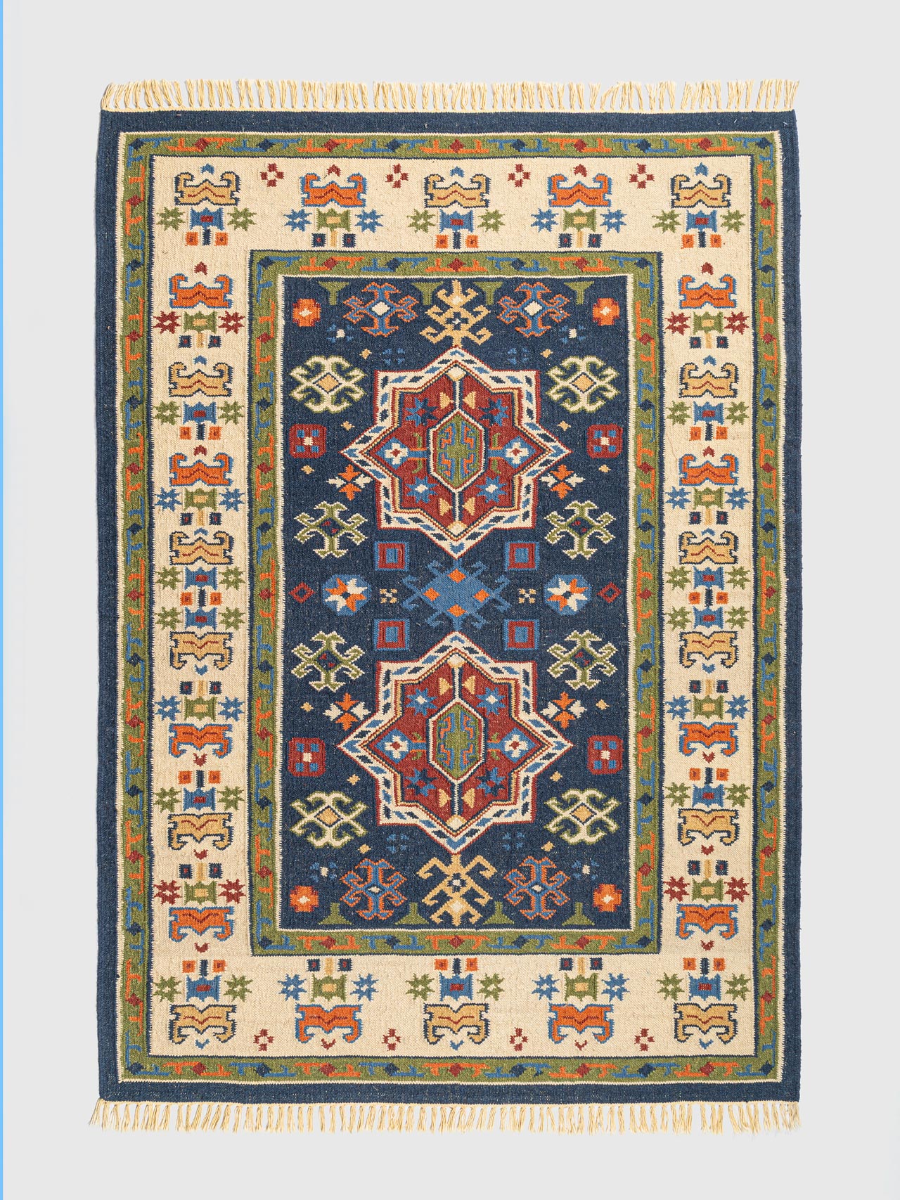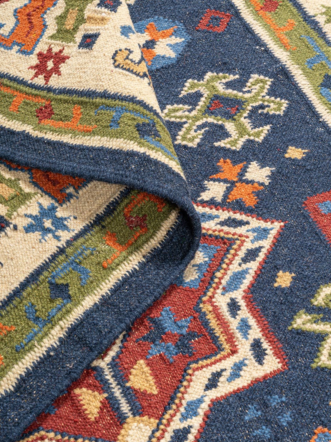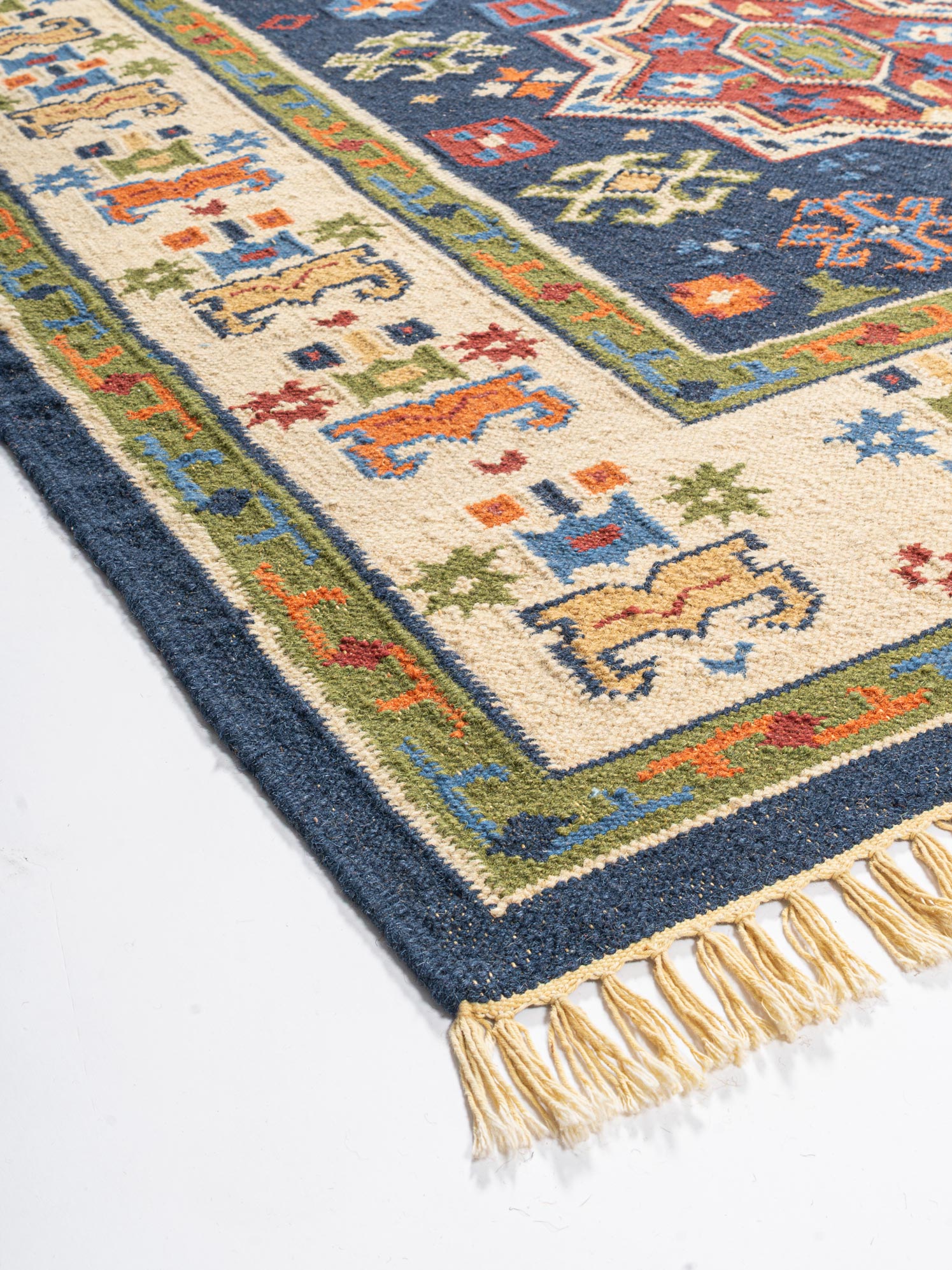 The Blue Monarch Rug captures royal elegance through its bold indigo backdrop, intricate medallion motifs, and rich red, gold, and green accents. Handwoven by skilled artisans, it offers exceptional durability and timeless style. A perfect centerpiece for living rooms, studies, or dining areas, bringing warmth, heritage, and a touch of majesty to your interiors