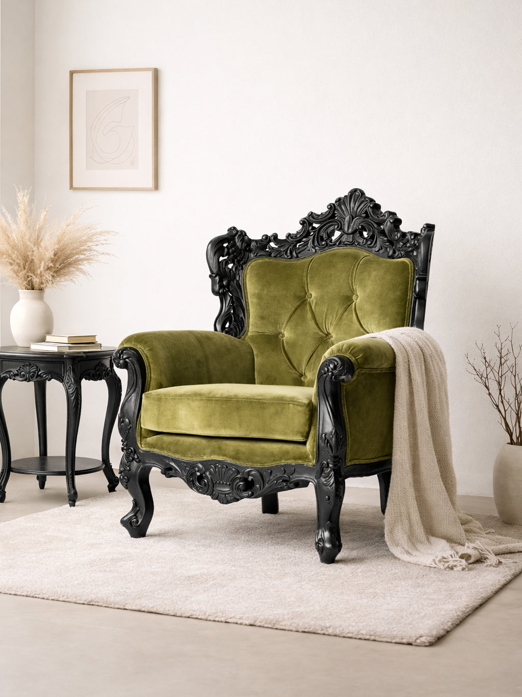 Rich in character and craftsmanship, the Cortasso Wood Carved Upholstered Armchair showcases the beauty of intricate wood carving and plush upholstery. The detailed frame, combined with a tufted back and comfortable seat, creates a chair that feels both luxurious and inviting. Its graceful form makes it a striking addition to living rooms, bedrooms, or lounge areas, offering a perfect blend of artistry and comfort.