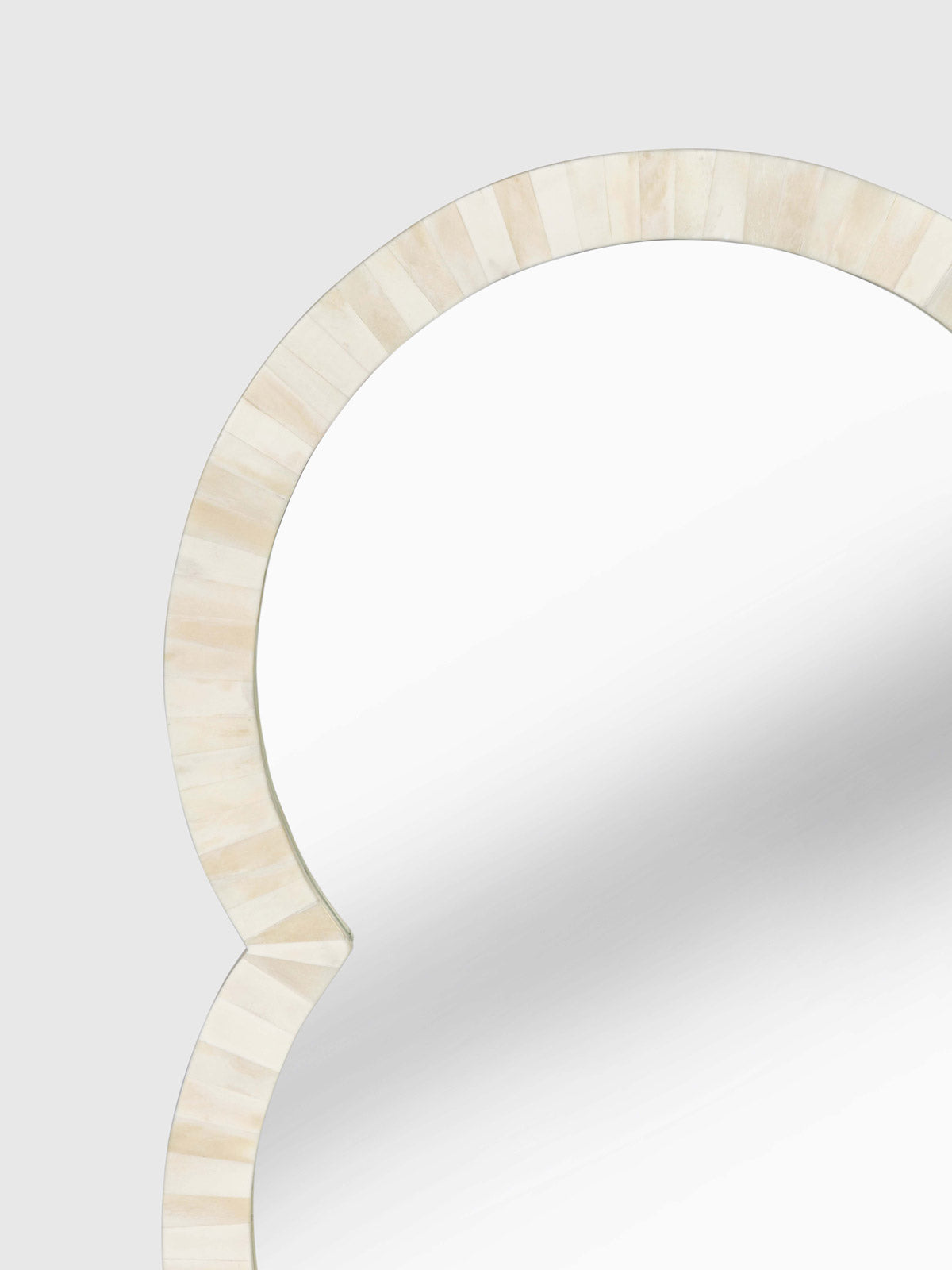 This quatrefoil bone inlay mirror brings timeless elegance to any room. Handcrafted with delicate bone inlay along its gently curved frame, the design balances artisanal tradition with a modern geometric form. Ideal for an entryway, bedroom, or living space, it adds light, depth, and a refined decorative accent to your home.