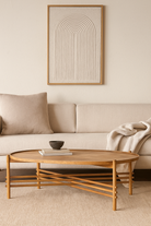 This oval coffee table brings a light, airy elegance to your home. The smooth wooden top pairs beautifully with the criss-cross base, creating a sculptural look that feels both modern and handcrafted. Its open, breezy design keeps your space feeling spacious, while the sturdy frame offers everyday practicality. A statement piece that blends style and ease, perfect for living rooms that value charm and comfort.